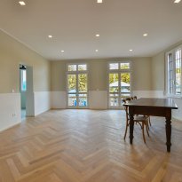 Im Erdgeschoss befindet sich ein geräumiges Wohnzimmer, das sowohl als Wohn- als auch als Esszimmer genutzt werden kann und einen doppelten Blick auf den See bietet. Angrenzend befindet sich die halboffene Küche. Auf dieser Etage befinden sich auch ein Arbeitszimmer und ein Bad mit Dusche.