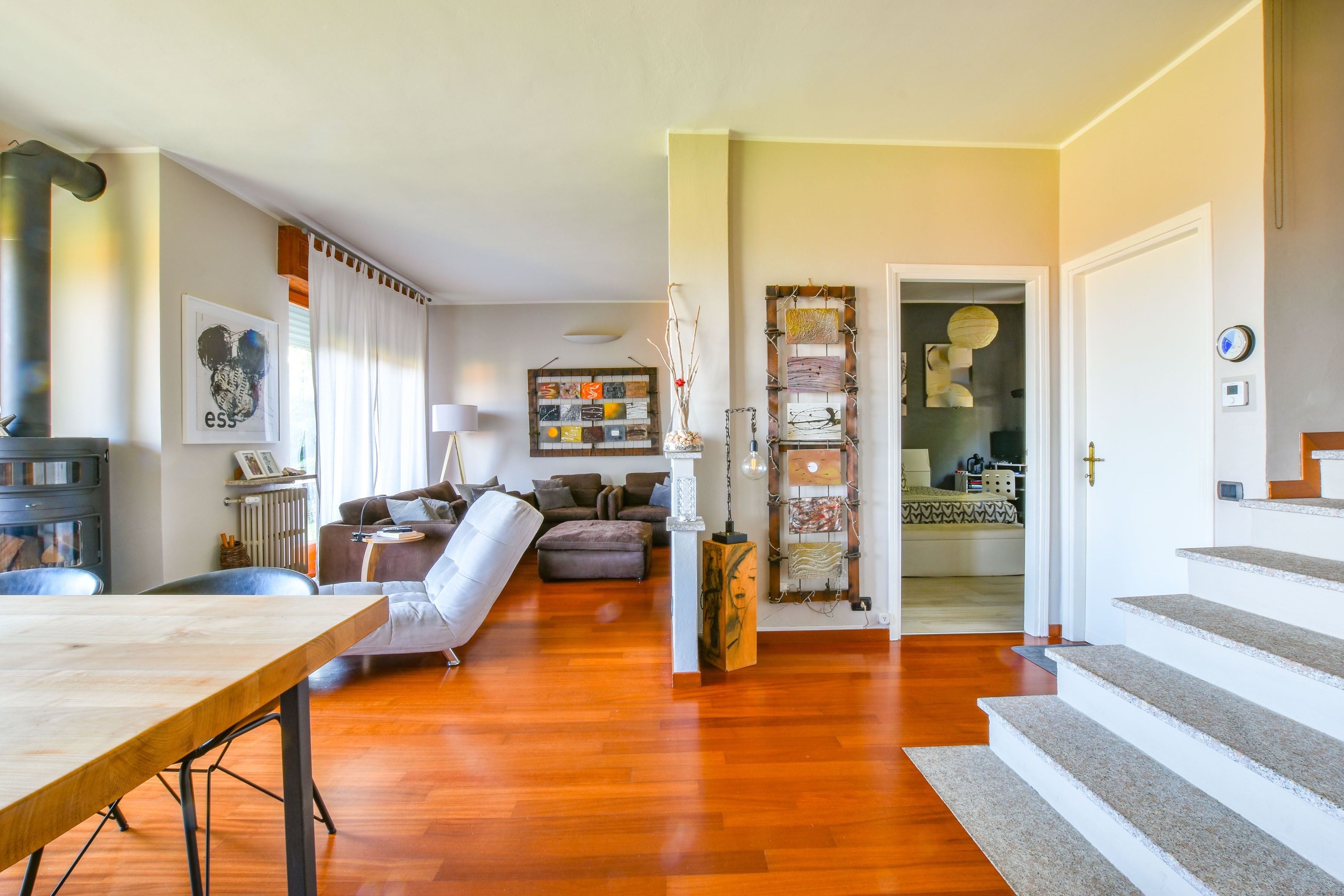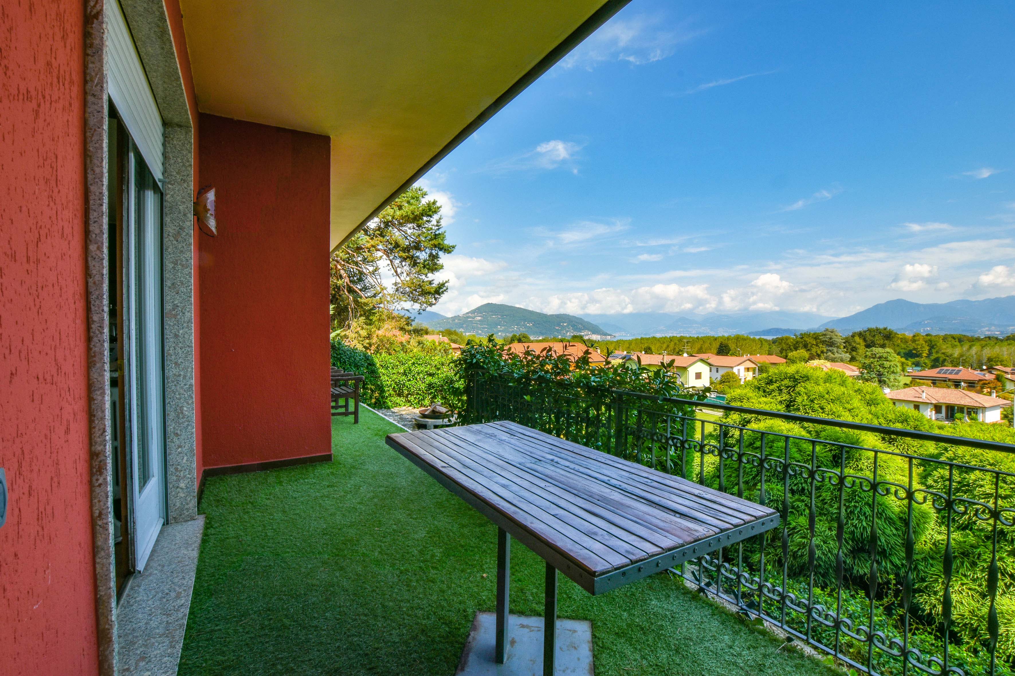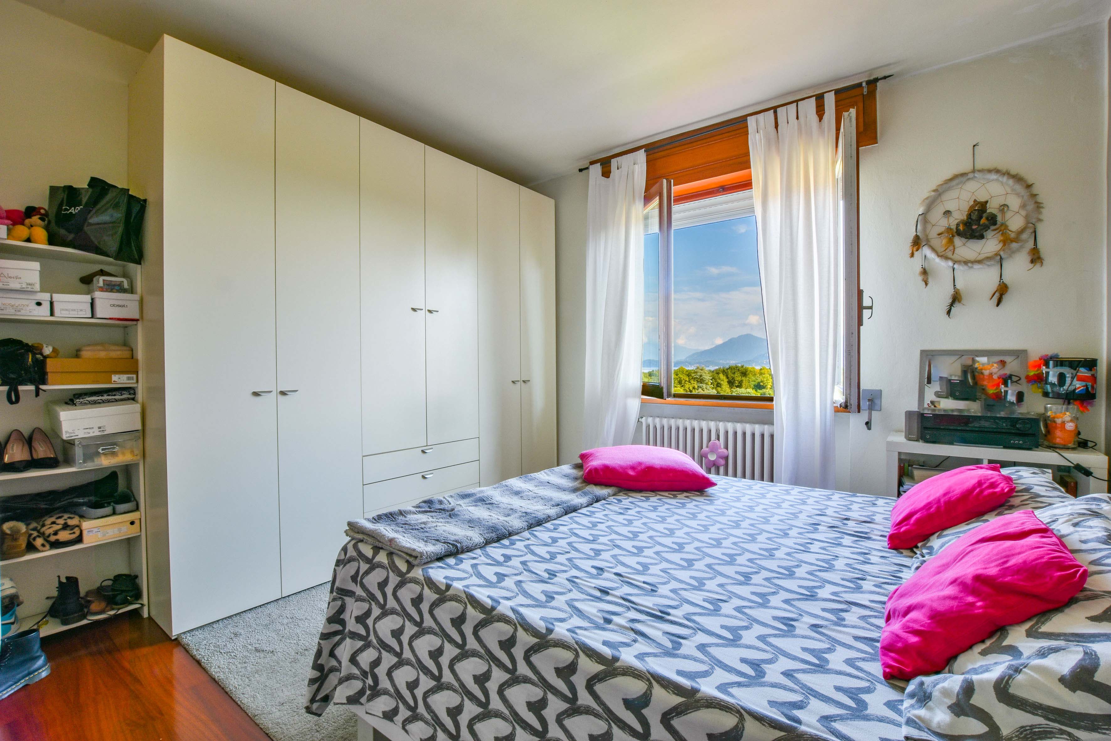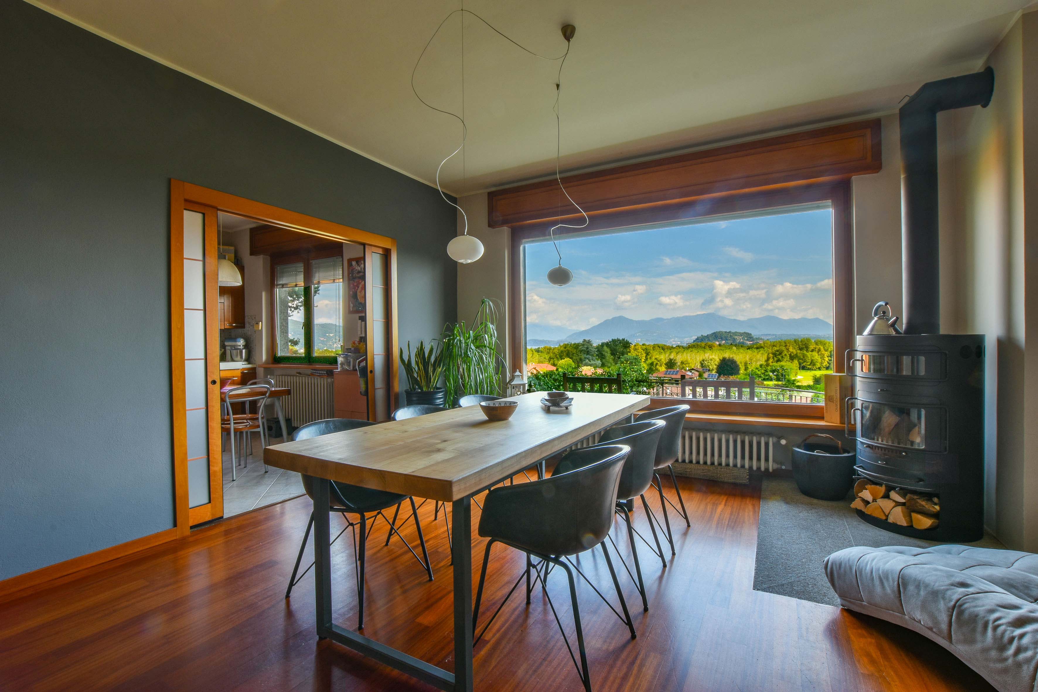 Im Erdgeschoss befindet sich eine separate Wohnküche, die durch elegante Schiebetüren abgetrennt ist. Außerdem gibt es ein geräumiges Wohnzimmer mit Ess- und Sitzecke, das durch einen Holzofen bereichert wird - ein idealer Ort zum Beisammensein und Entspannen, der durch das natürliche Tageslicht, das durch die großen Fenster einfällt, erhellt wird. Von hier aus hat man Zugang zum Balkon, der einen spektakulären Blick auf den Lago Maggiore und die umliegende Landschaft bietet. Die Etage wird durch ein Schlafzimmer mit Doppelbett und Blick auf den hinteren Garten sowie ein Badezimmer vervollständigt.