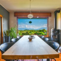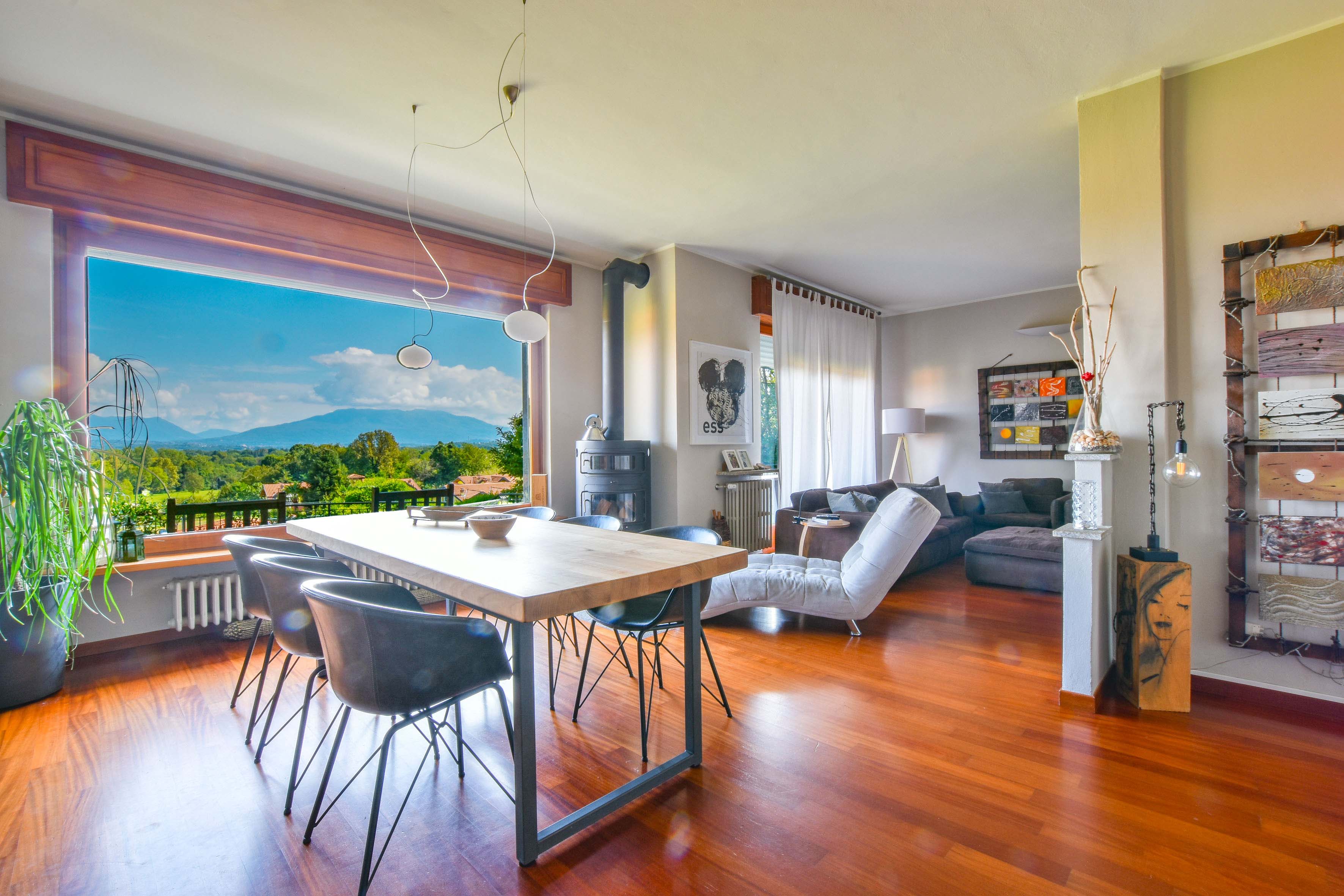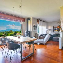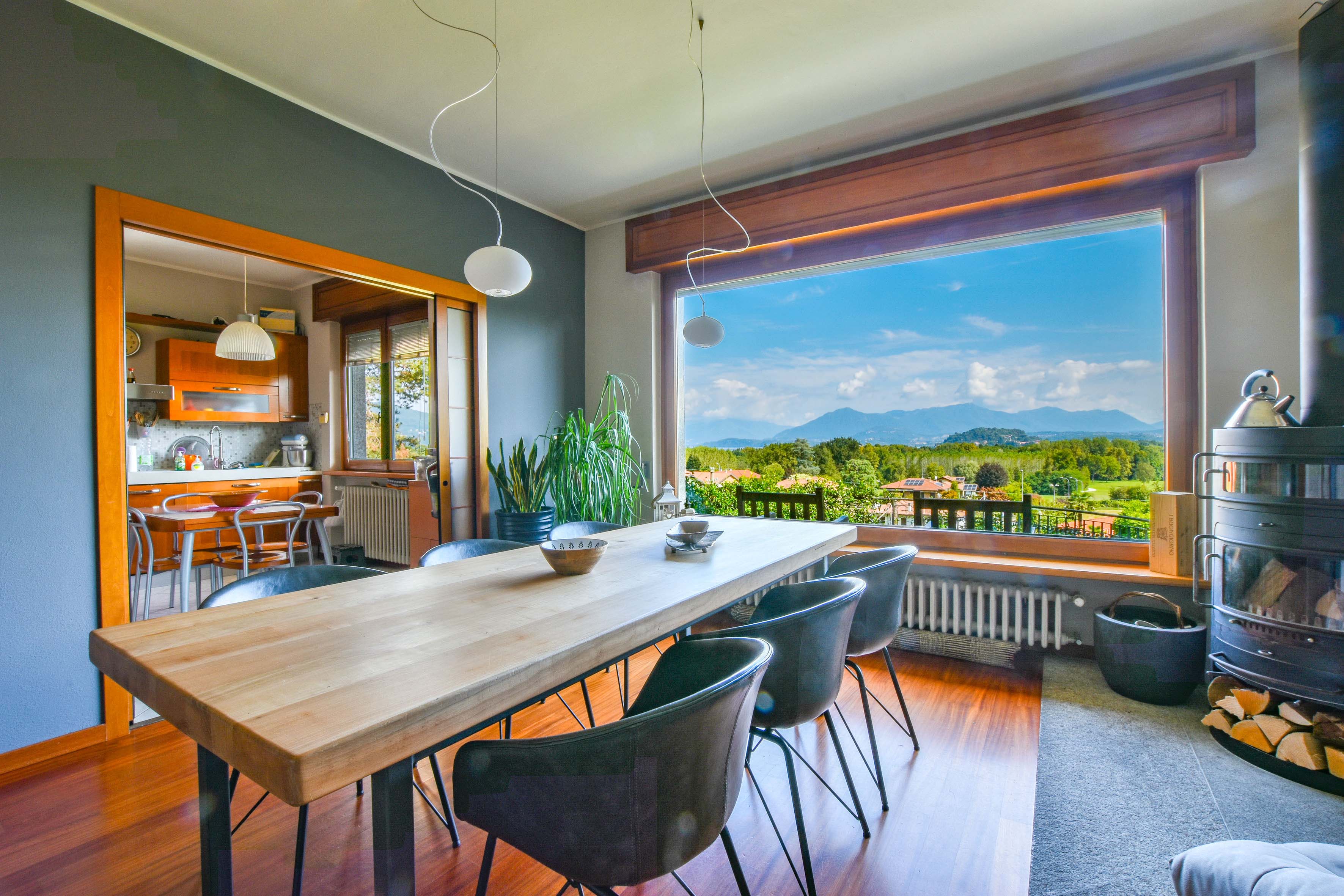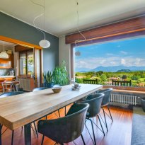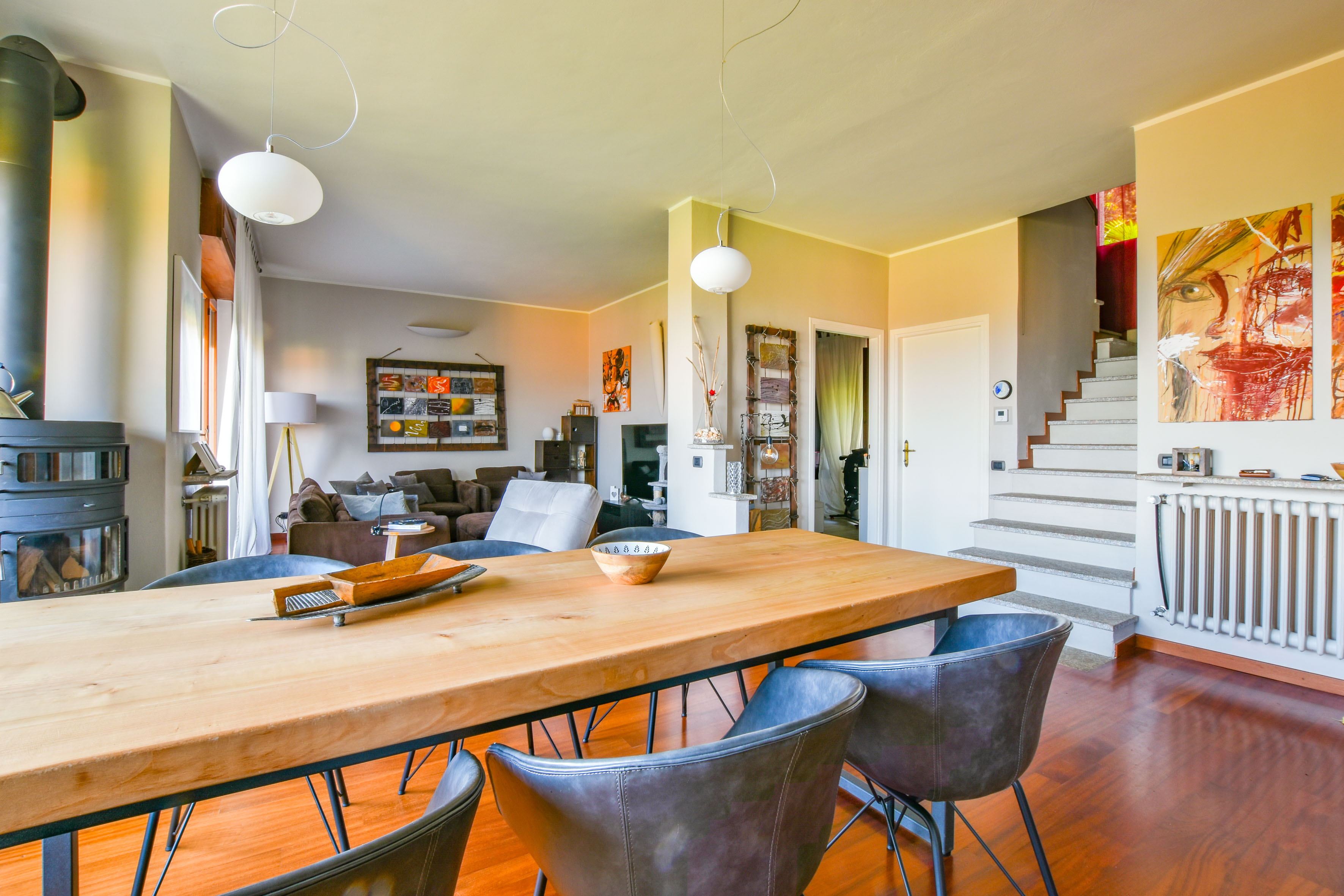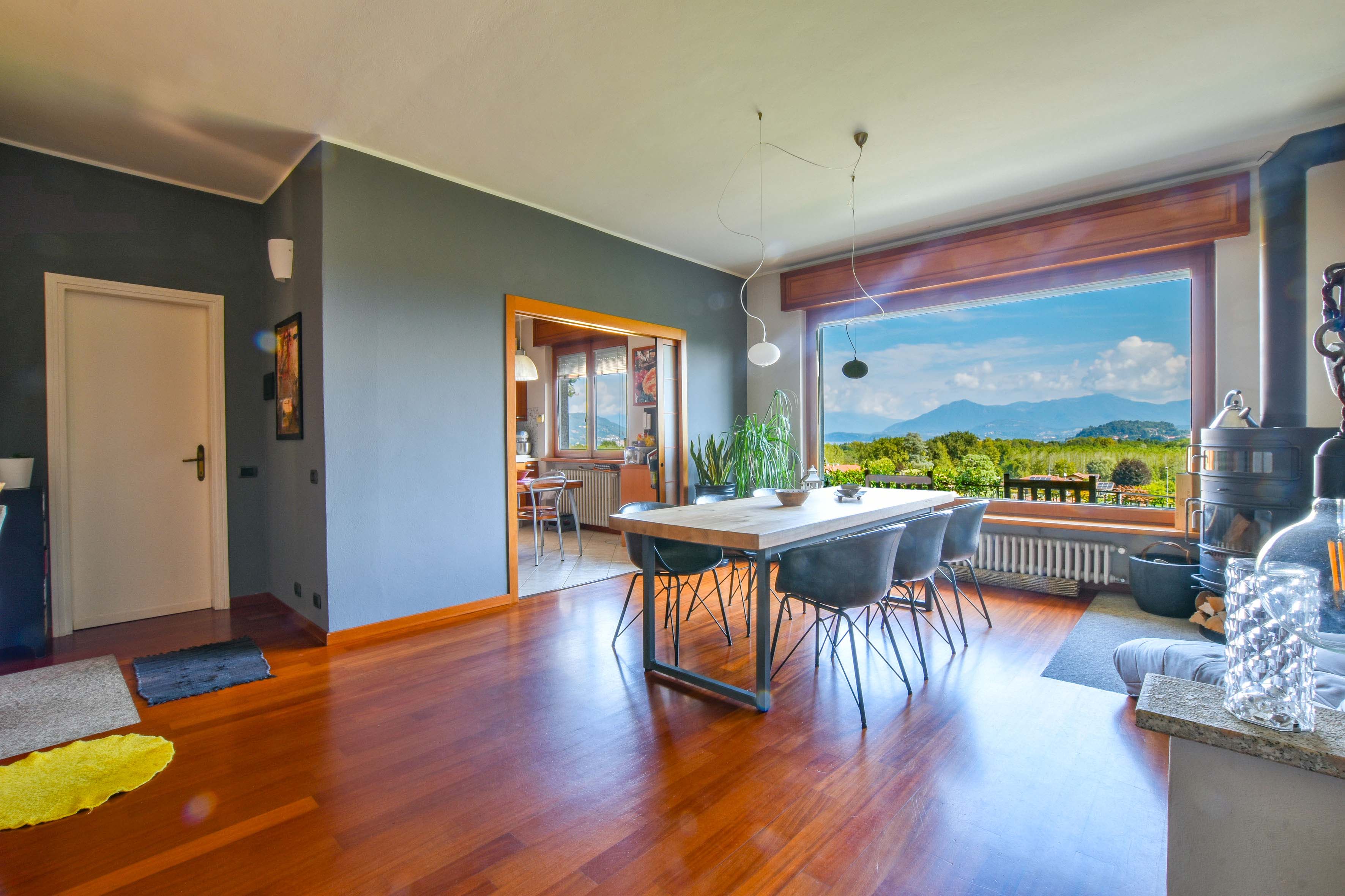 Im Erdgeschoss befindet sich eine separate Wohnküche, die durch elegante Schiebetüren abgetrennt ist. Außerdem gibt es ein geräumiges Wohnzimmer mit Ess- und Sitzecke, das durch einen Holzofen bereichert wird - ein idealer Ort zum Beisammensein und Entspannen, der durch das natürliche Tageslicht, das durch die großen Fenster einfällt, erhellt wird. Von hier aus hat man Zugang zum Balkon, der einen spektakulären Blick auf den Lago Maggiore und die umliegende Landschaft bietet. Die Etage wird durch ein Schlafzimmer mit Doppelbett und Blick auf den hinteren Garten sowie ein Badezimmer vervollständigt.