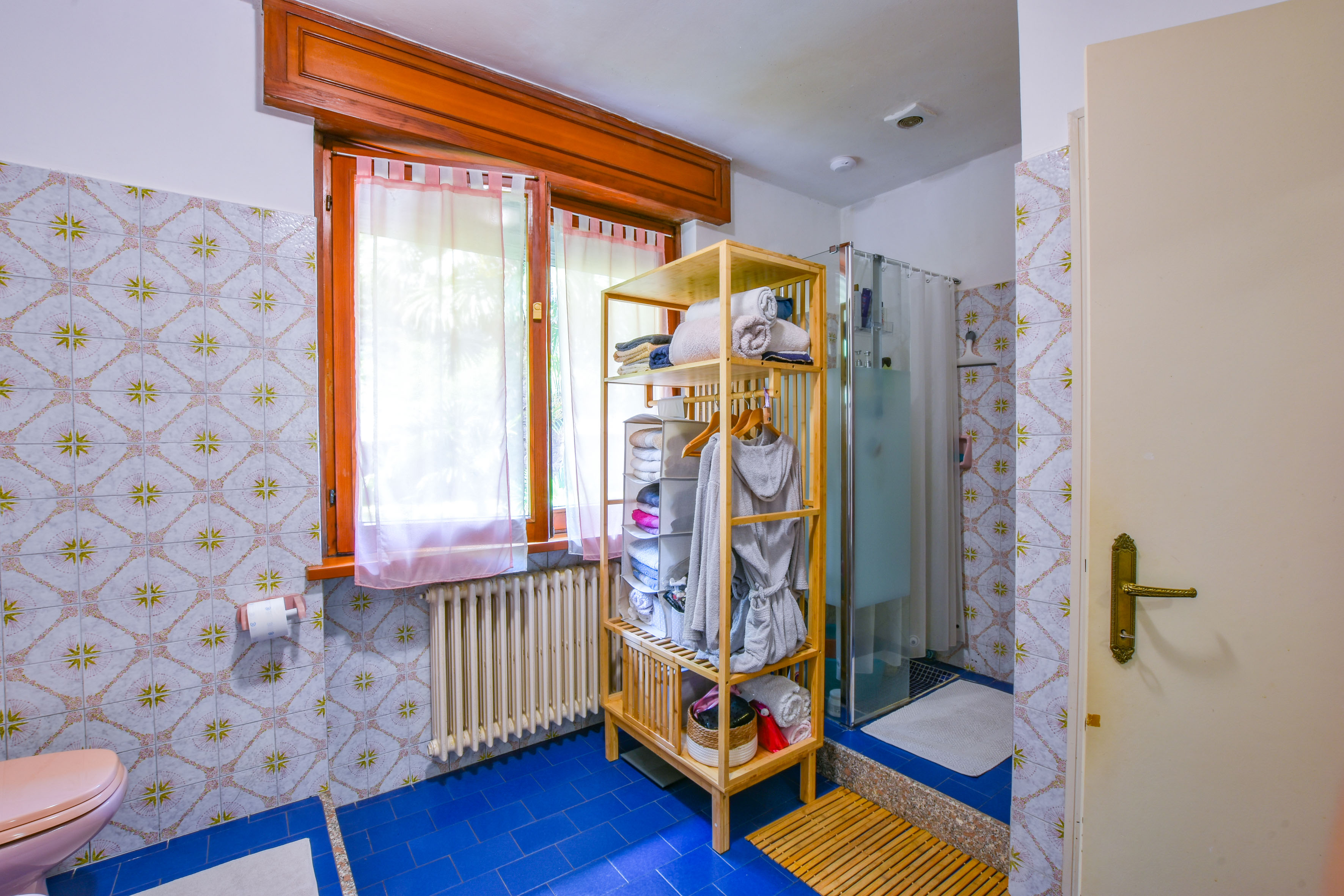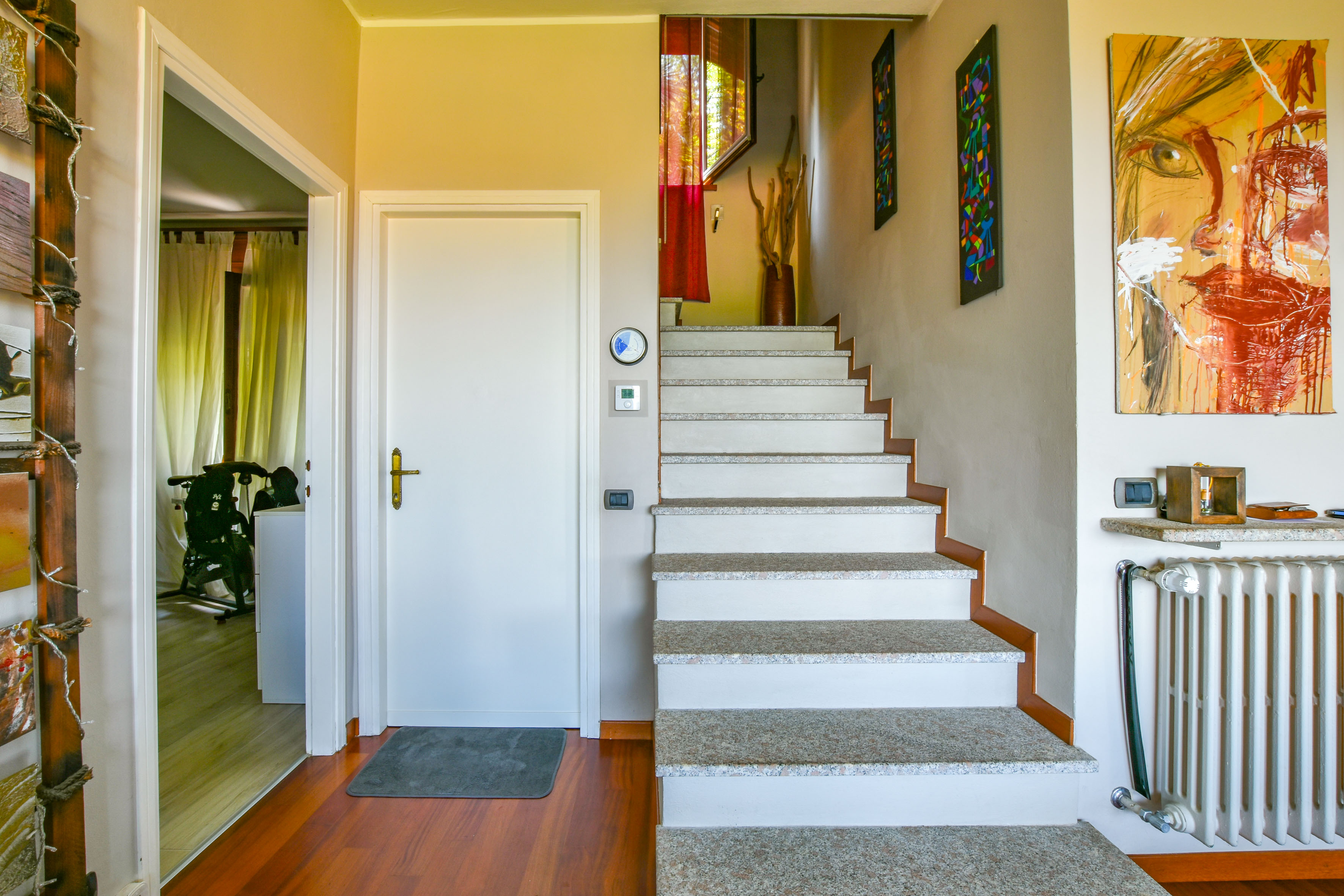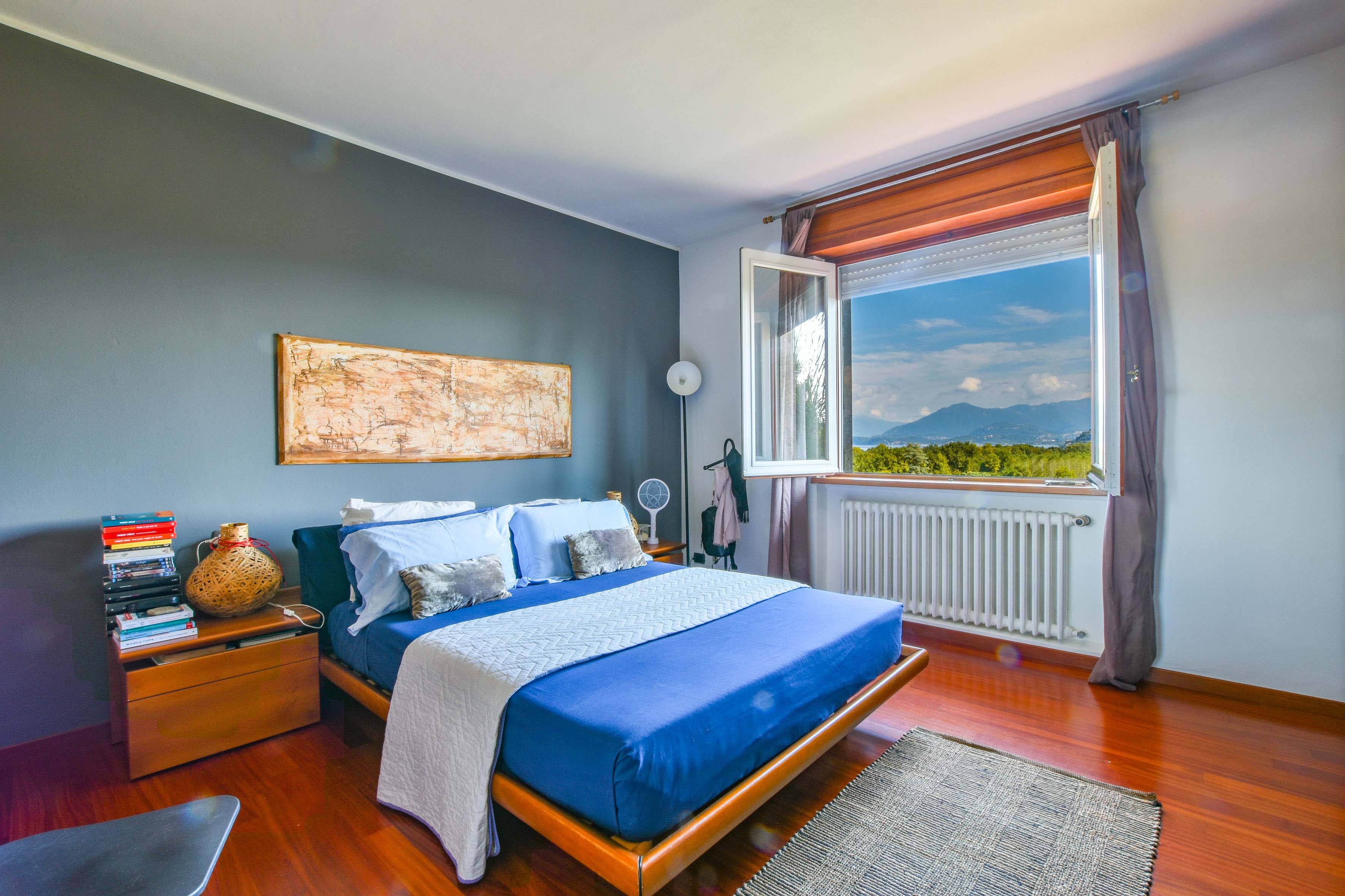 Eine Marmortreppe führt in den ersten Stock, wo sich zwei geräumige Schlafzimmer mit Holzböden befinden, beide mit Blick auf den See und die Berge. Das Hauptbadezimmer auf dieser Etage ist mit einer Badewanne und einer Dusche ausgestattet. Von hier aus gibt es auch einen Zugang zu einem praktischen Dachboden.