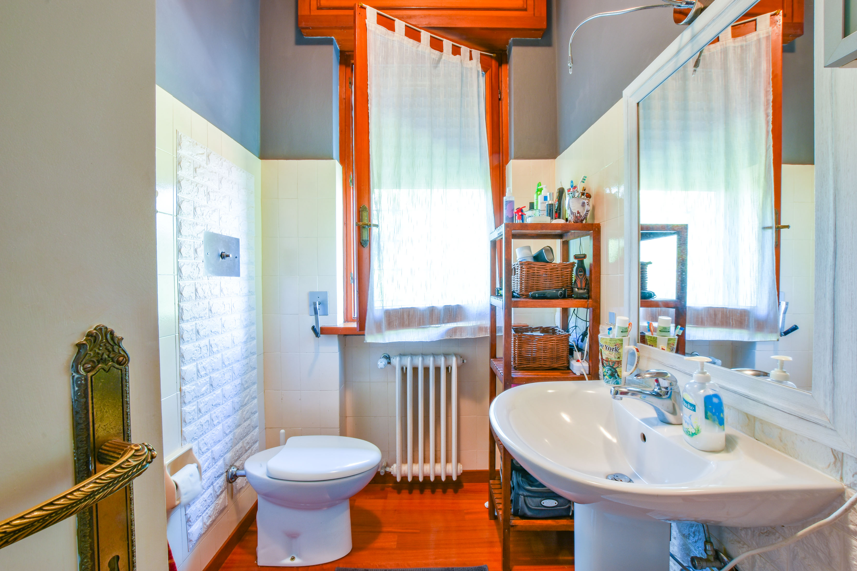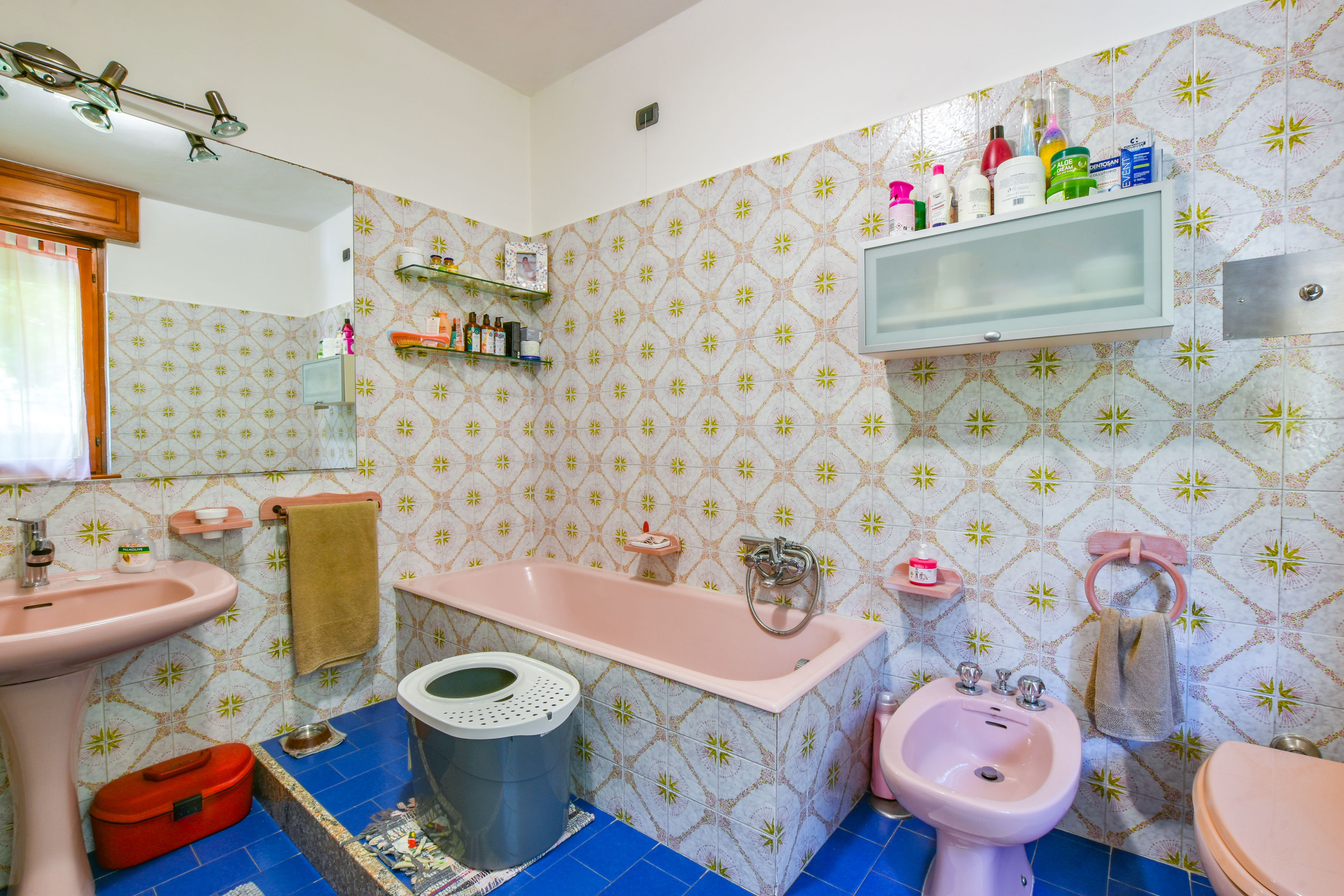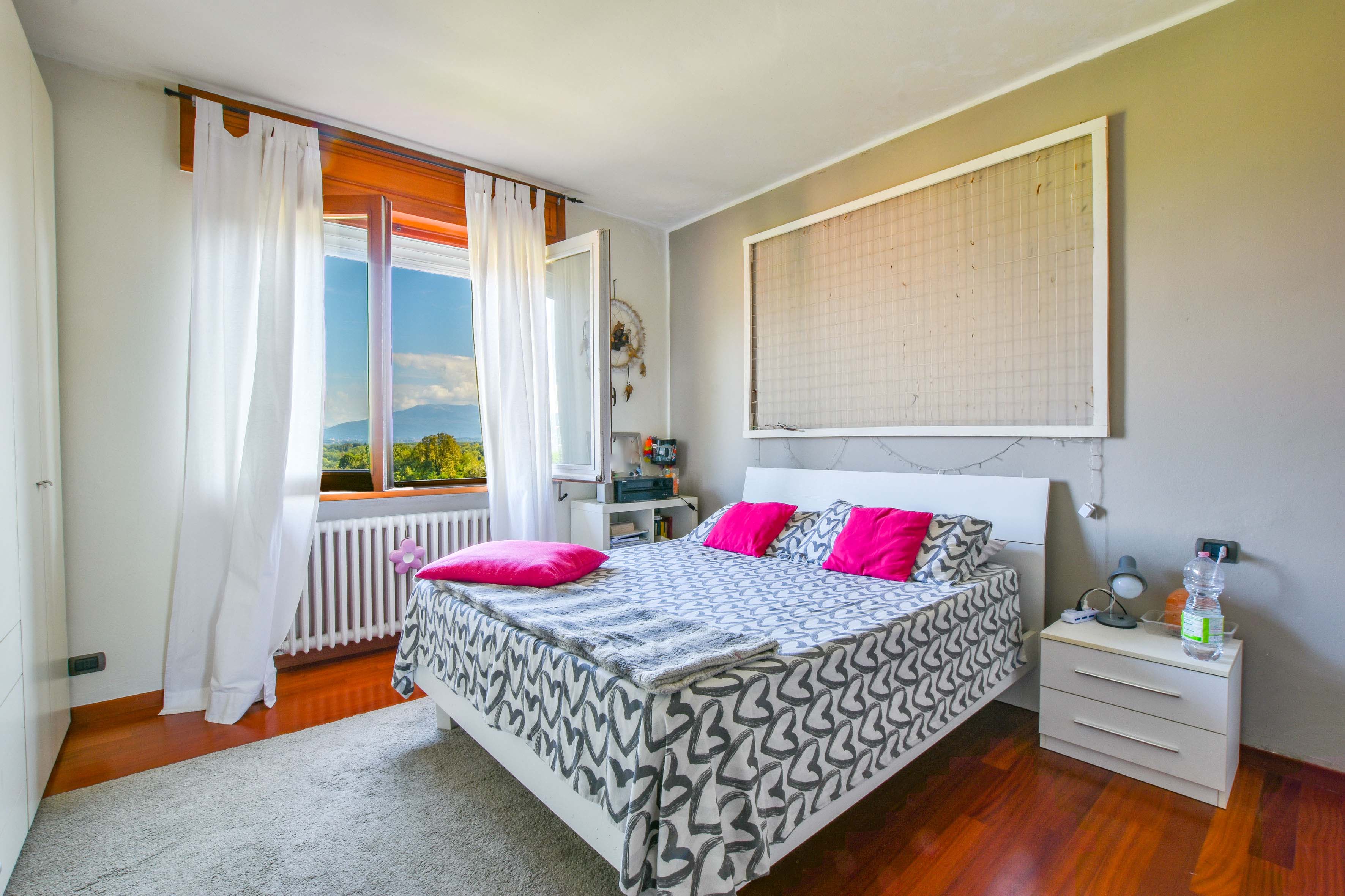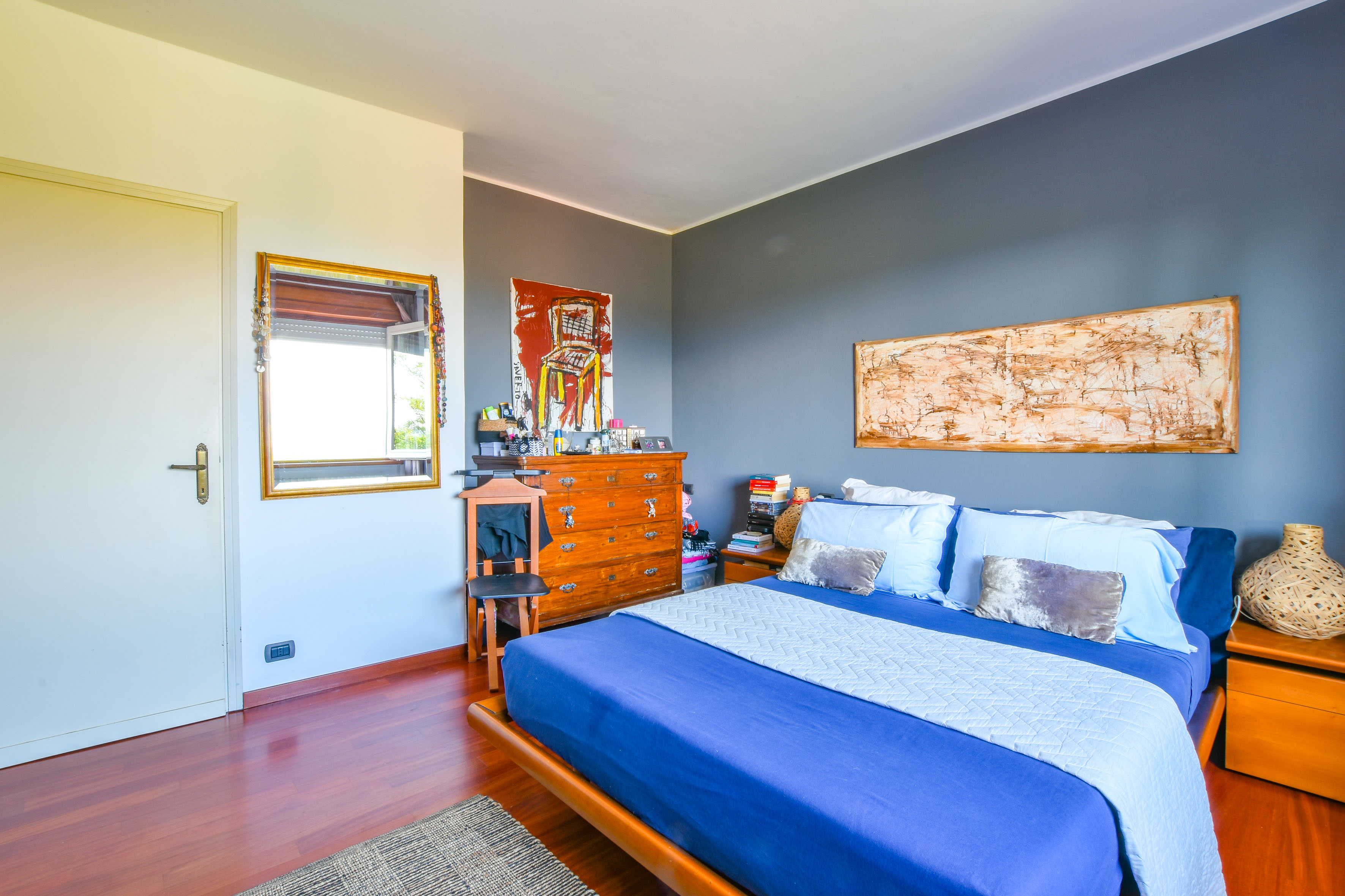 Eine Marmortreppe führt in den ersten Stock, wo sich zwei geräumige Schlafzimmer mit Holzböden befinden, beide mit Blick auf den See und die Berge. Das Hauptbadezimmer auf dieser Etage ist mit einer Badewanne und einer Dusche ausgestattet. Von hier aus gibt es auch einen Zugang zu einem praktischen Dachboden.