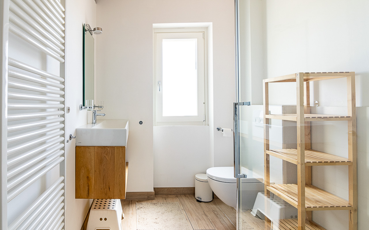 Inside, the apartment offers bright, welcoming living spaces. The ground level features a spacious living room with an open-plan kitchen. On the first floor there are two comfortable bedrooms, together with a modern bathroom featuring a rain shower and toilet. The top floor hosts a generous loft which can be used as a studio or extra bedroom as it has a washbasin.