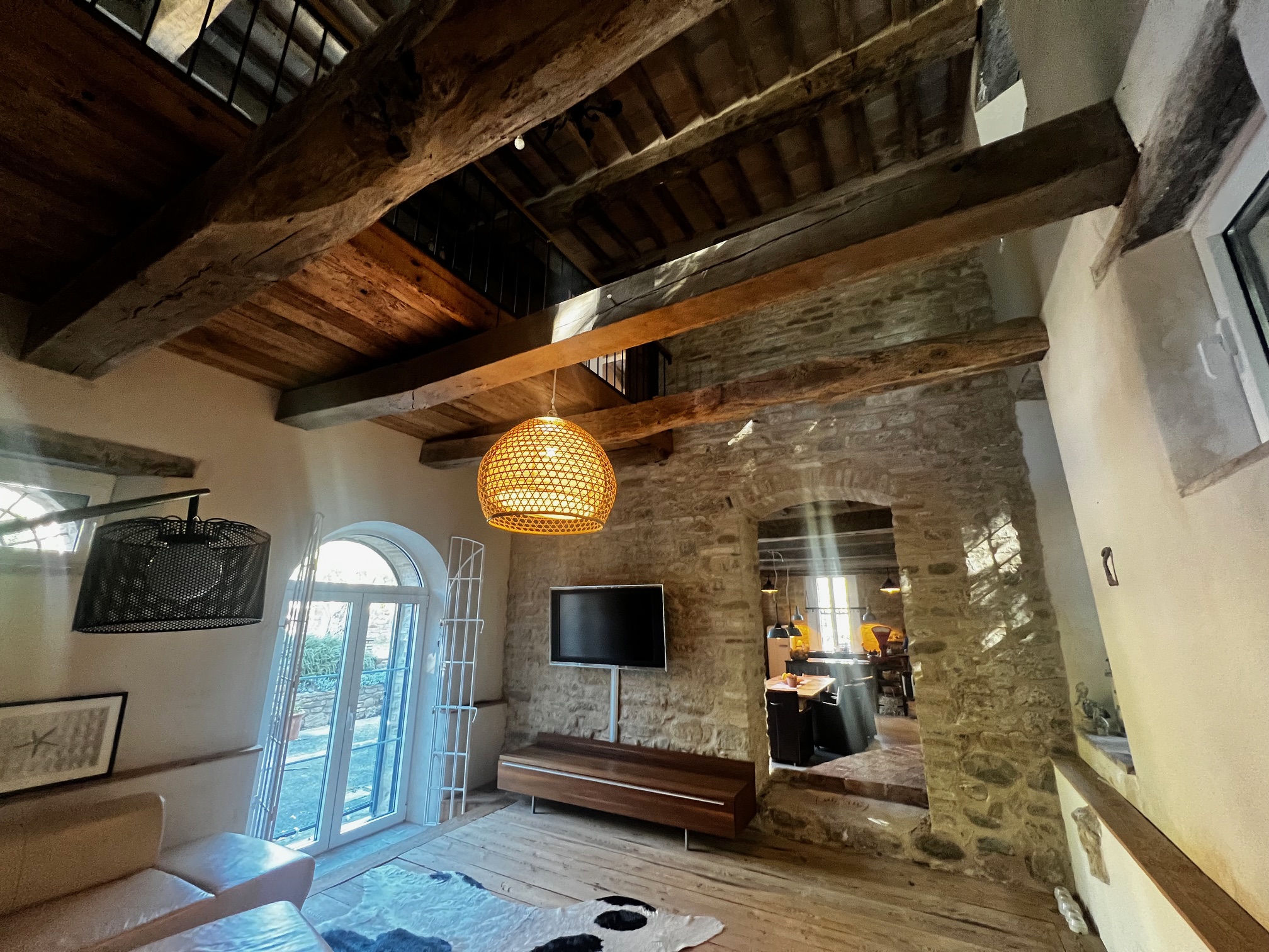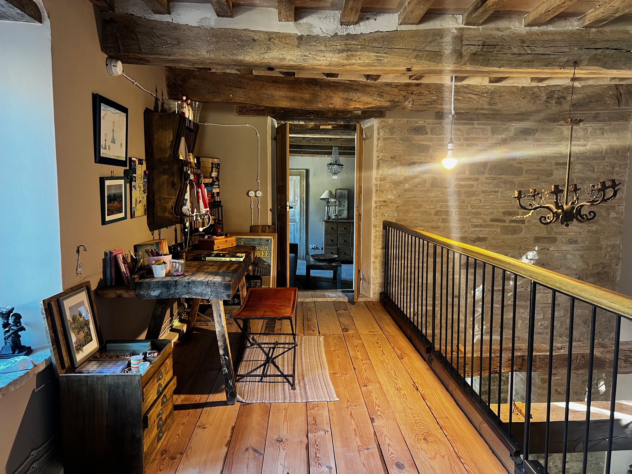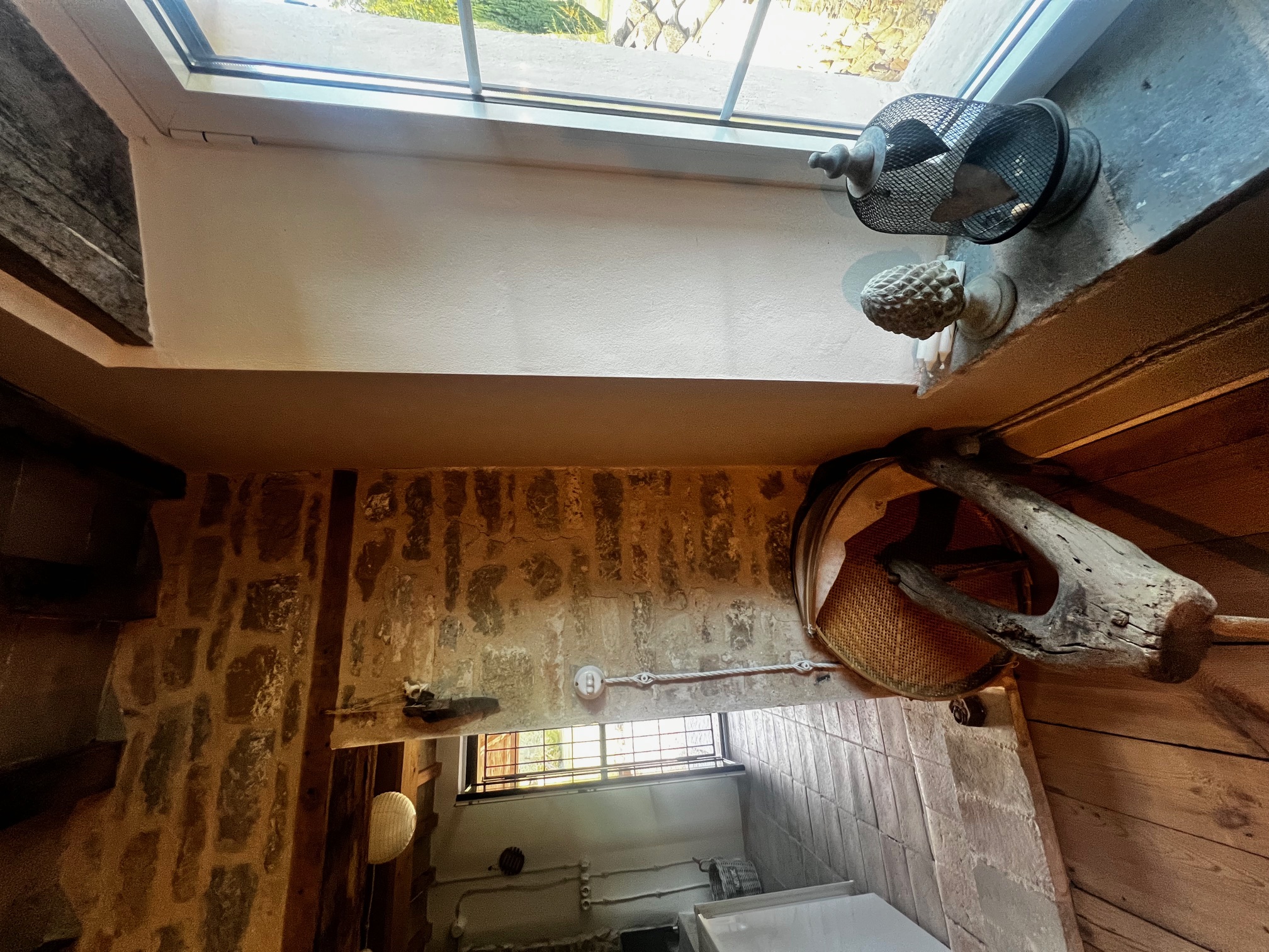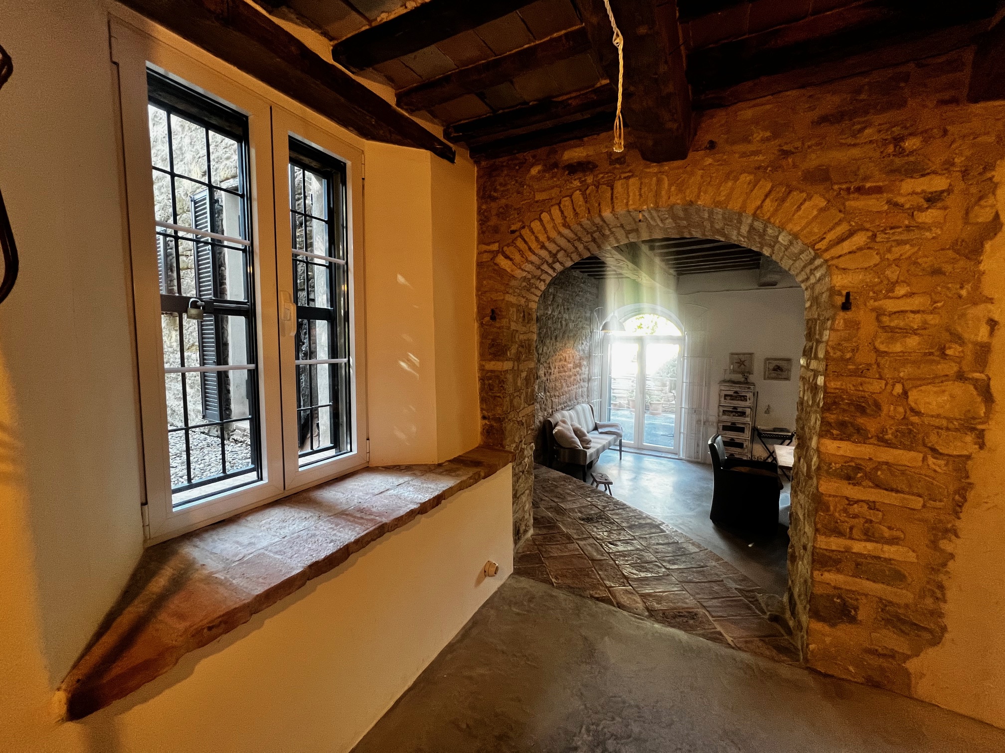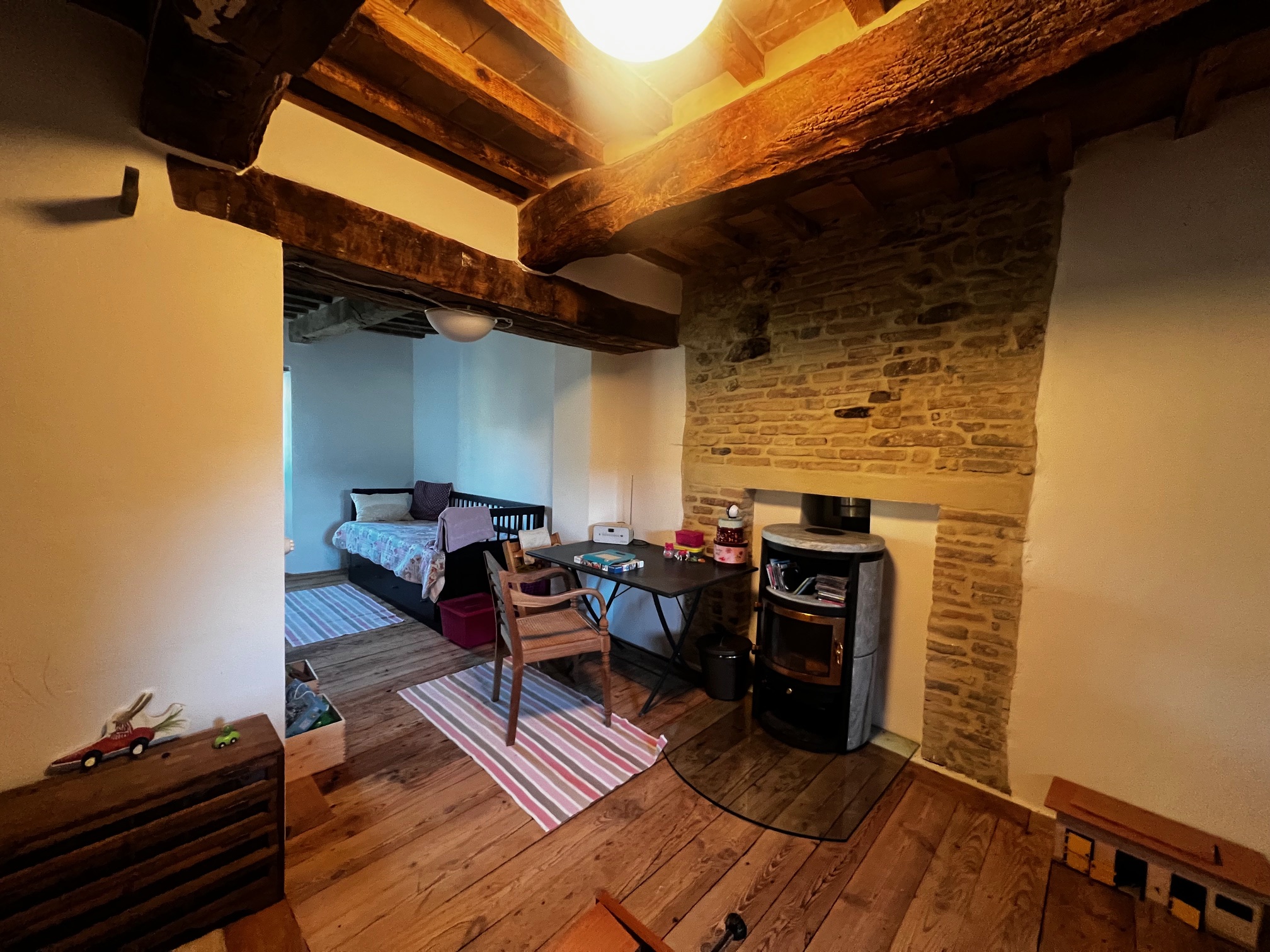 Im ersten Stock befinden sich zwei Schlafzimmer und ein Wohnzimmer mit einem originalen Kamin, der eine warme und gemütliche Atmosphäre schafft. Ein Badezimmer und ein Mezzanin/Arbeitszimmer mit einem weiteren kleinen Raum vervollständigen diese Etage, die sich zum Garten und zur Pergola hin öffnet .
