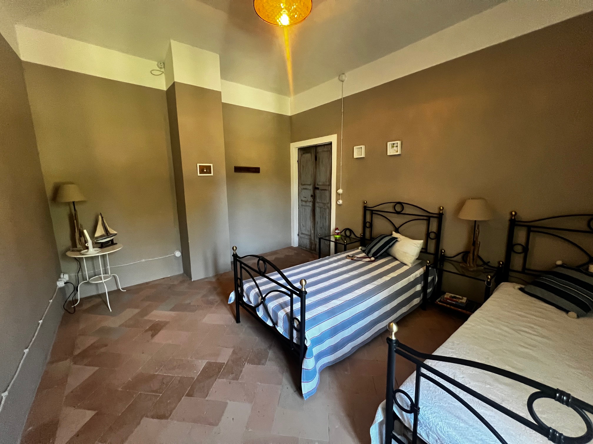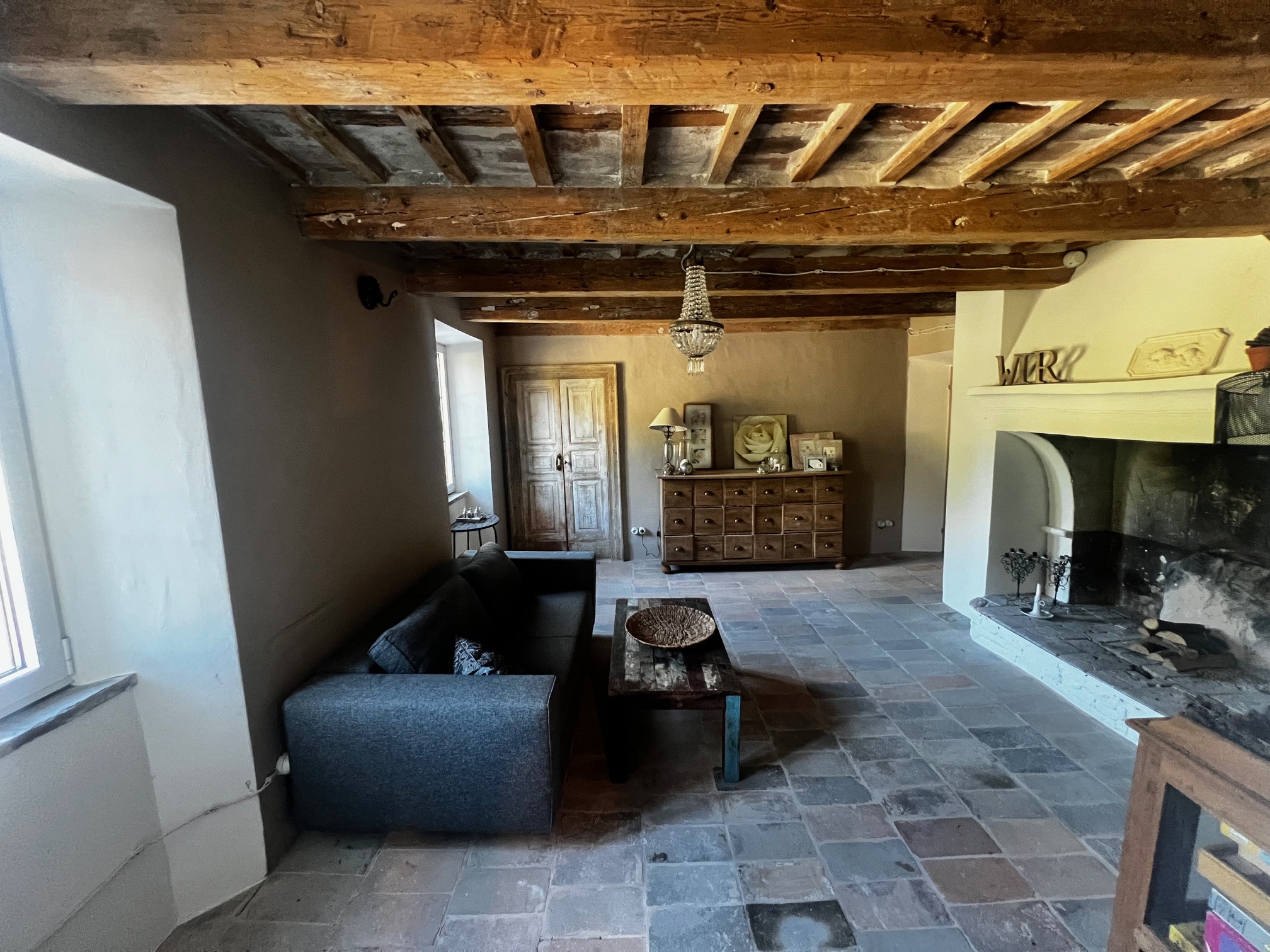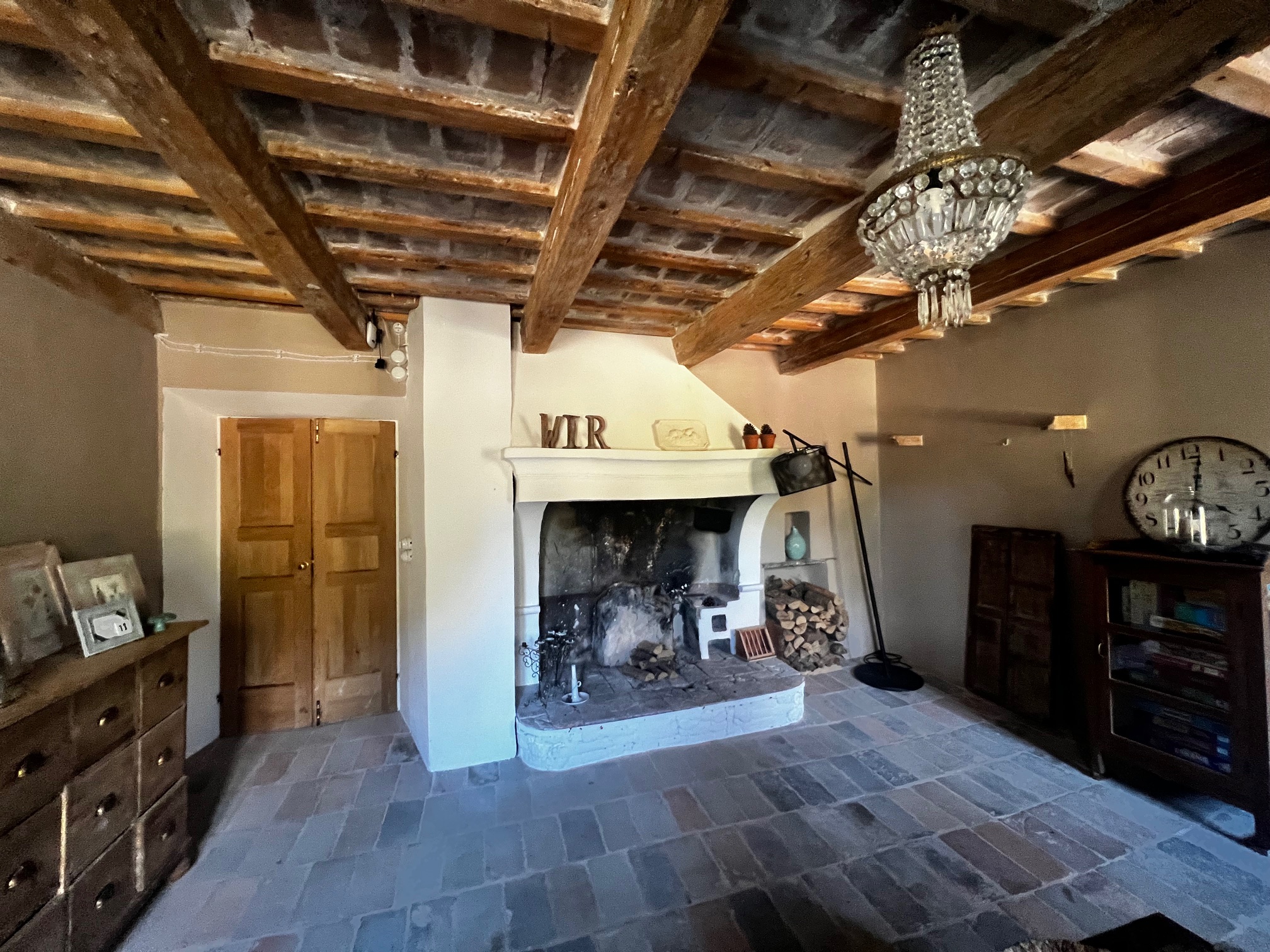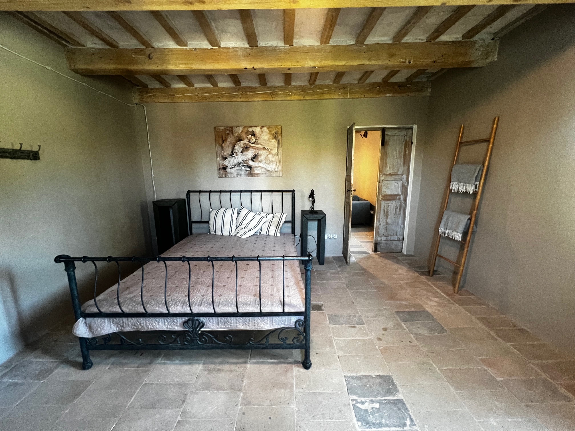 Im ersten Stock befinden sich zwei Schlafzimmer und ein Wohnzimmer mit einem originalen Kamin, der eine warme und gemütliche Atmosphäre schafft. Ein Badezimmer und ein Mezzanin/Arbeitszimmer mit einem weiteren kleinen Raum vervollständigen diese Etage, die sich zum Garten und zur Pergola hin öffnet .