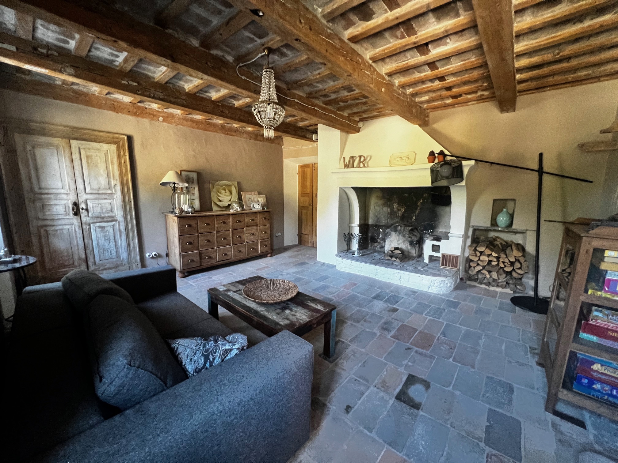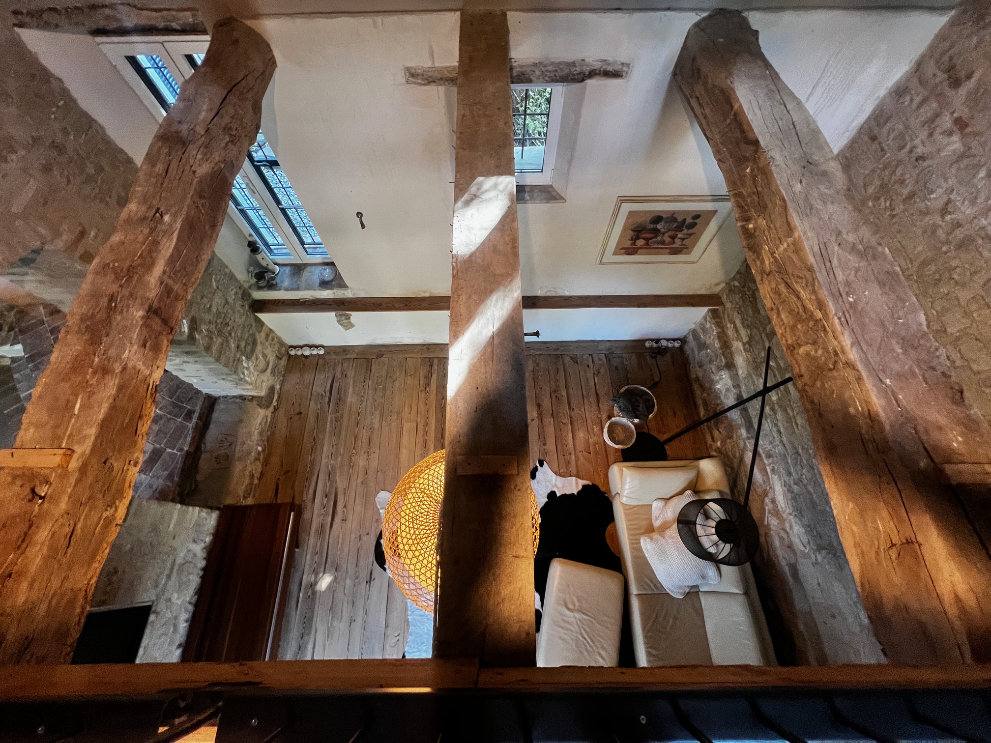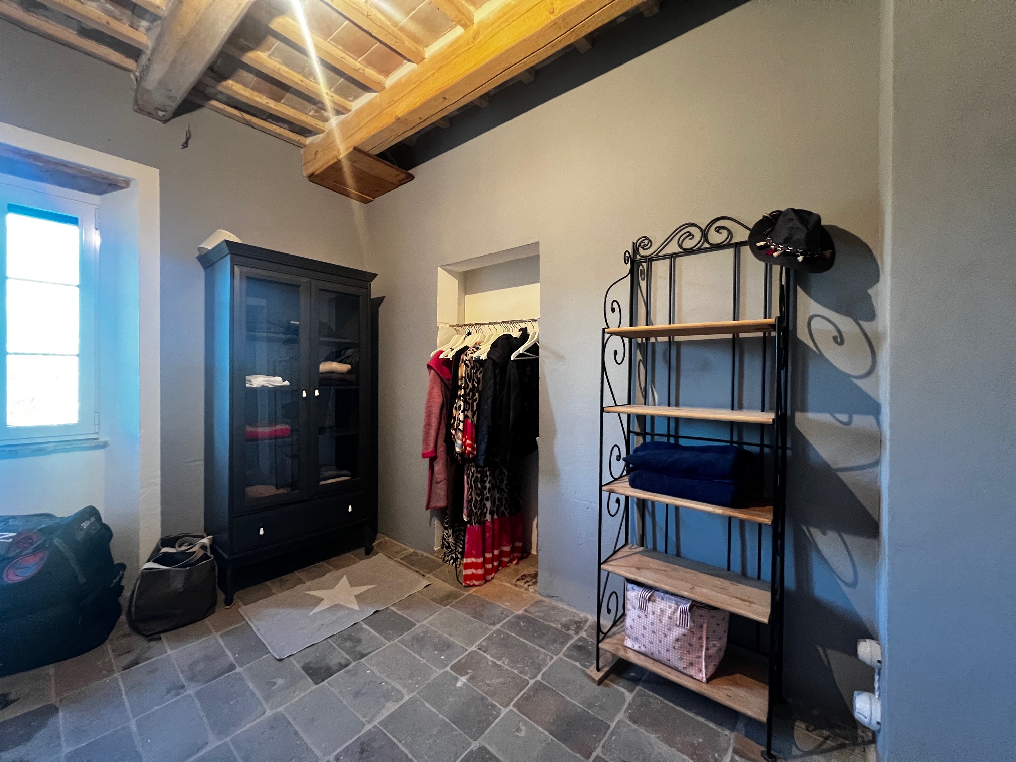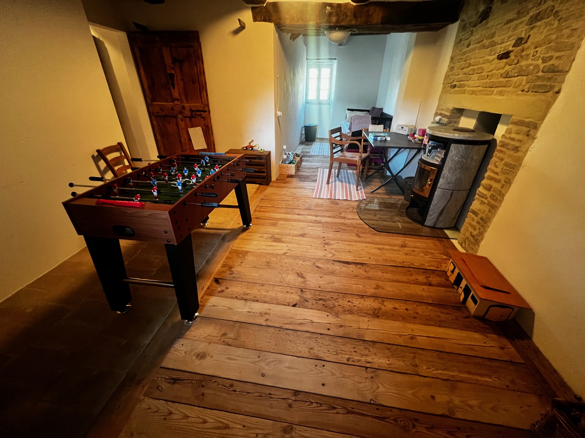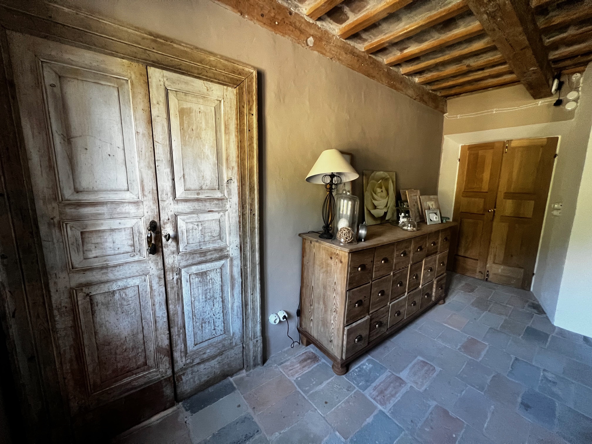 Im ersten Stock befinden sich zwei Schlafzimmer und ein Wohnzimmer mit einem originalen Kamin, der eine warme und gemütliche Atmosphäre schafft. Ein Badezimmer und ein Mezzanin/Arbeitszimmer mit einem weiteren kleinen Raum vervollständigen diese Etage, die sich zum Garten und zur Pergola hin öffnet .