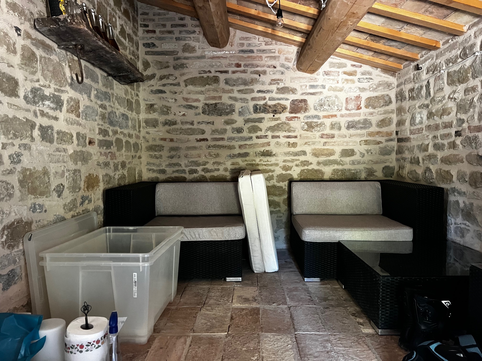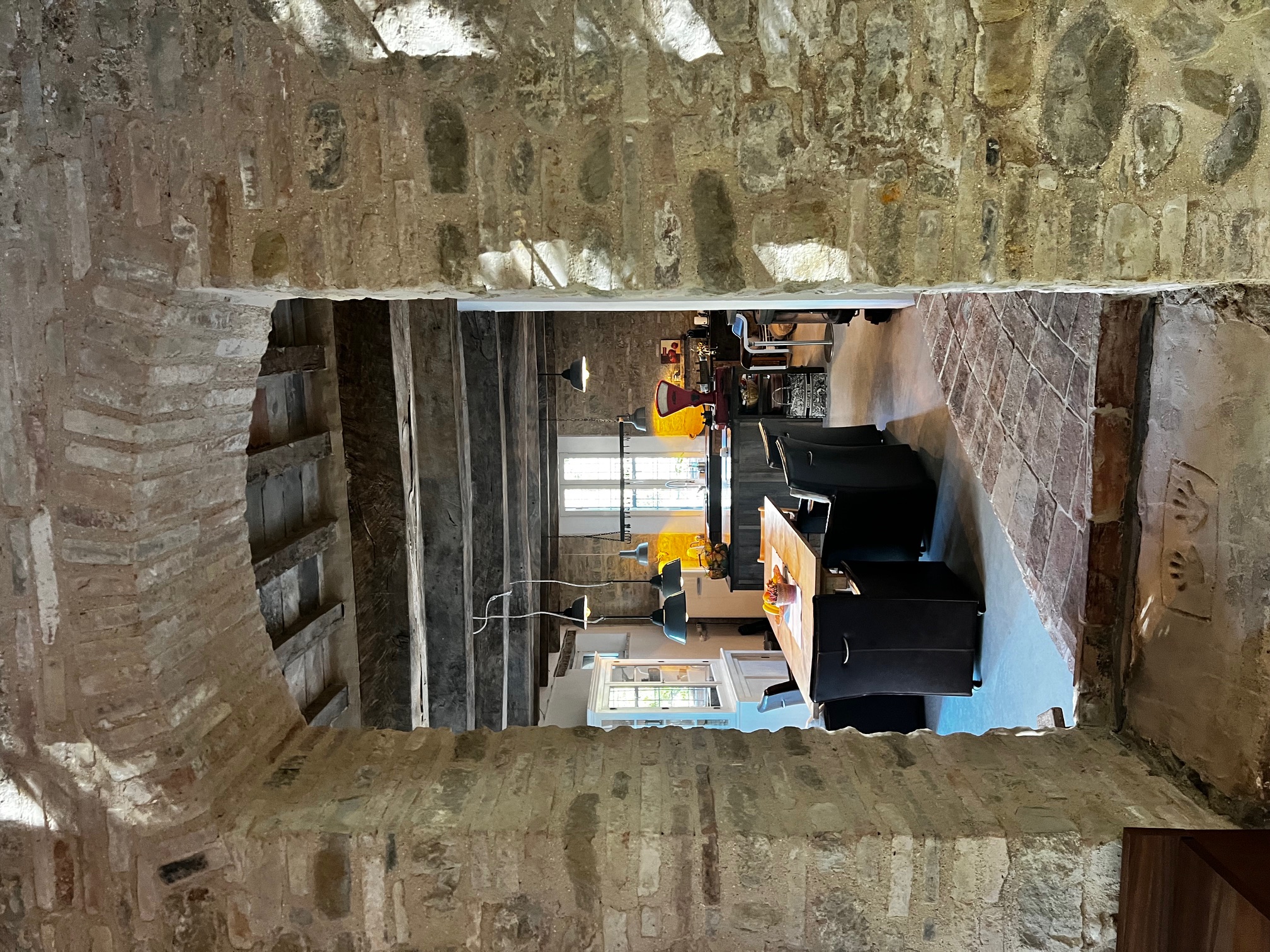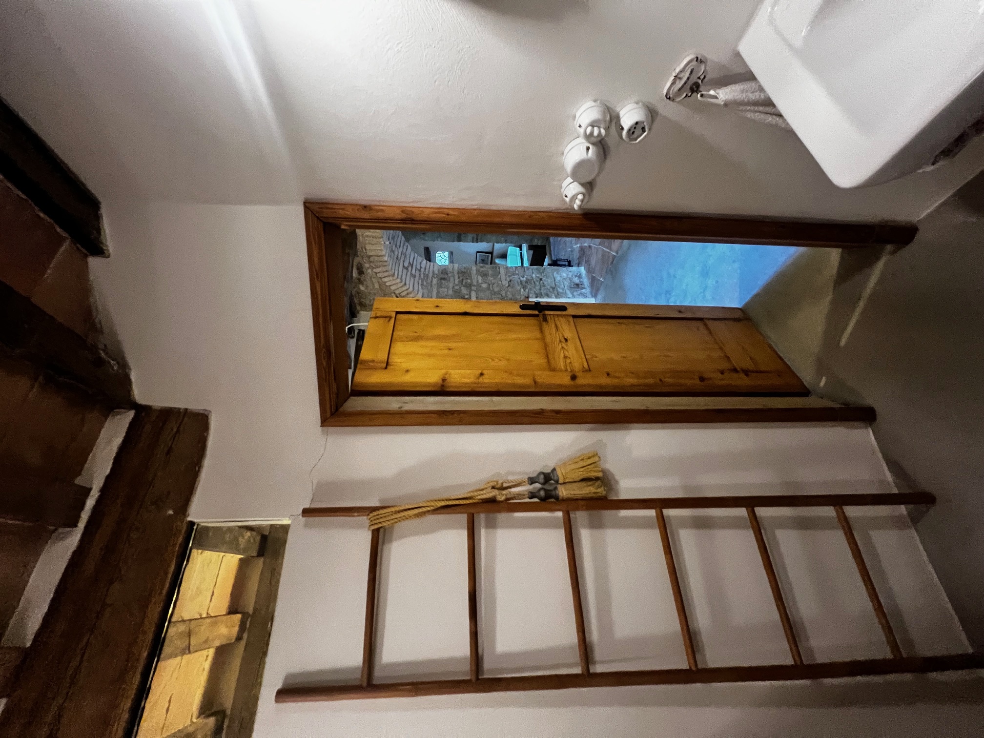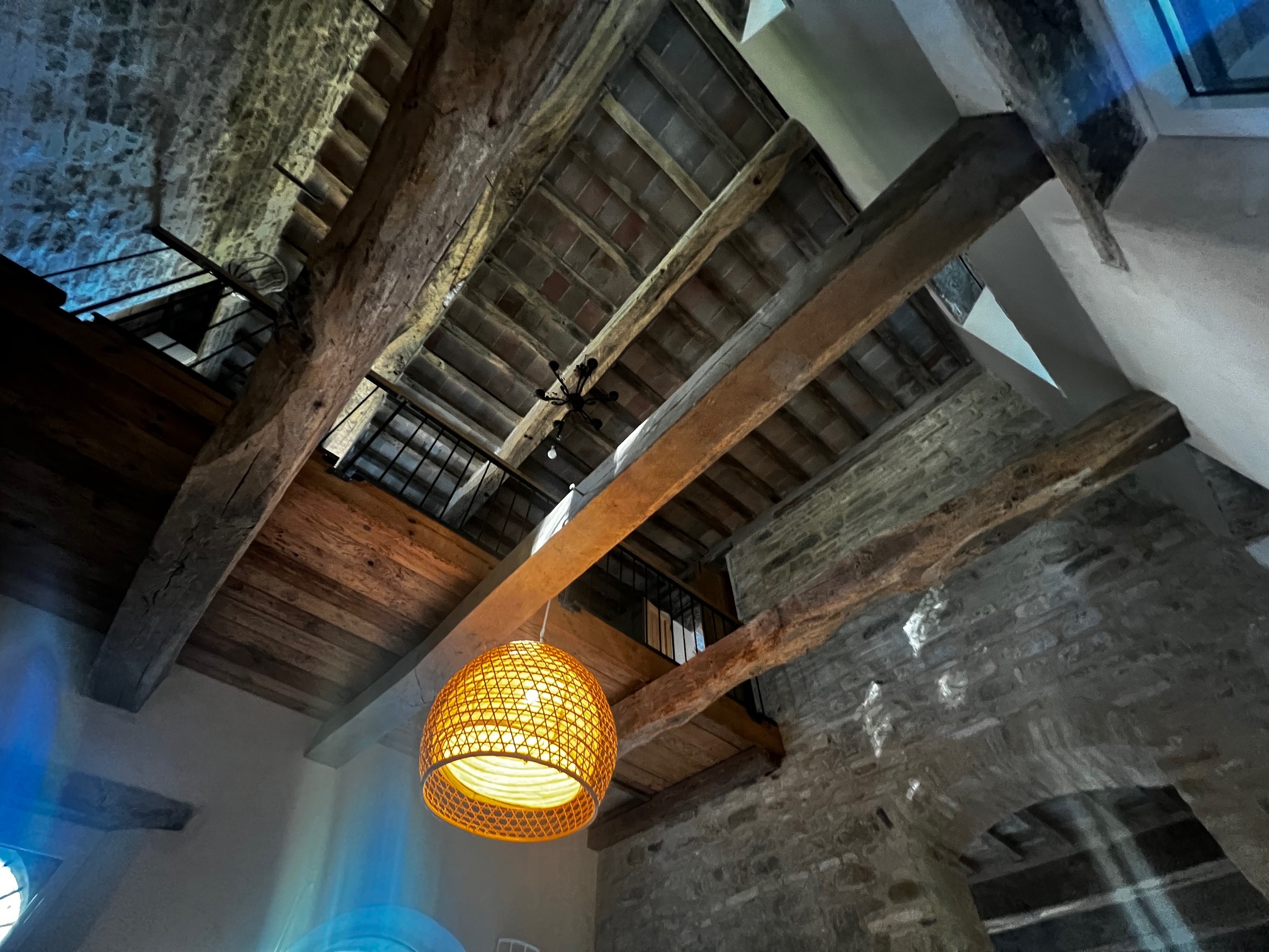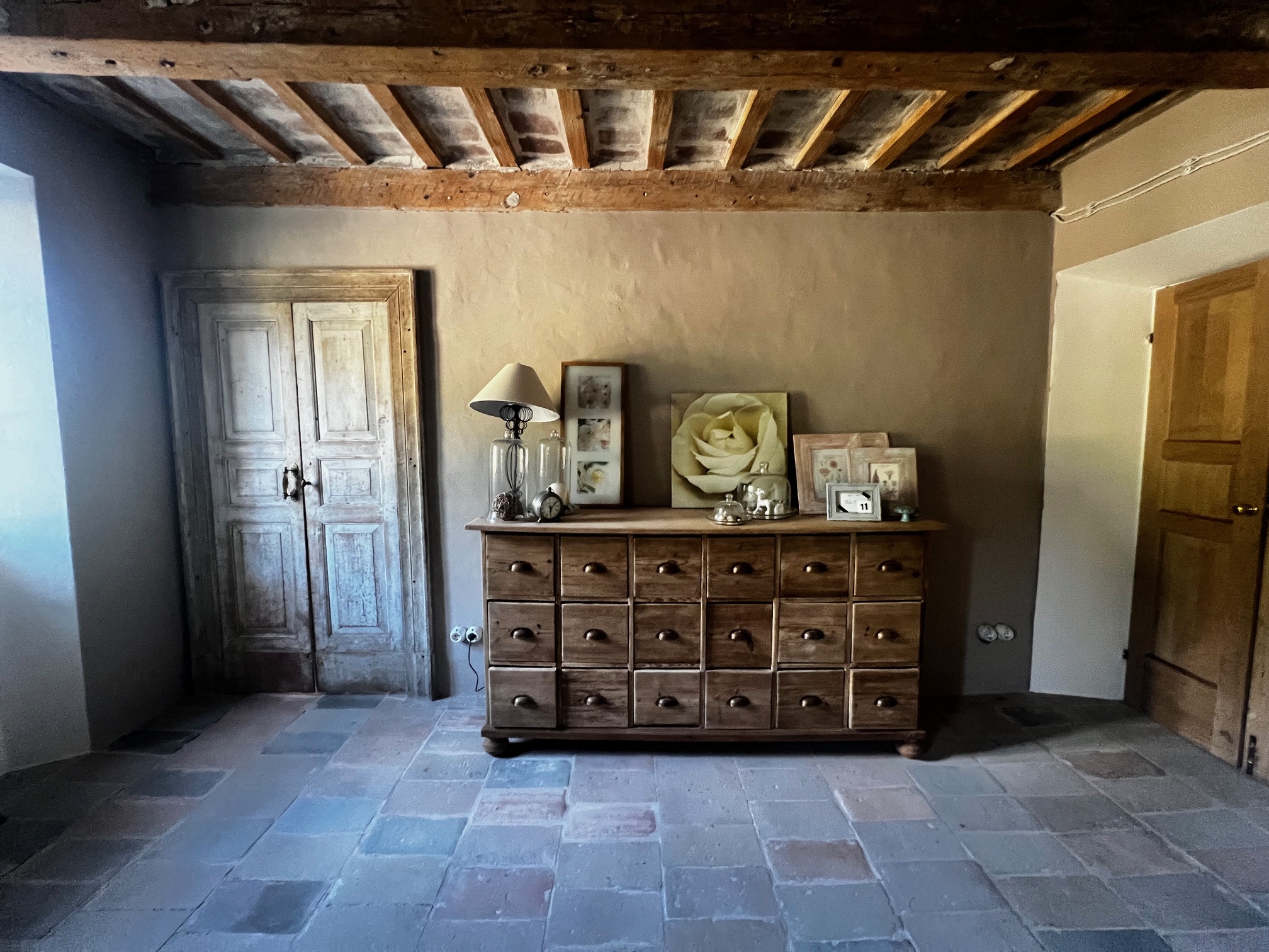 Im ersten Stock befinden sich zwei Schlafzimmer und ein Wohnzimmer mit einem originalen Kamin, der eine warme und gemütliche Atmosphäre schafft. Ein Badezimmer und ein Mezzanin/Arbeitszimmer mit einem weiteren kleinen Raum vervollständigen diese Etage, die sich zum Garten und zur Pergola hin öffnet .