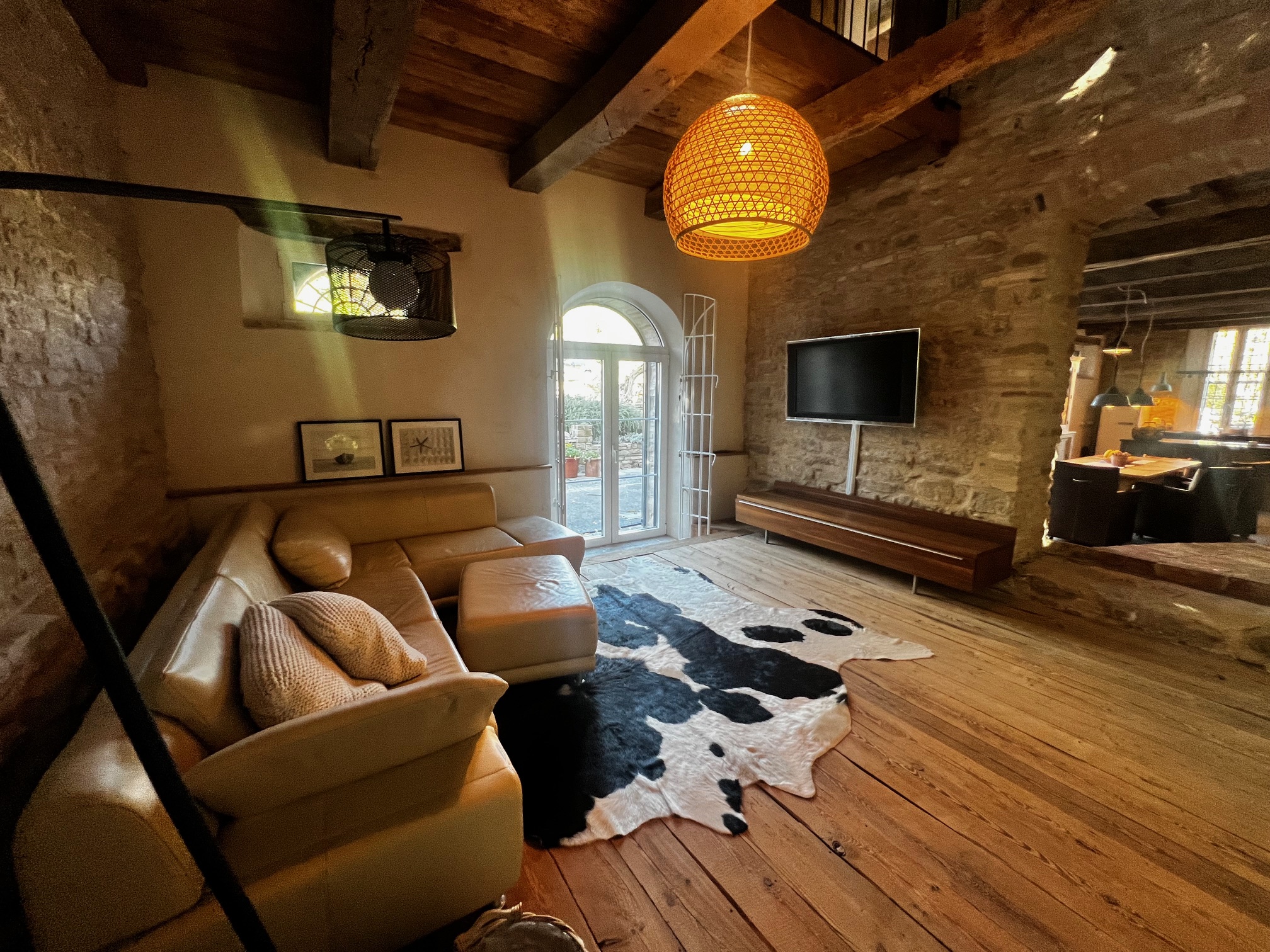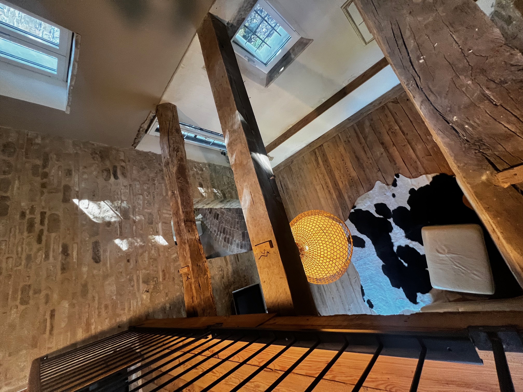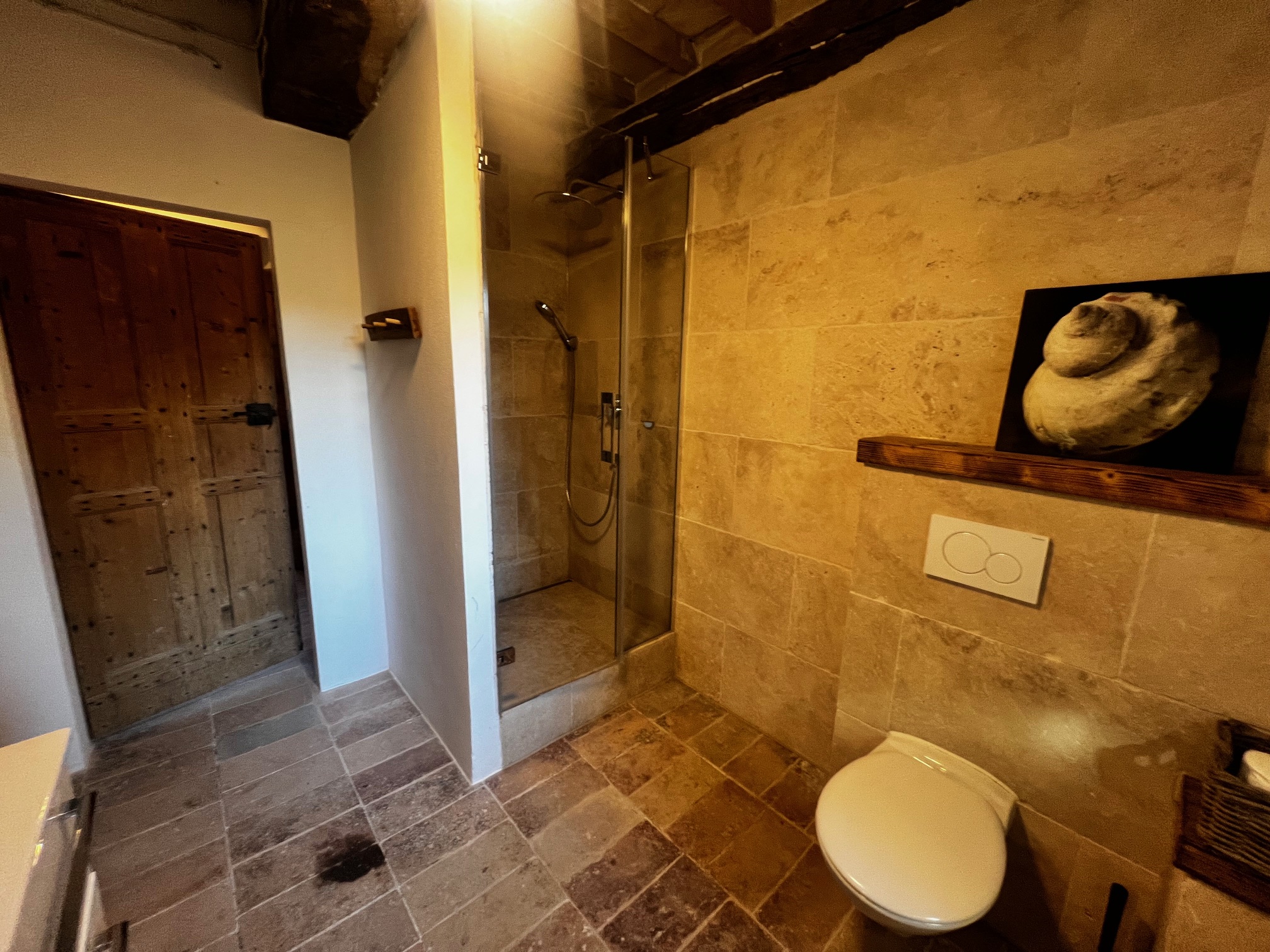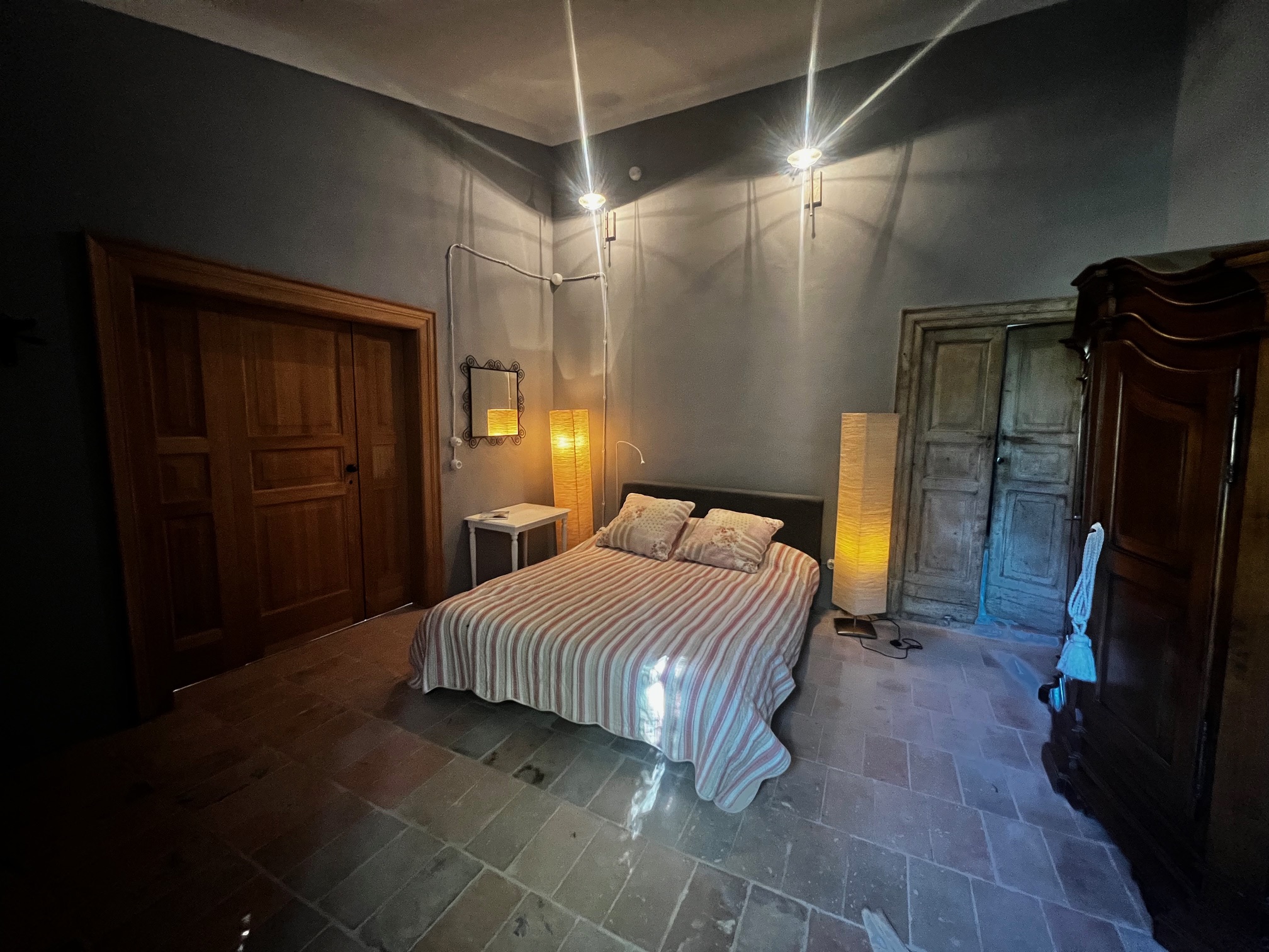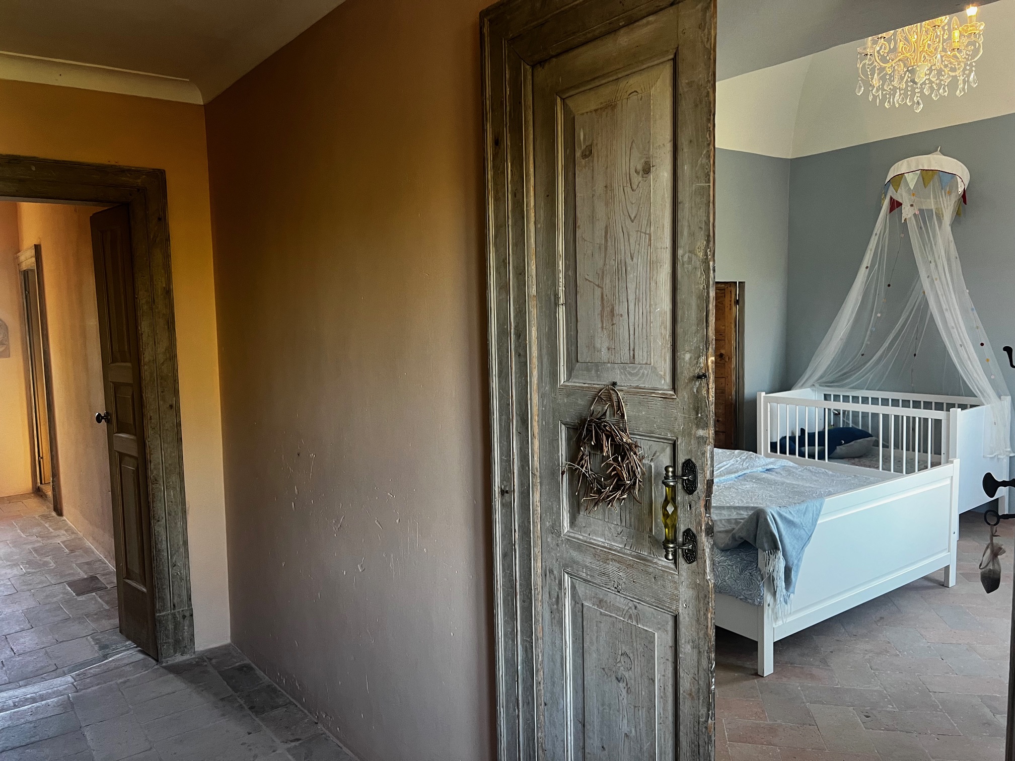 Im ersten Stock befinden sich zwei Schlafzimmer und ein Wohnzimmer mit einem originalen Kamin, der eine warme und gemütliche Atmosphäre schafft. Ein Badezimmer und ein Mezzanin/Arbeitszimmer mit einem weiteren kleinen Raum vervollständigen diese Etage, die sich zum Garten und zur Pergola hin öffnet .