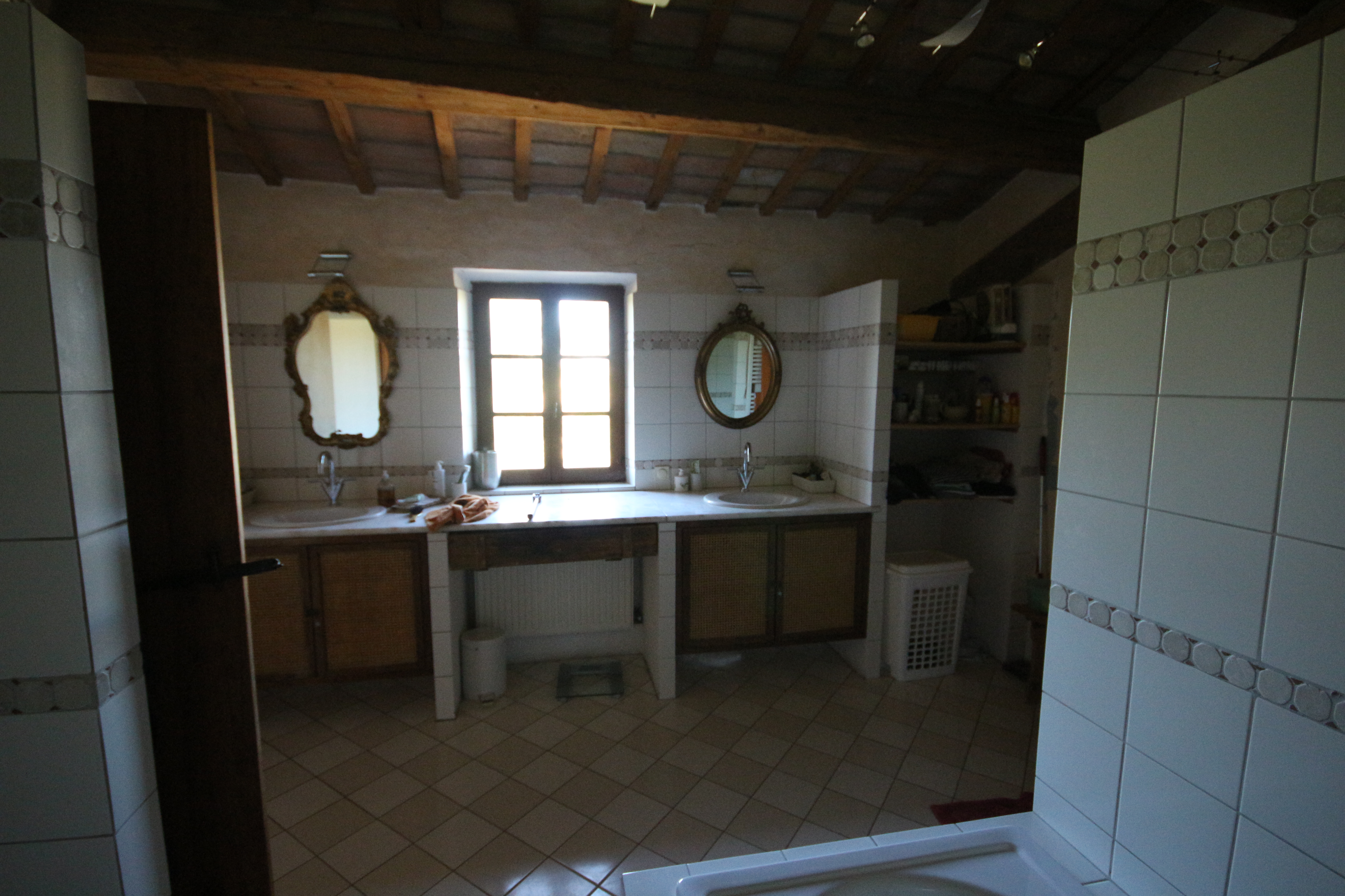 Das erste Stockwerk beherbergt auf der rechten Seite ein beeindruckendes 86 m² großes Wohnzimmer. Hier fallen sofort die großzügige Höhe, der Kamin, der gusseiserne Ofen und die schöne Decke mit Holzbalken und Terrakottafliesen ins Auge. Das Hauptschlafzimmer hat ein Loft, einen begehbaren Kleiderschrank und ein eigenes Bad mit Doppelwaschbecken. Außerdem gibt es ein komfortables Gästezimmer mit eigenem Bad, das vom Wohnzimmer aus zugänglich ist.