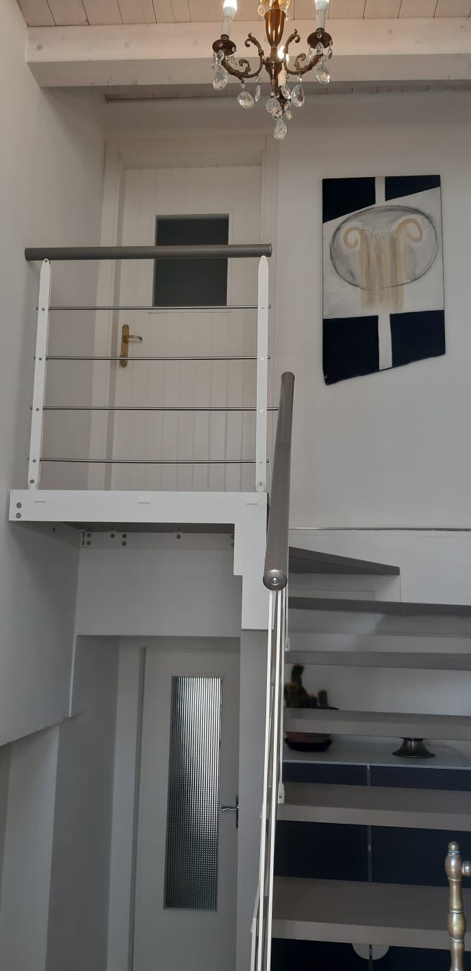 • Erster Stock: offene Küche und Wohnzimmer, ein Schlafzimmer und ein Badezimmer mit Dusche und Abstellraum.