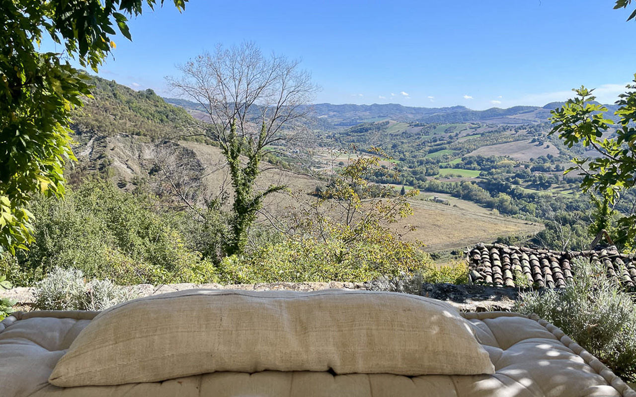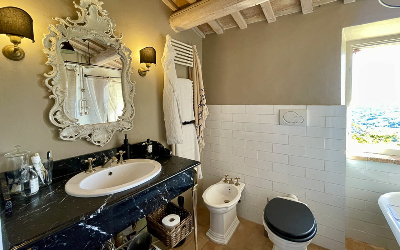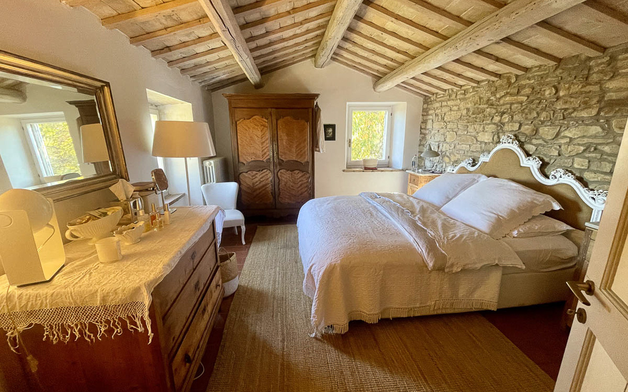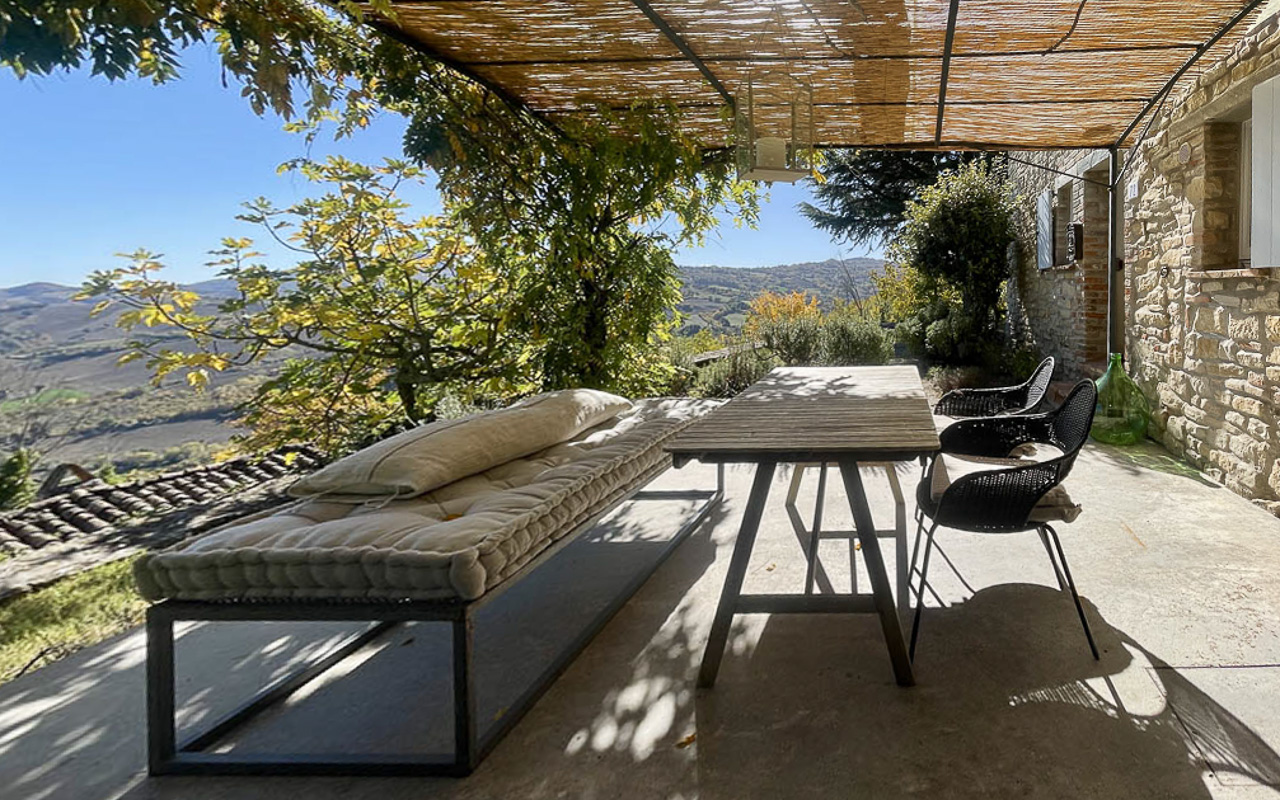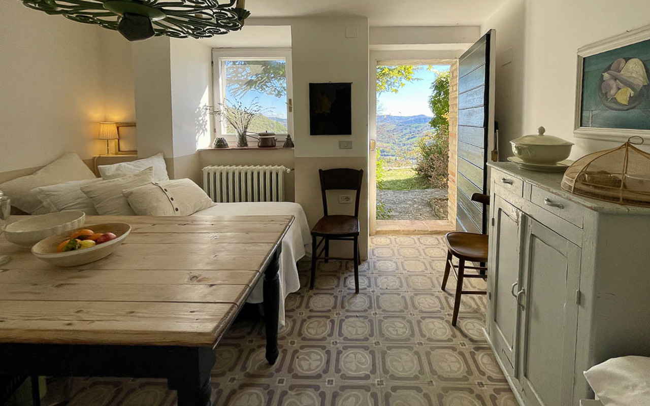The house sits on the edge of a tiny historic rural hamlet, enjoying a predominant south-east orientation and uninterrupted views over the Aso Valley, its gentle ridgelines and the medieval hilltop villages scattered across the landscape. The private garden of approximately 2,000 sqm is arranged in terraces, providing charming outdoor spaces for dining, relaxing and enjoying the scenery.