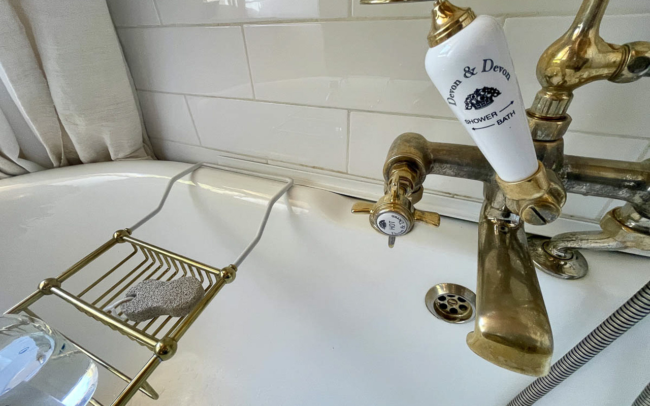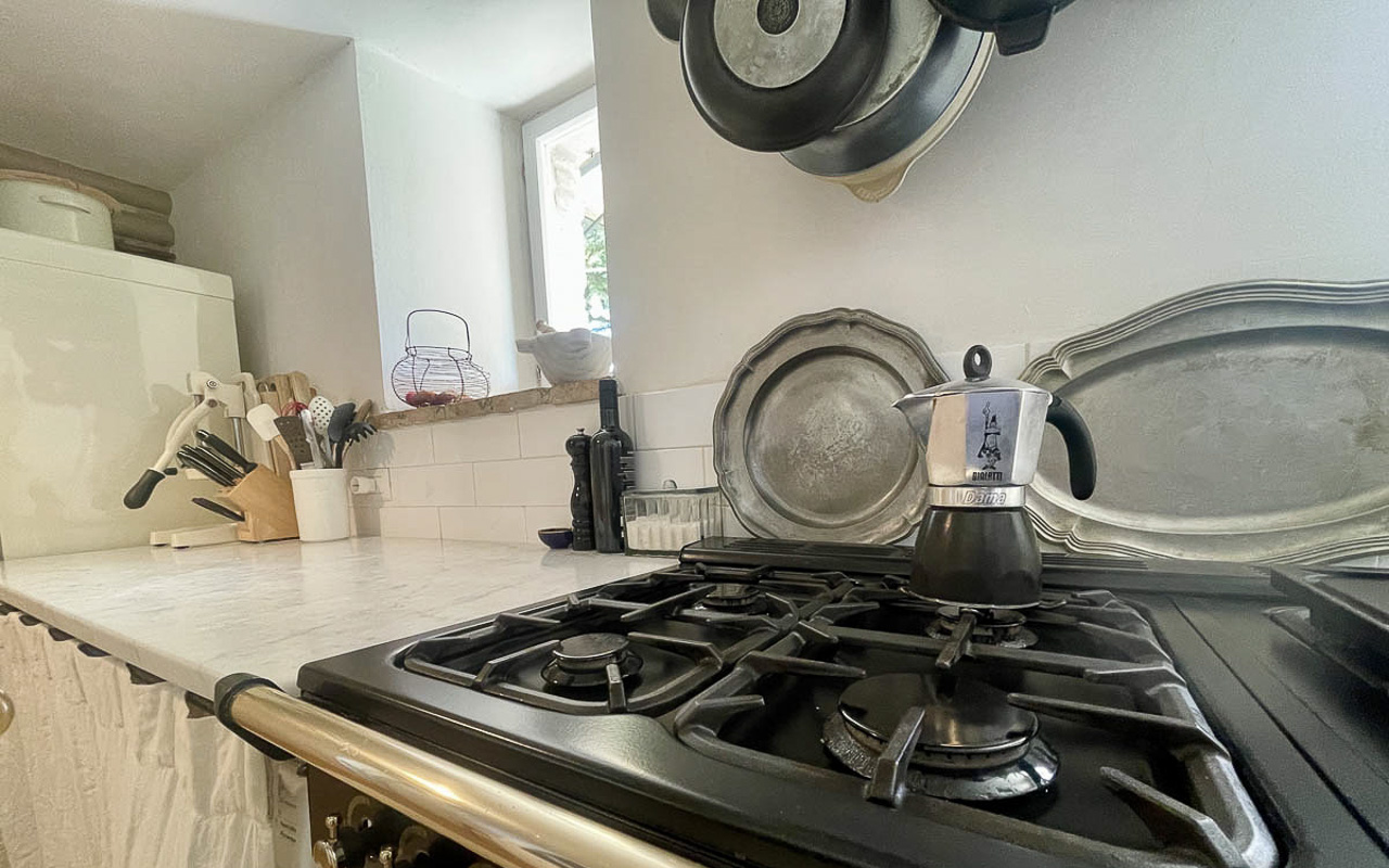 The house is arranged over two floors for a total of 143 sqm (gross). Ground Floor: a cosy living room with wood-burning fireplace, a fully equipped kitchen with generous work surfaces, a Falcon combined cooker, dishwasher, washing machine, and a large ceramic sink positioned beneath a panoramic window. The adjacent dining area can serve as an additional bedroom when needed. Also on this level, with independent external access, is a small service bathroom with outdoor shower—perfect for the summer months. First Floor: the master bedroom, a twin guest bedroom, and a beautiful bathroom with bathtub, all finished with high-quality Devon & Devon fittings.