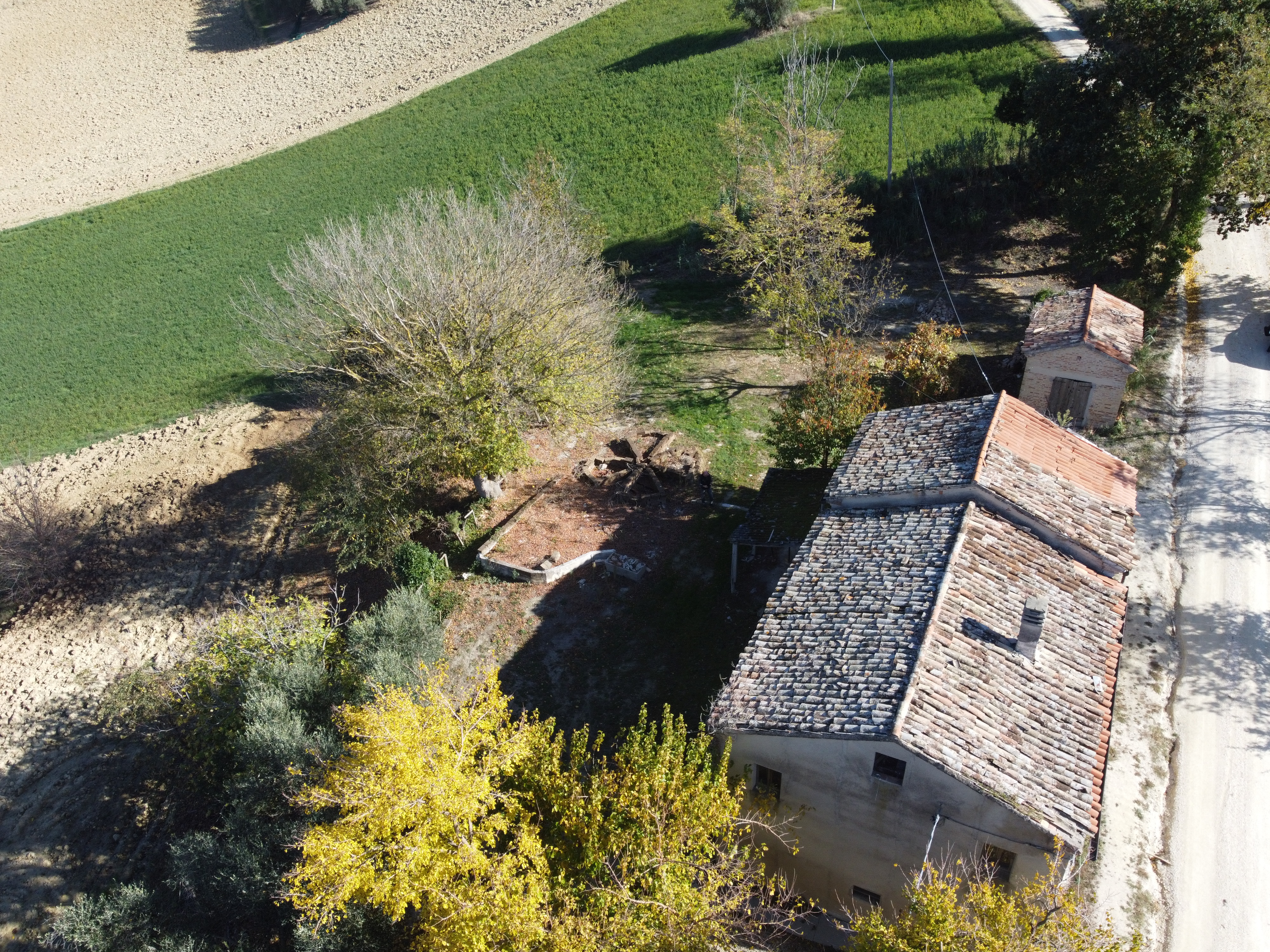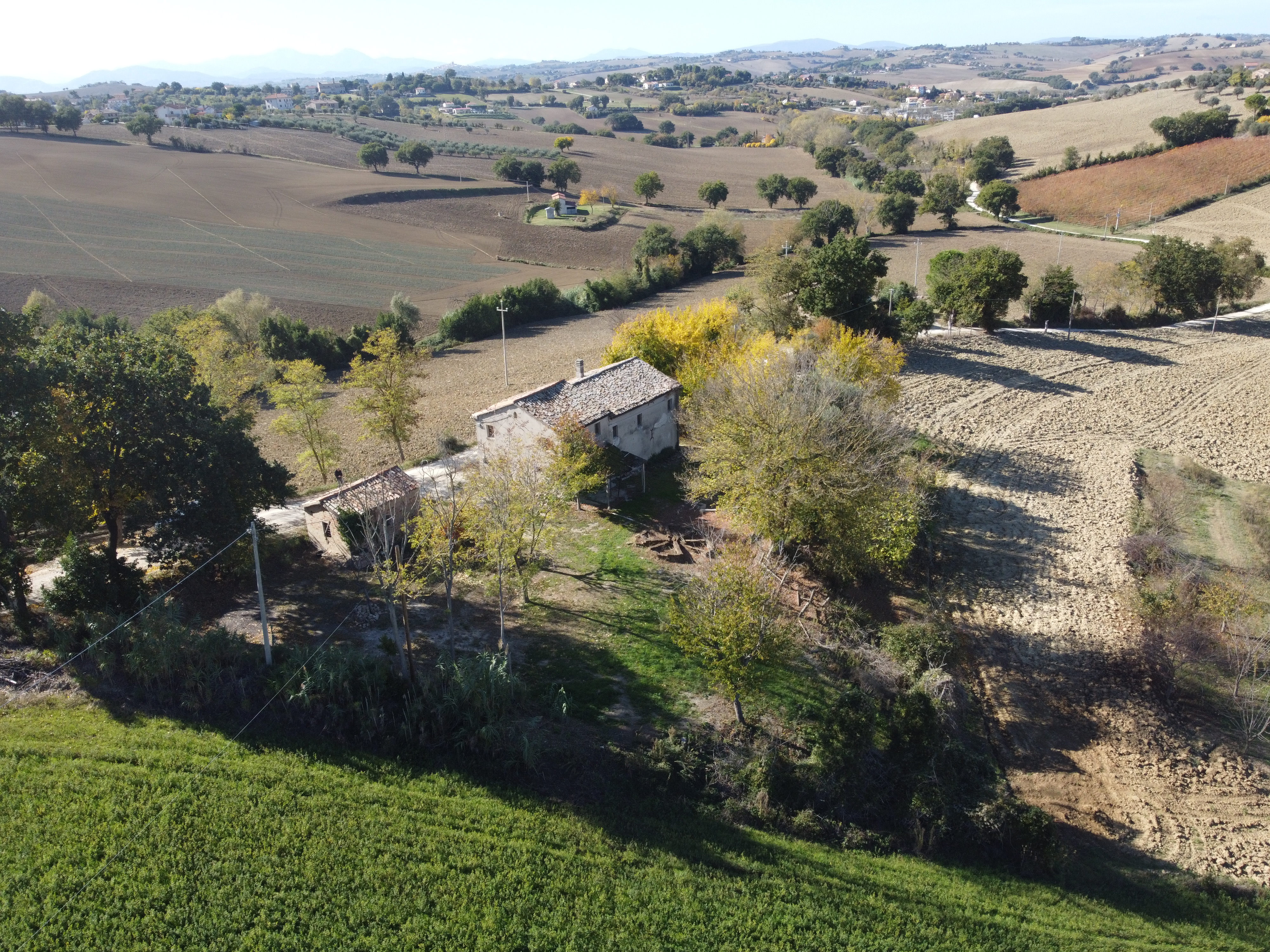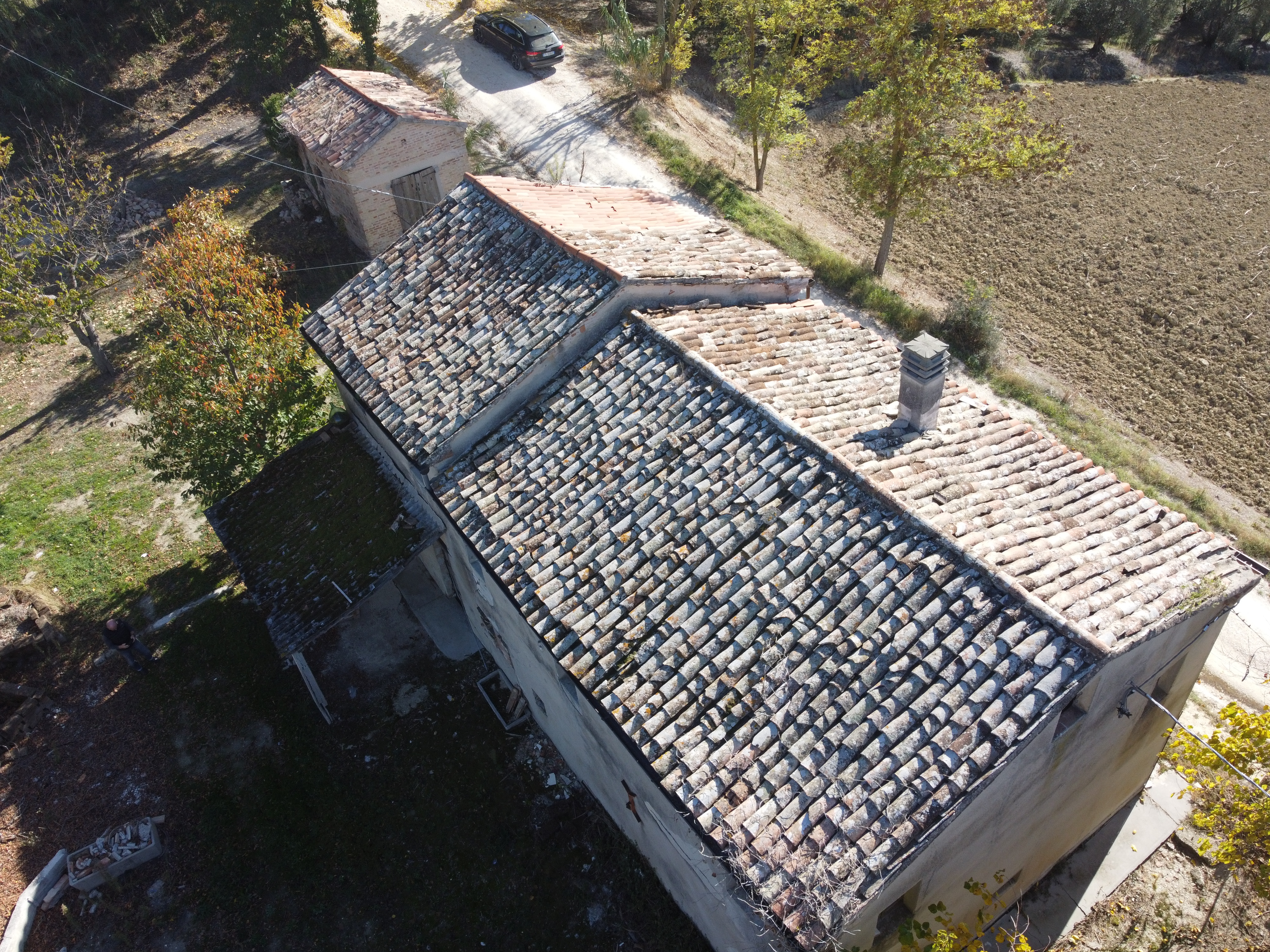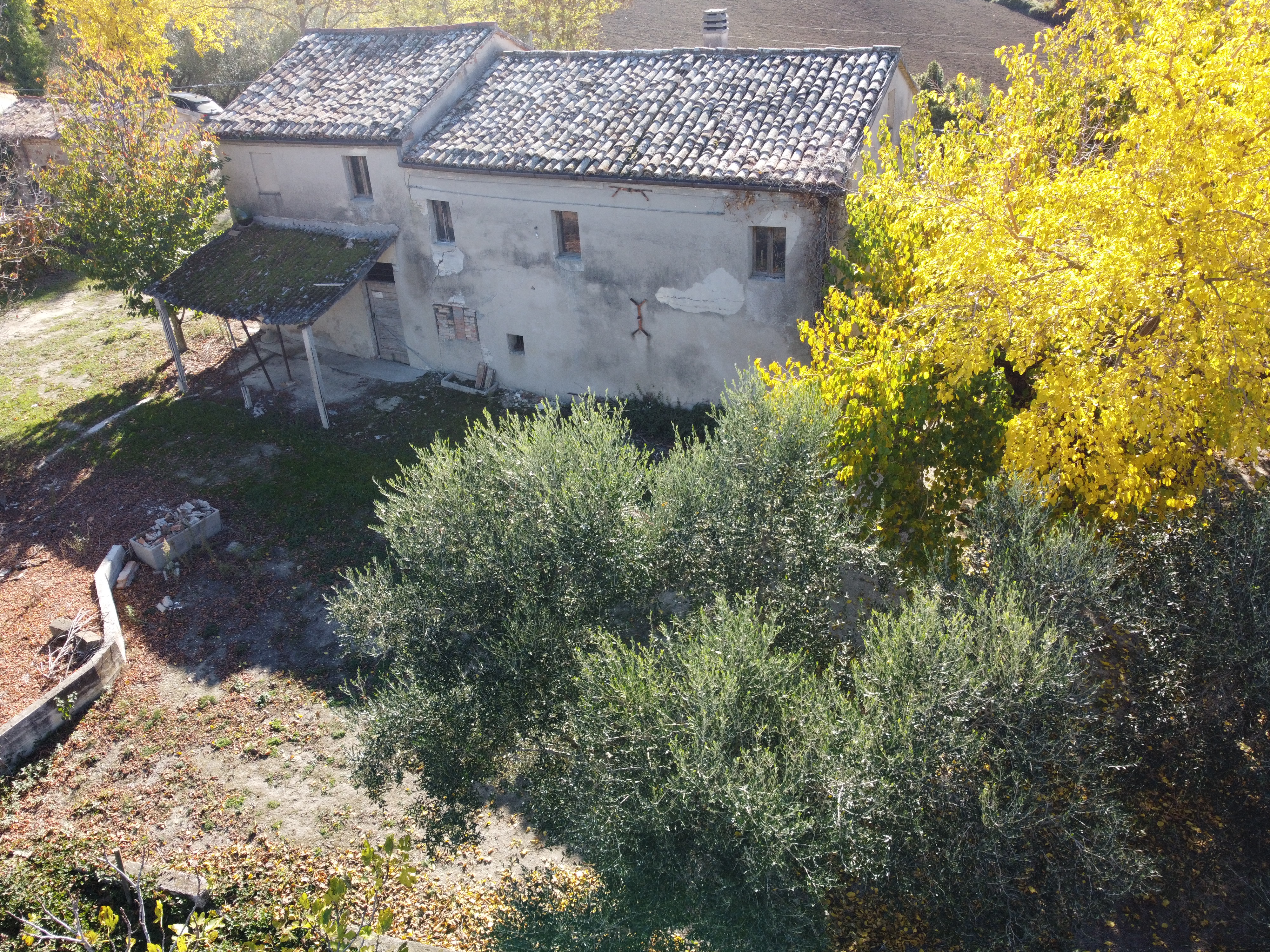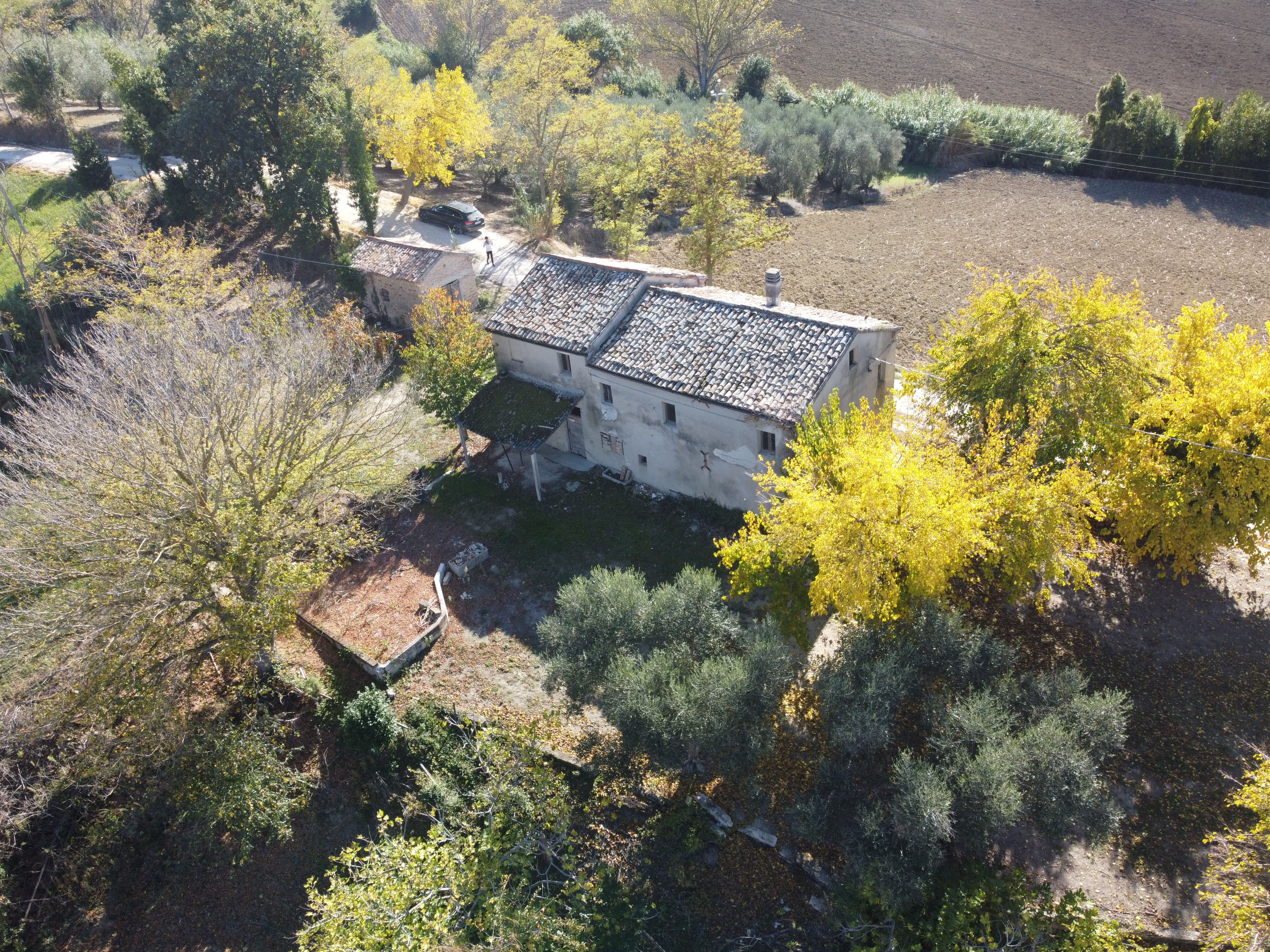 Das Gebäude ist ein typisches Beispiel für ein traditionelles Landhaus in den Marken, mit einer Gesamtfläche von 220 m², verteilt auf 2 Etagen (mehrere Abstellräume im Erdgeschoss, 2 Schlafzimmer, 1 Bad und Küche im ersten Stock, Dachgeschoss mit einer Firsthöhe von 1,30 m. Das Grundstück hat eine Größe von 4,2 ha, ein Teil davon ist mit Olivenbäumen bepflanzt. Nebengebäude von 20 m².