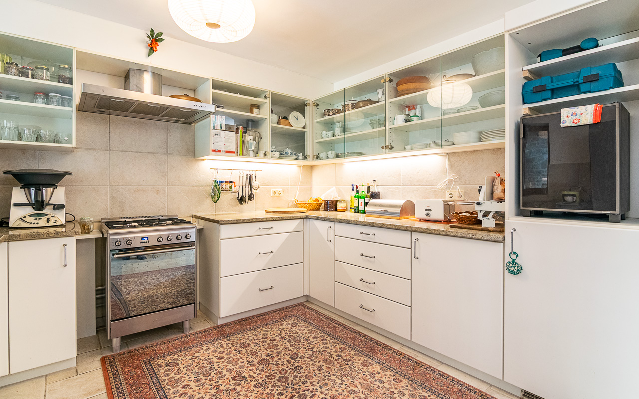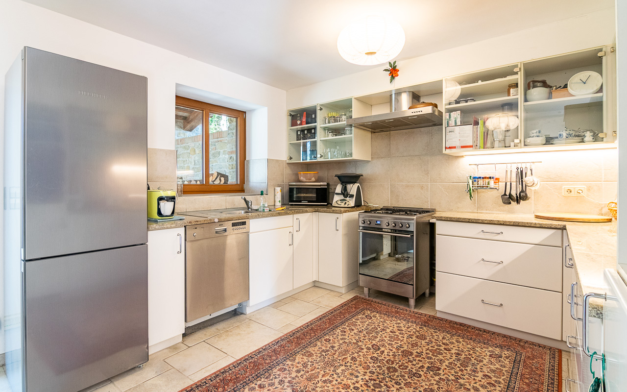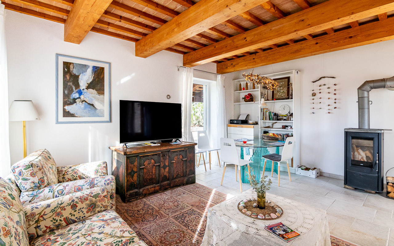 On the ground floor there is a very bright living room and a kitchen, creating a welcoming and practical living area. The interiors are finished with cream-coloured floor tiles laid in a Romanesque pattern throughout, creating a harmonious and elegant feel.