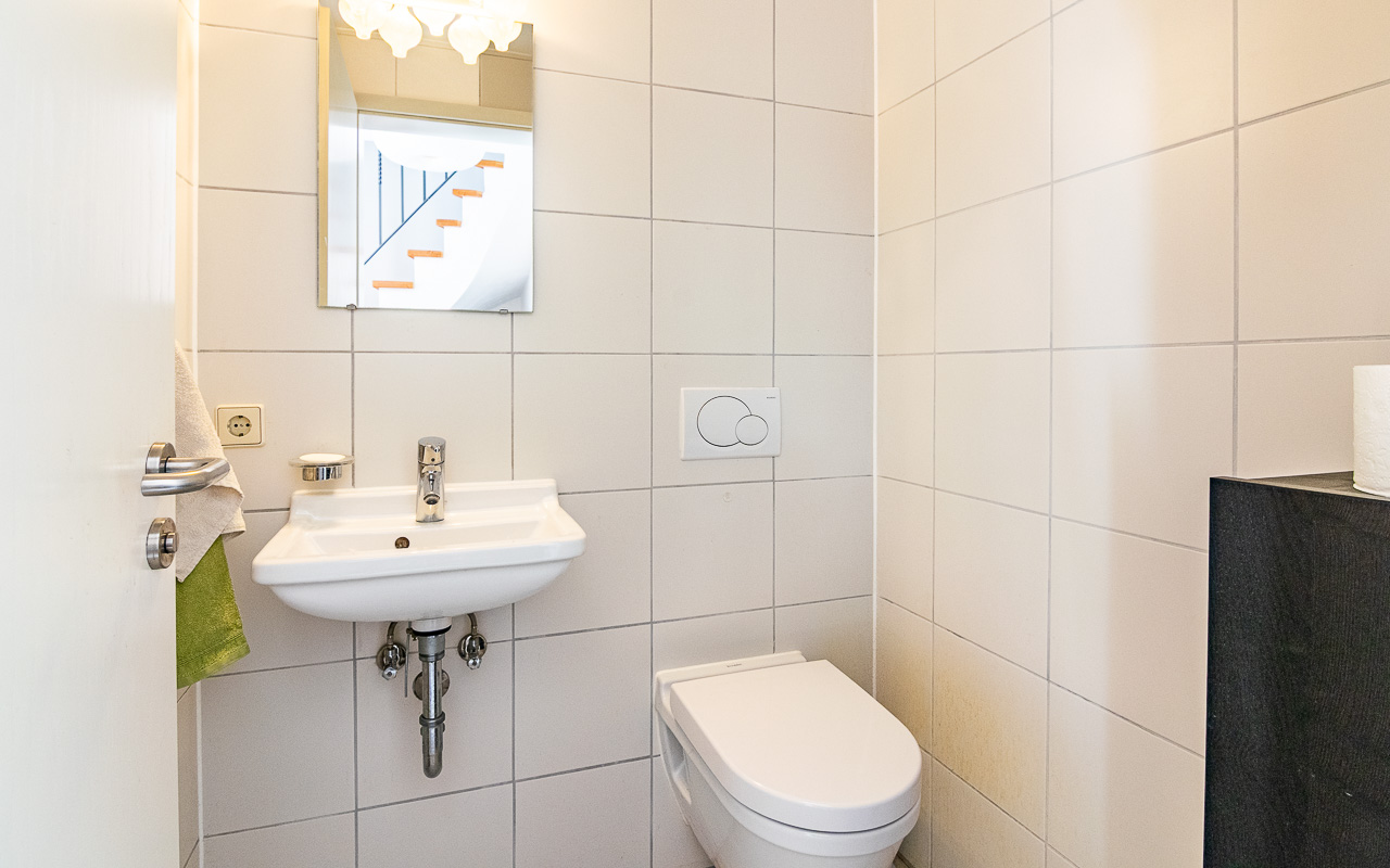 Each floor has its own bathroom, with separate WCs on the ground floor and third floor. The second floor features a spacious bathroom with double washbasins and a shower. There are two large bedrooms, located on the second and third floors respectively.