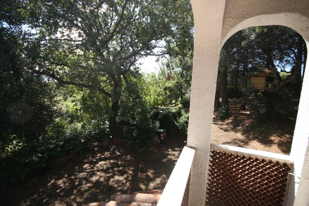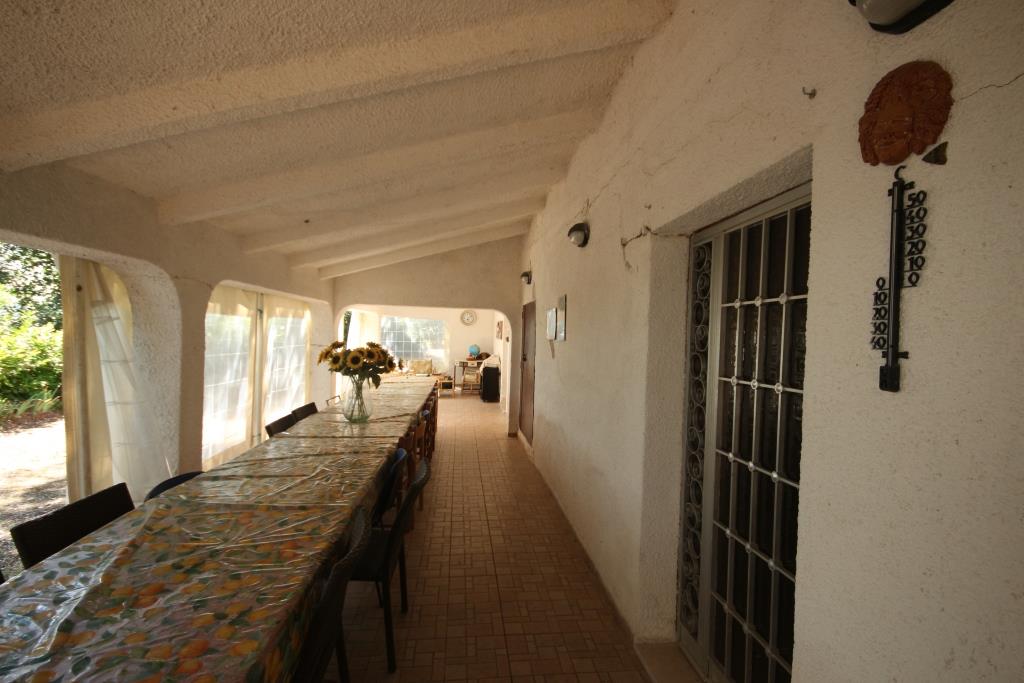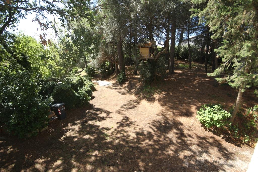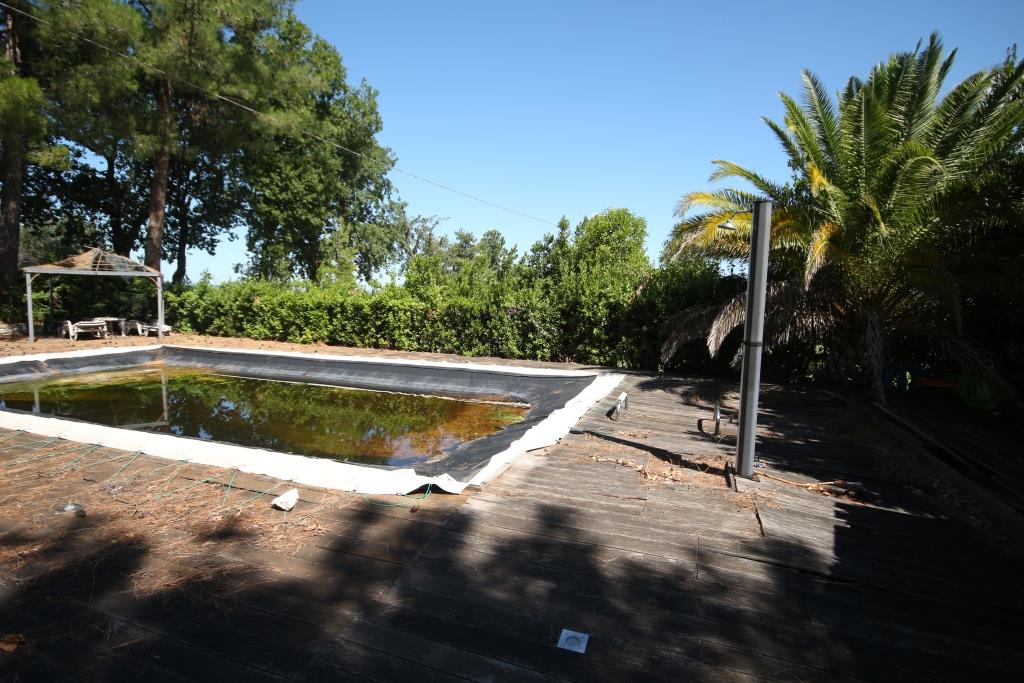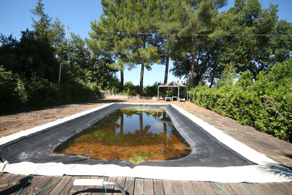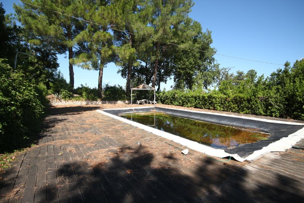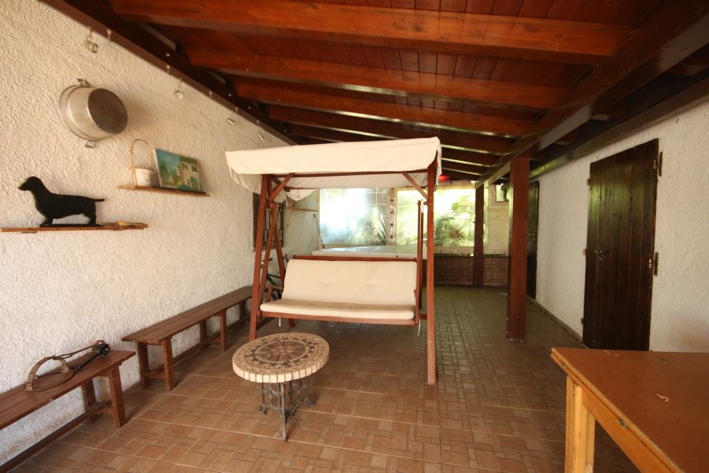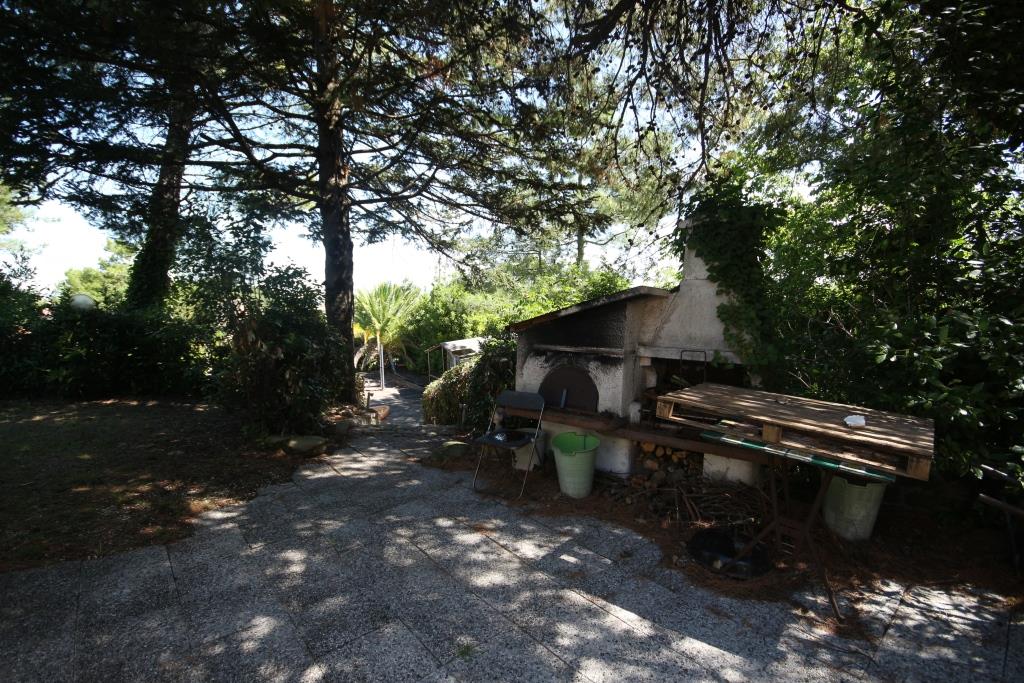 Vor dem Haus befindet sich ein Grillplatz neben einer Tuffsteintreppe, die zum unteren Pool führt; um den Pool herum befindet sich eine Sonnenterrasse mit Holzbelag, der renoviert oder komplett erneuert werden muss, und an der Sonnenterrasse liegt der Technikraum (9 m²). Außerdem gibt es einen 17 m² großen Schuppen für die Lagerung von Gartengeräten.