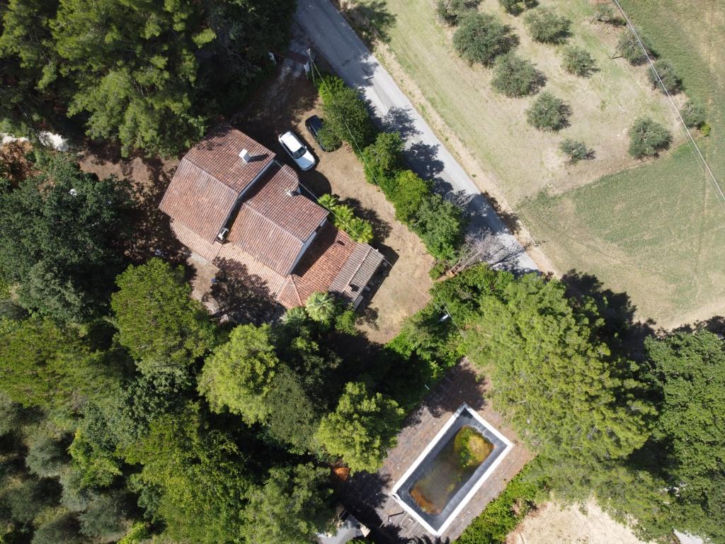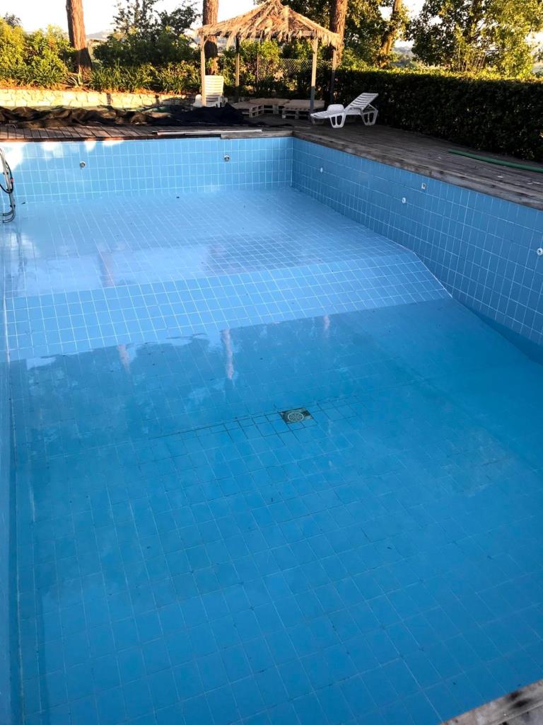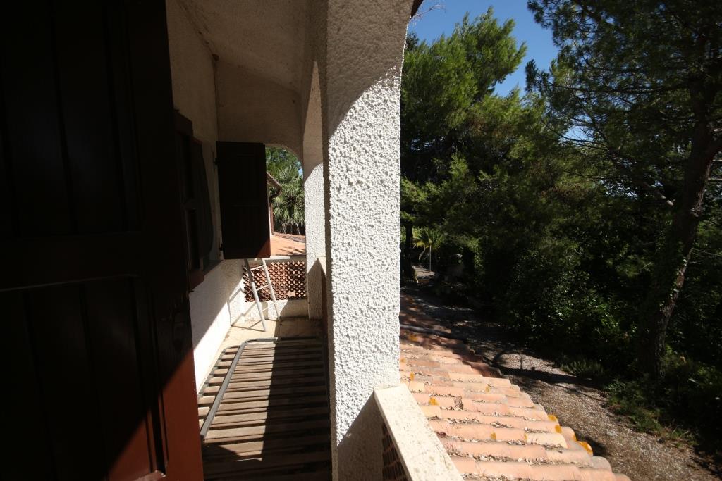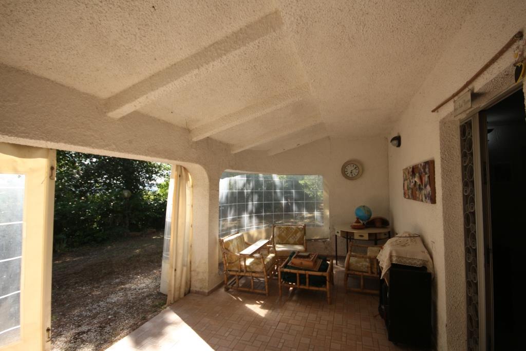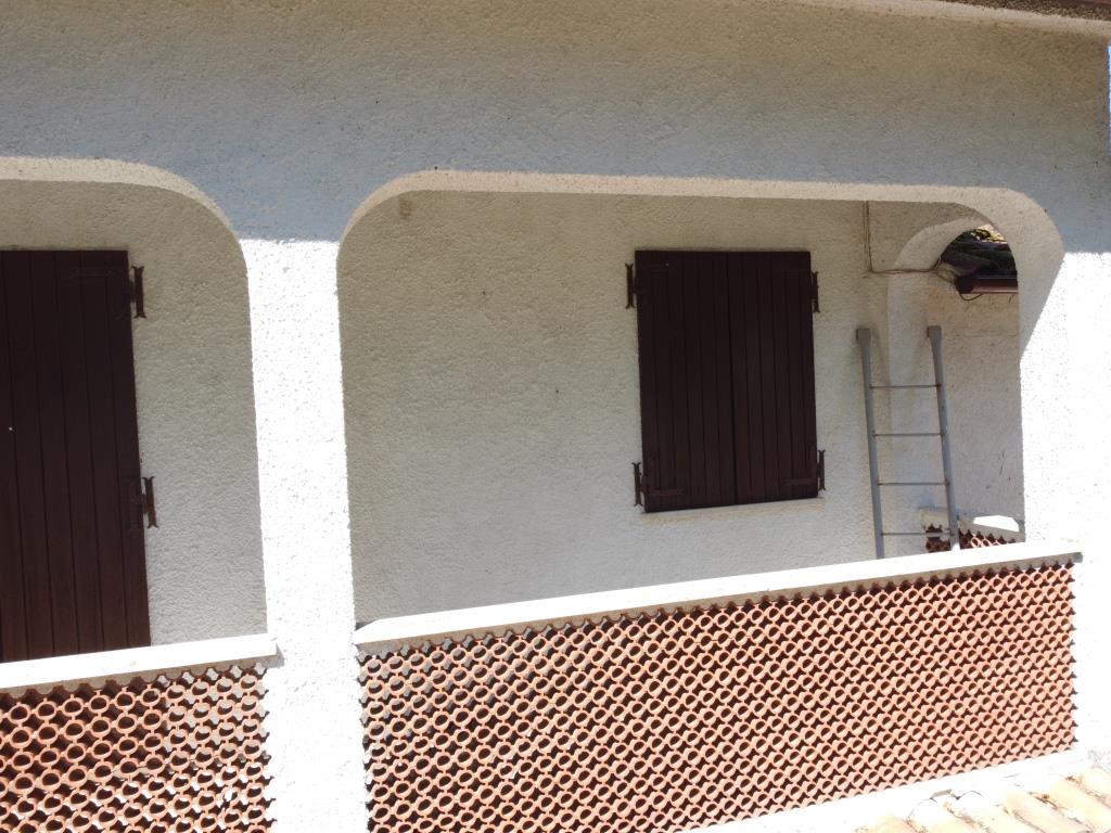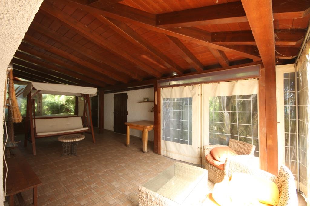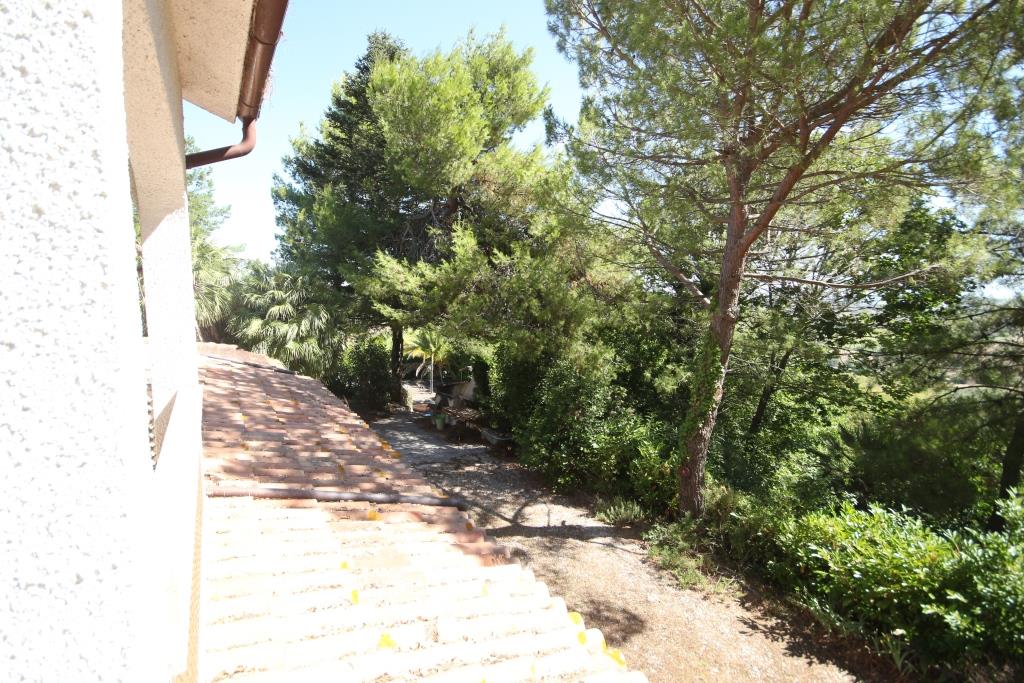 Vor dem Haus befindet sich ein Grillplatz neben einer Tuffsteintreppe, die zum unteren Pool führt; um den Pool herum befindet sich eine Sonnenterrasse mit Holzbelag, der renoviert oder komplett erneuert werden muss, und an der Sonnenterrasse liegt der Technikraum (9 m²). Außerdem gibt es einen 17 m² großen Schuppen für die Lagerung von Gartengeräten.