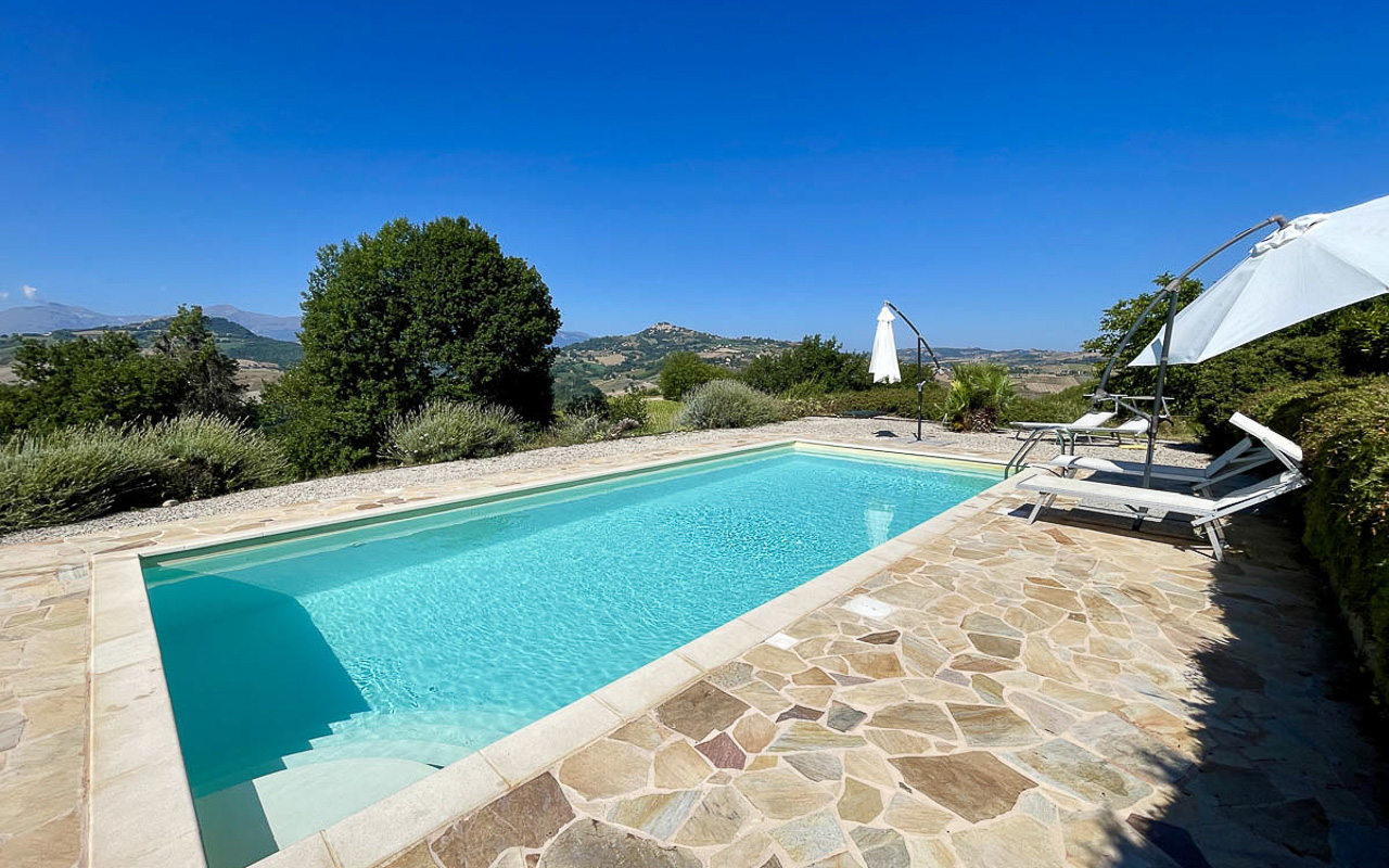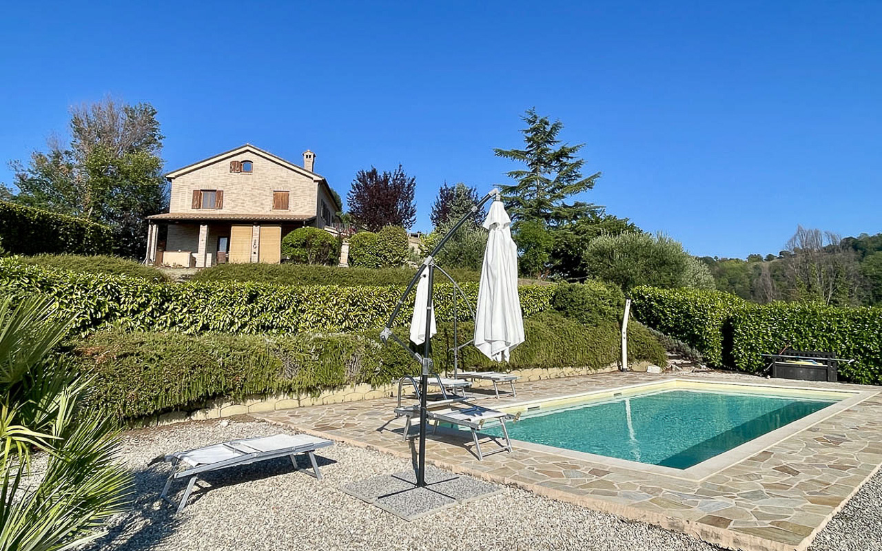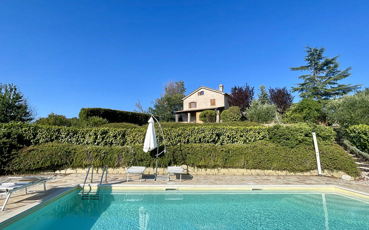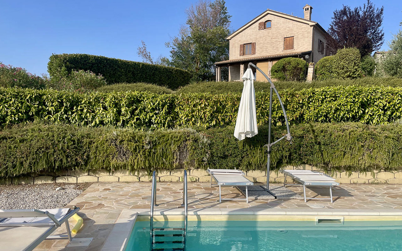The property is sold partially furnished and represents a rare opportunity to enjoy a private home with expansive gardens, pool, and panoramic views in the heart of Le Marche.