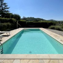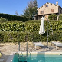 Beautifully restored traditional stone farmhouse for sale just minutes from Penna San Giovanni, set in a peaceful elevated position with stunning panoramic views over the rolling hills of Le Marche. The property features a spacious garden, private swimming pool, and elegant interiors that blend rustic charm with modern comforts, making it ideal as a family home, holiday retreat, or investment property.