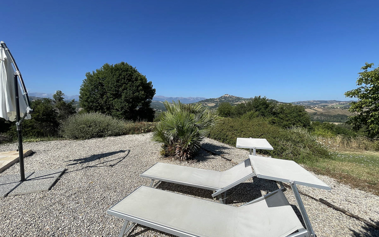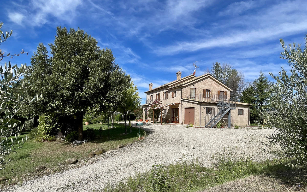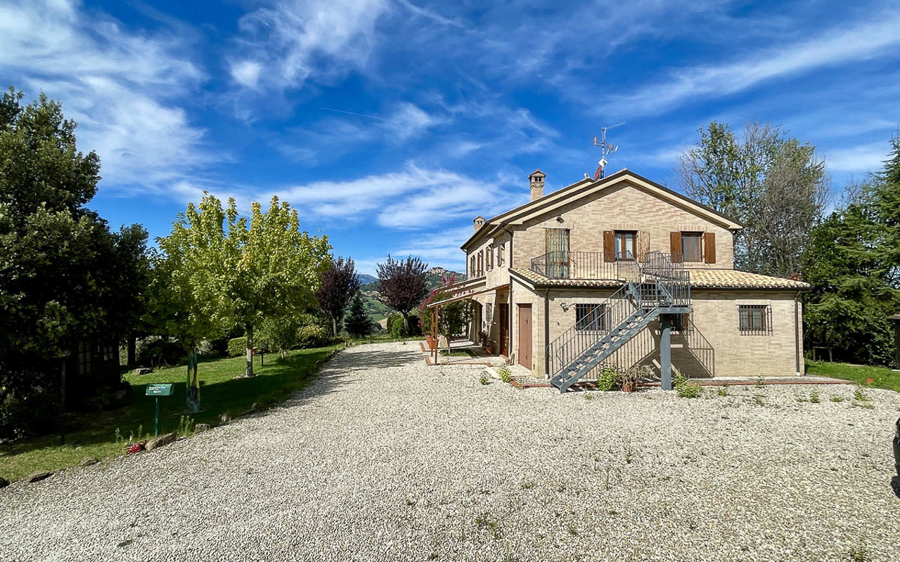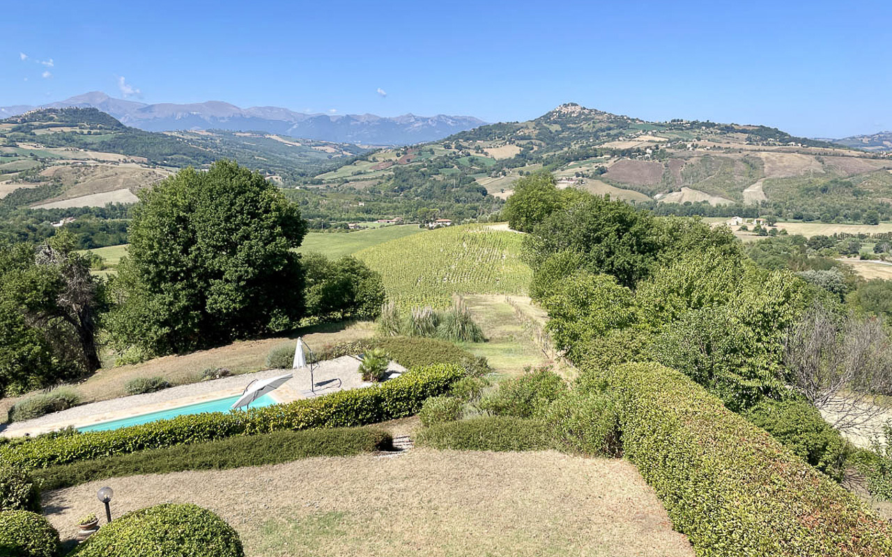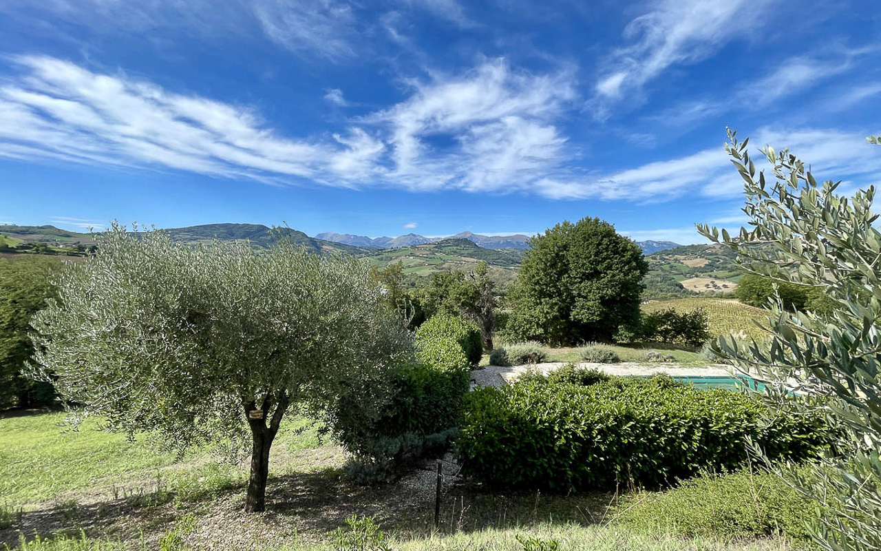 Positioned in a dominant location, the property enjoys breathtaking open views. To the south, the landscape unfolds across rolling hills dotted with historic hilltop villages, fields, and woods, with the majestic Sibillini Mountains forming a dramatic backdrop. To the north, the gentle slope of the hill provides natural protection from winter winds.