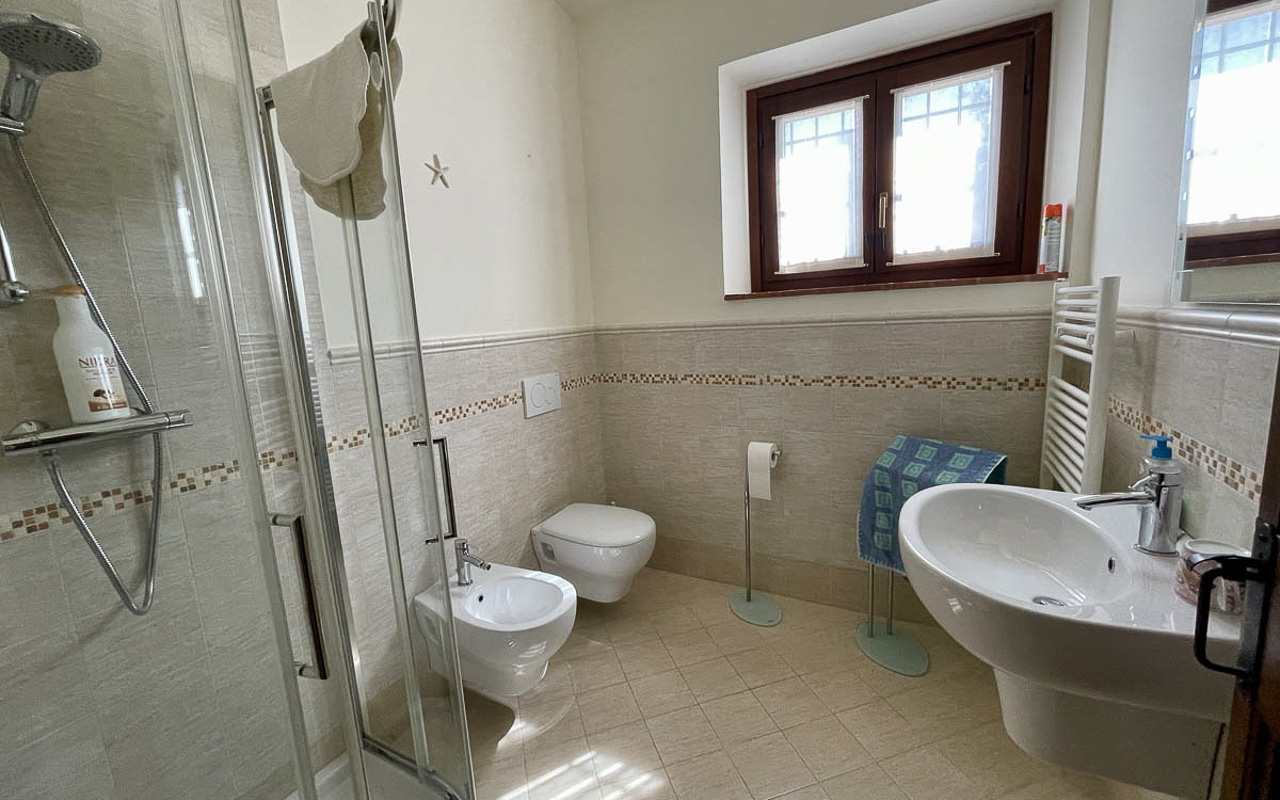Ground Floor: A large entrance hall with thermo fireplaces leads to the spacious kitchen-dining room with panoramic windows opening onto the porch. A second living area can serve as a study or TV room, alongside a bathroom with dressing room, a well-equipped back kitchen, and a second bathroom with dressing room. The external porch acts as a pleasant outdoor living area, complete with a sink.