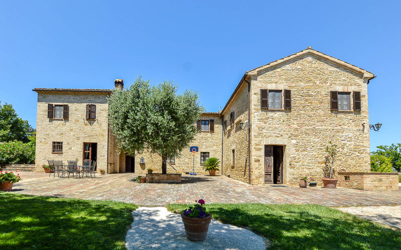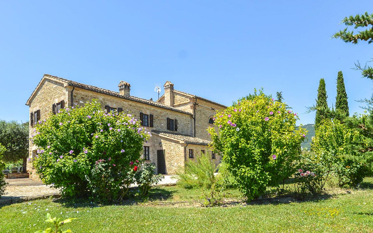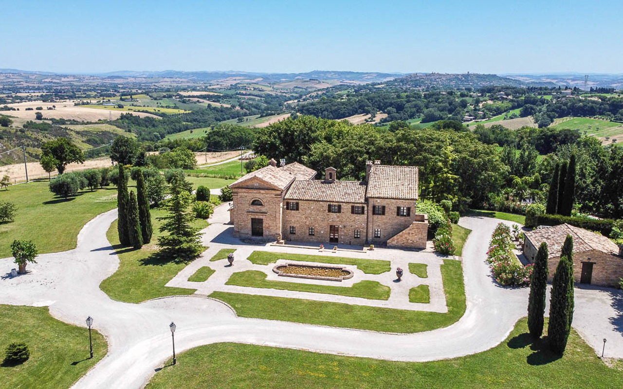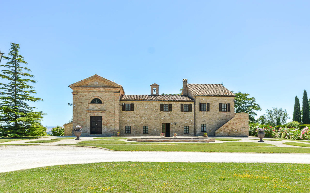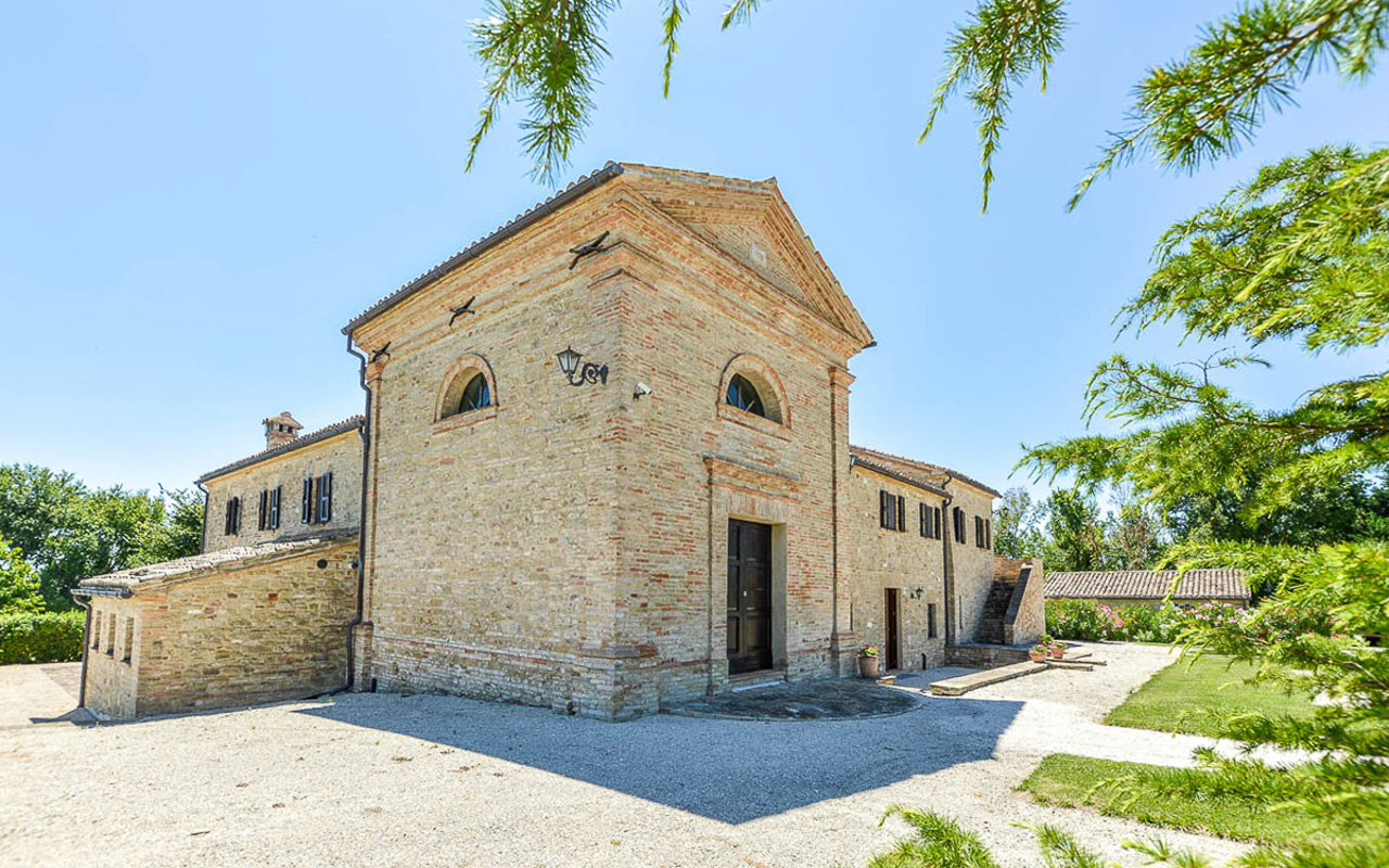 Villa Quintessa is a classic stone villa for sale with annex guest-house, large garden, swimming pool and agricultural land in Le Marche. Just a few minutes walk from the historic center of Sant’Angelo in Pontano in the province of Macerata, nestled in one of the most beautiful areas of the Marche Region between the sea and the mountains, a splendid property consisting of a large villa with annex, lush garden with swimming pool and appurtenant agricultural land of over 36,000 square meters.