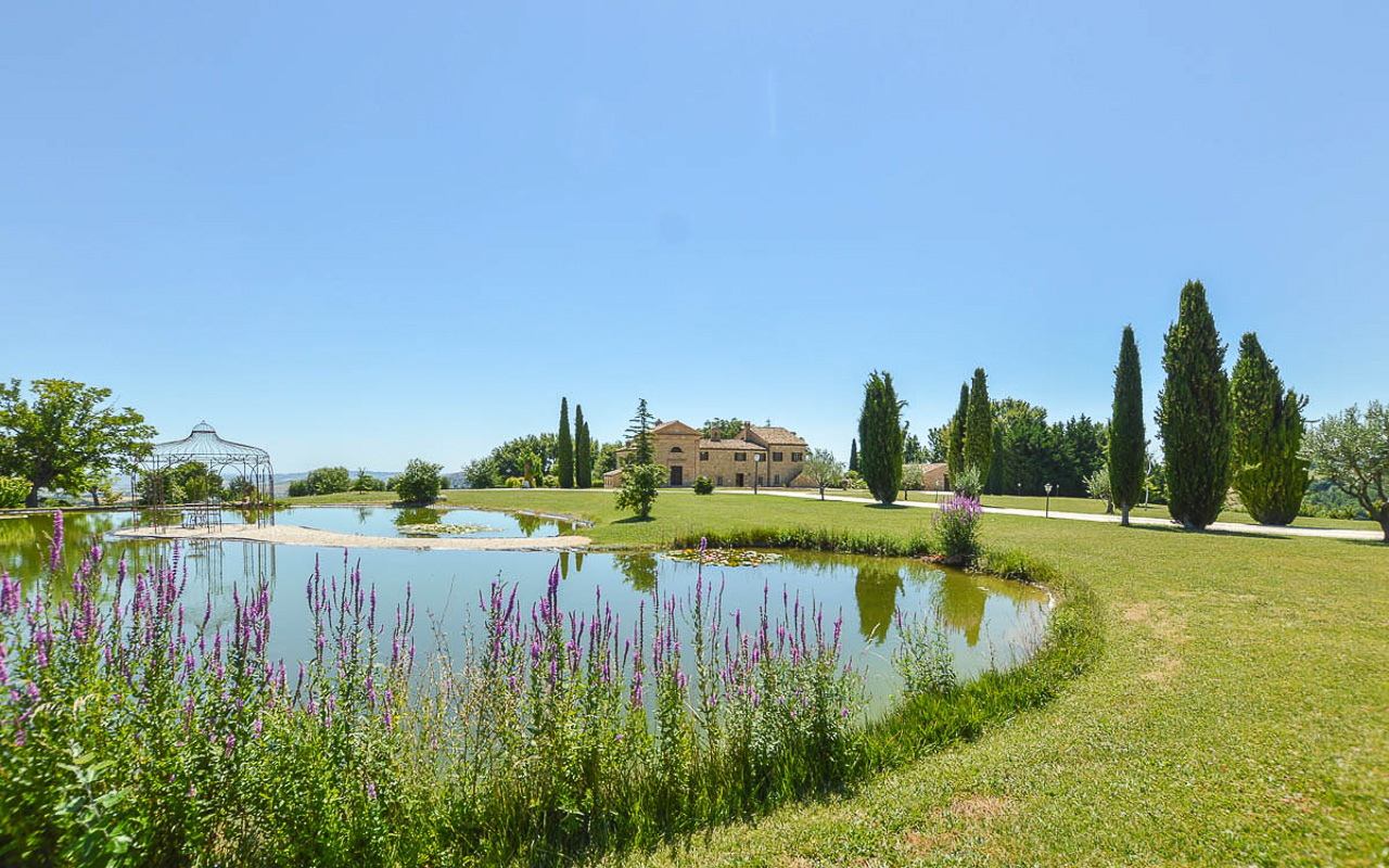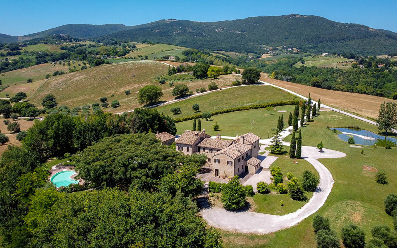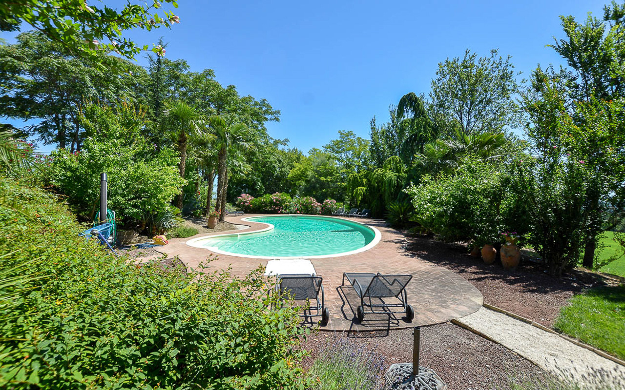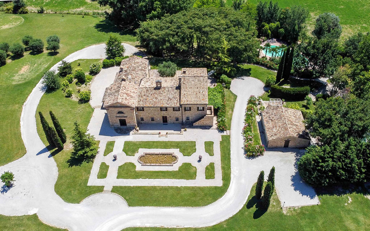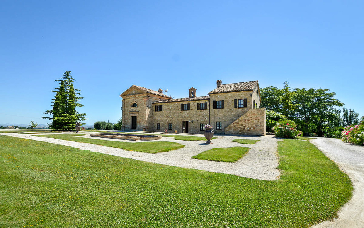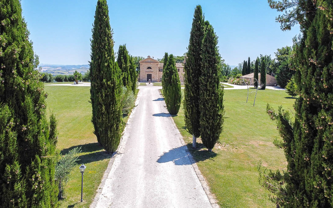 Villa Quintessa is a classic stone villa for sale with annex guest-house, large garden, swimming pool and agricultural land in Le Marche. Just a few minutes walk from the historic center of Sant’Angelo in Pontano in the province of Macerata, nestled in one of the most beautiful areas of the Marche Region between the sea and the mountains, a splendid property consisting of a large villa with annex, lush garden with swimming pool and appurtenant agricultural land of over 36,000 square meters.