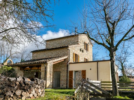 Casa Paolina is a private, energy-efficient countryside home with stunning views of the Monti Sibillini, set on 7 hectares of land bordering the Tennacola river. Built in 2005, it combines traditional brick-and-stone architecture with bright modern interiors, renewable energy systems, and strong earthquake resistance, while also offering woodland, outbuildings, and a registered ruin with reconstruction potential.