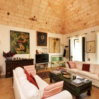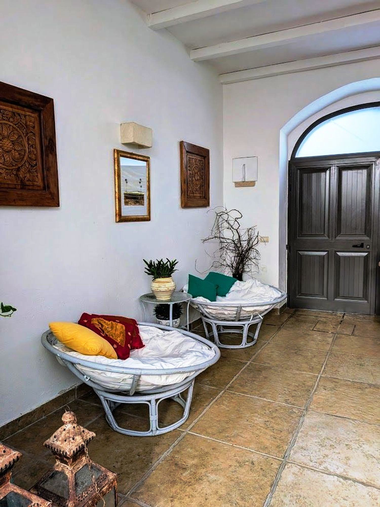 Ein altes, gewölbtes Atrium führt zu einem Patio mit einem freiliegenden Gewölbe aus lokalem Carparo-Stein, der eine frische und authentische Atmosphäre verströmt und einst vielleicht als Stall für Kutschen und Pferde diente. Links vom ehemaligen Stall befindet sich ein separates Nebengebäude. Wenige Schritte entfernt betritt man das Haupthaus mit einem großen Wohnzimmer, das mit wunderschönen antiken Gewölben aus lokalem Carparo-Stein, zwei zu einem gemütlichen Arbeitszimmer umgebauten Nischen und einem kleinen Raum, der als Bibliothek und Ruhezone dient, besticht. Ein antiker Kamin dominiert das Wohnzimmer. Ebenfalls im Erdgeschoss befinden sich ein geräumiges Schlafzimmer mit begehbarem Kleiderschrank und Badezimmer. Ein antiker Steinkeller bietet Platz für edle Weine. Das Erdgeschoss verfügt über eine voll ausgestattete Küche mit Zugang zu einem wunderschönen, ca. 90 m² großen Orangenhain – ideal, um an heißen Sommertagen die kühle Brise zu genießen oder gemütliche Abendessen mit Freunden und Familie zu verbringen. Im ersten Stock befinden sich zwei weitere Schlafzimmer und ein Badezimmer sowie der Zugang zu einer Terrasse mit atemberaubendem Blick auf die Dorfkirche.