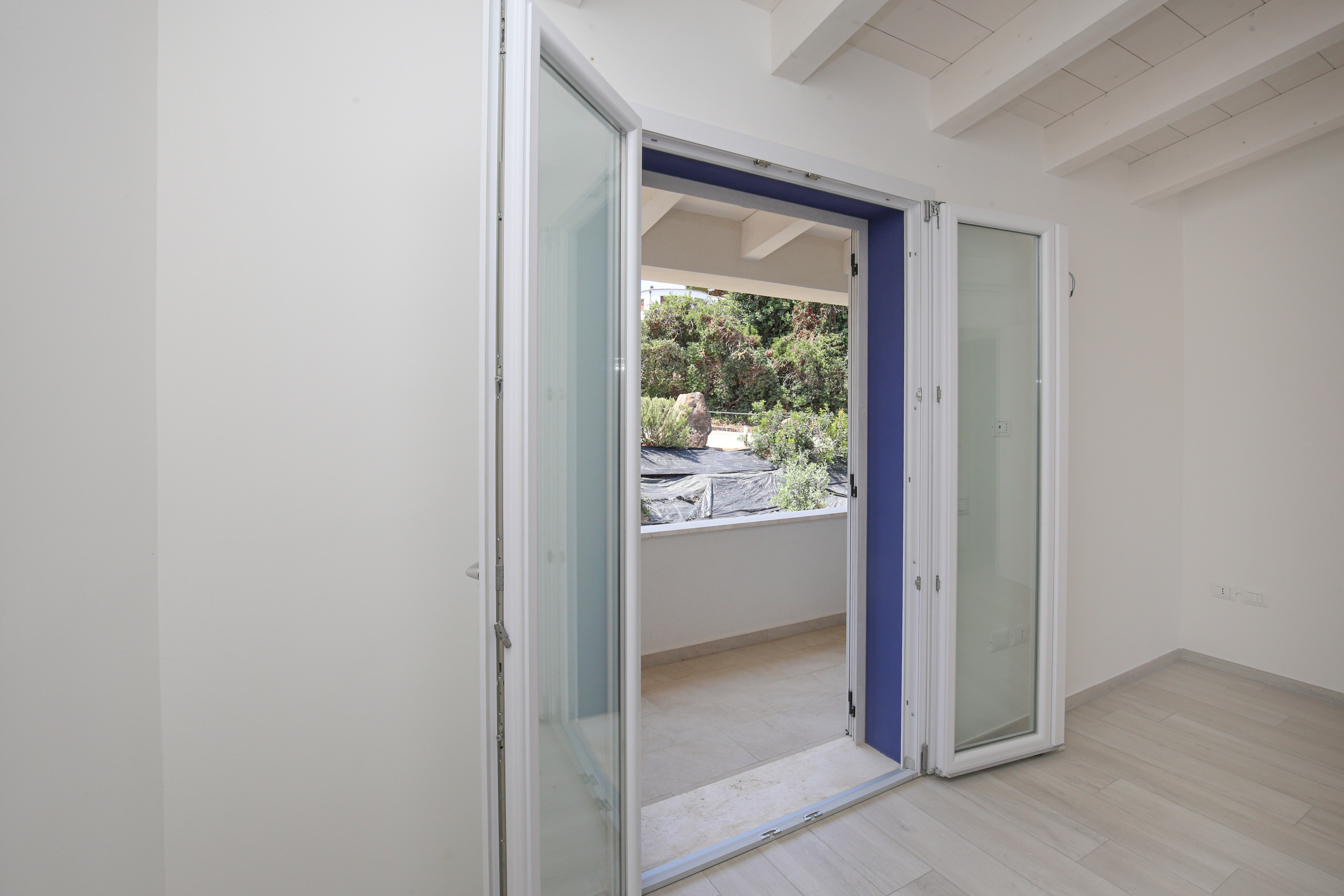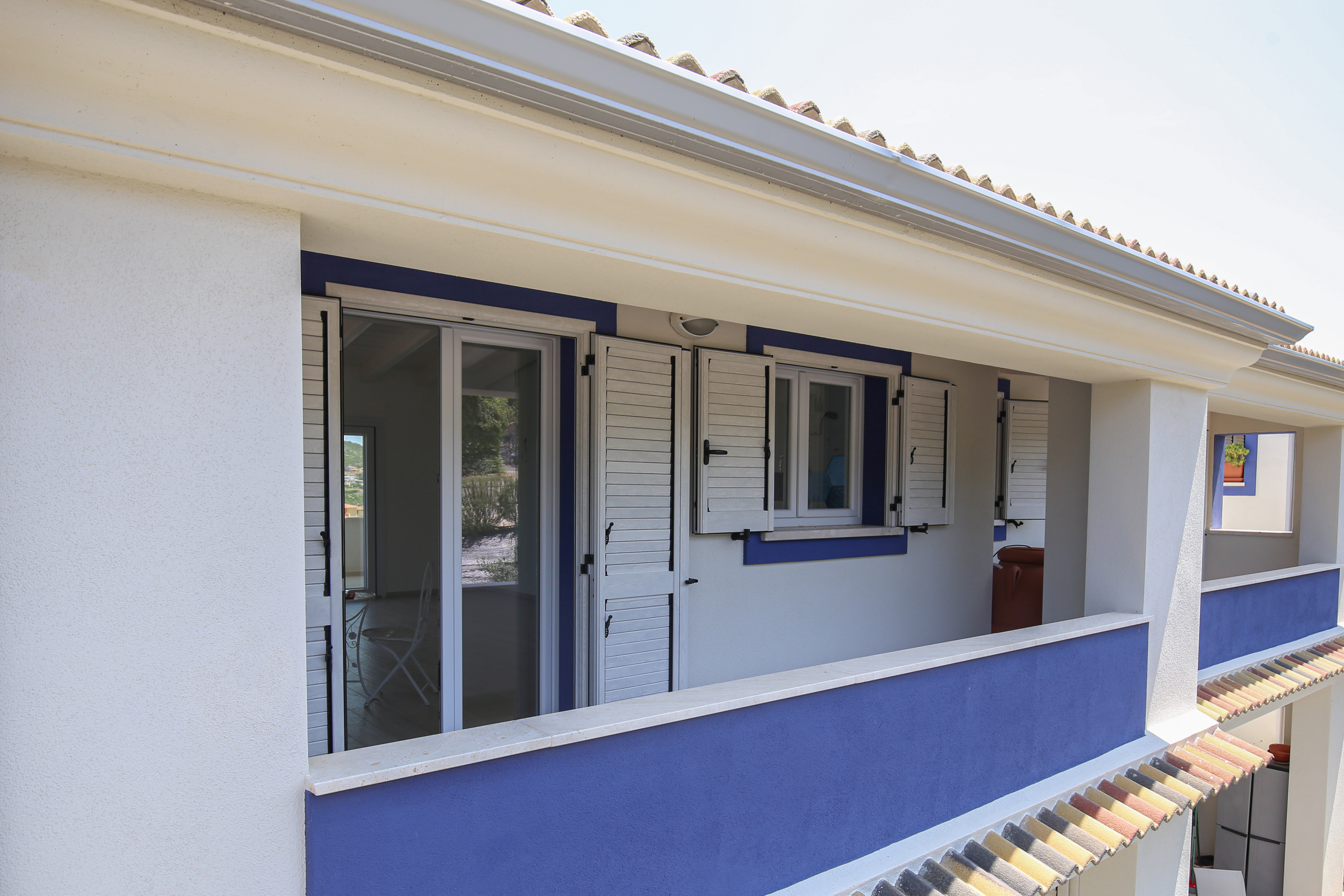 Äußere Fenster- und Türrahmen aus PVC mit Doppelverglasung mit hoher Wärmedämmung in weißer Farbe; Fensterläden mit verstellbaren Aluminiumlamellen in weißer Farbe.