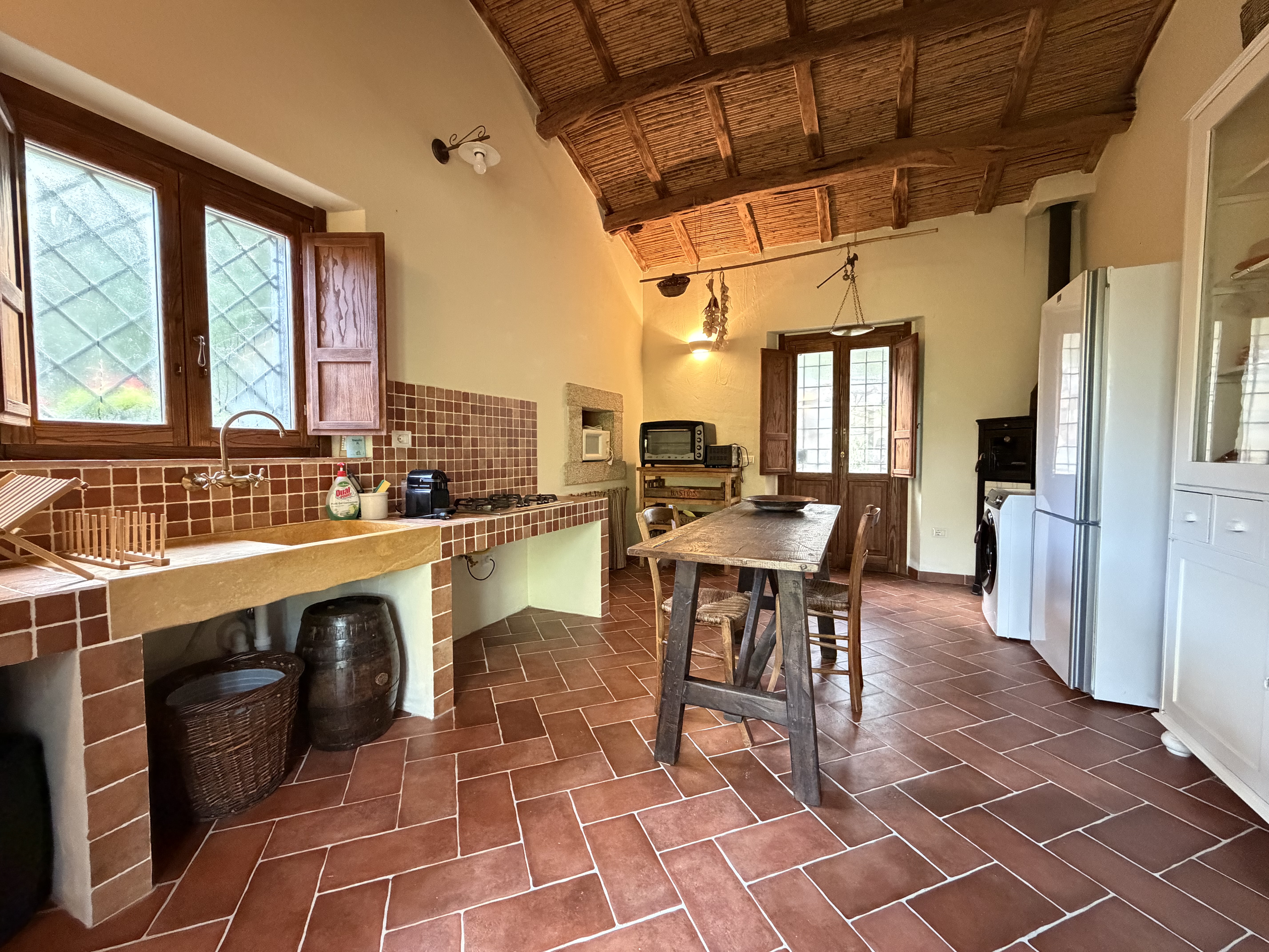Das Haus empfängt mit einer funktionalen Küche, die in ein großzügiges Wohnzimmer mit Kamin führt – dem gemütlichen Mittelpunkt der Immobilie.