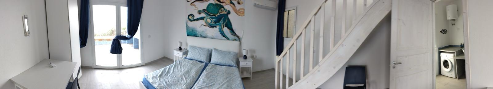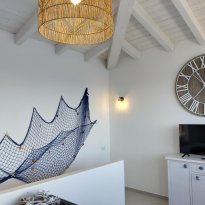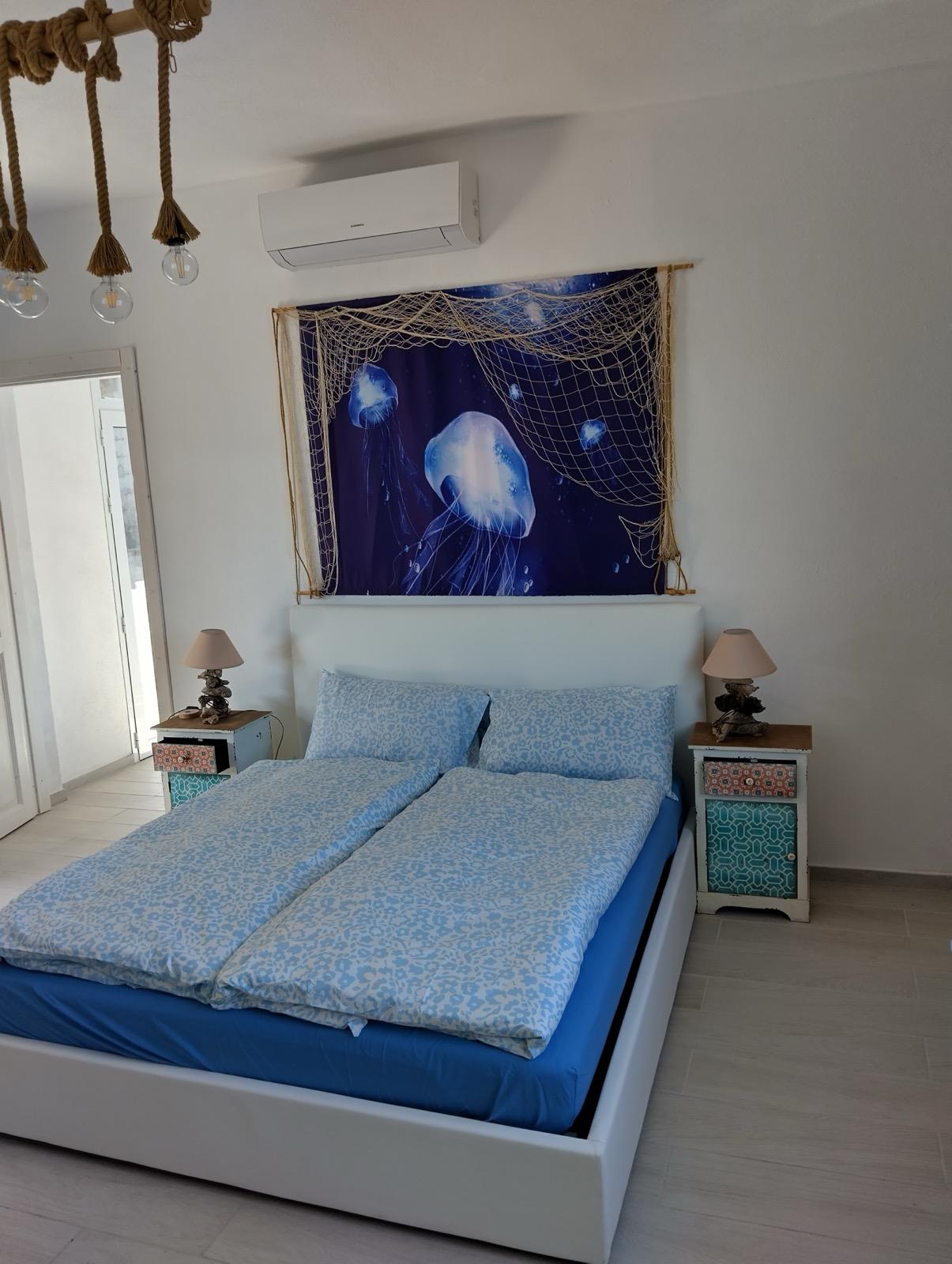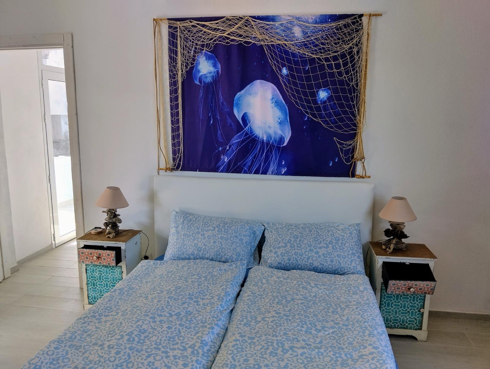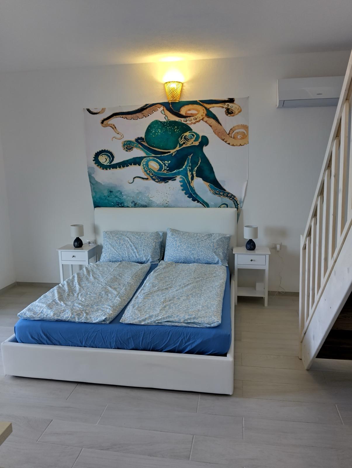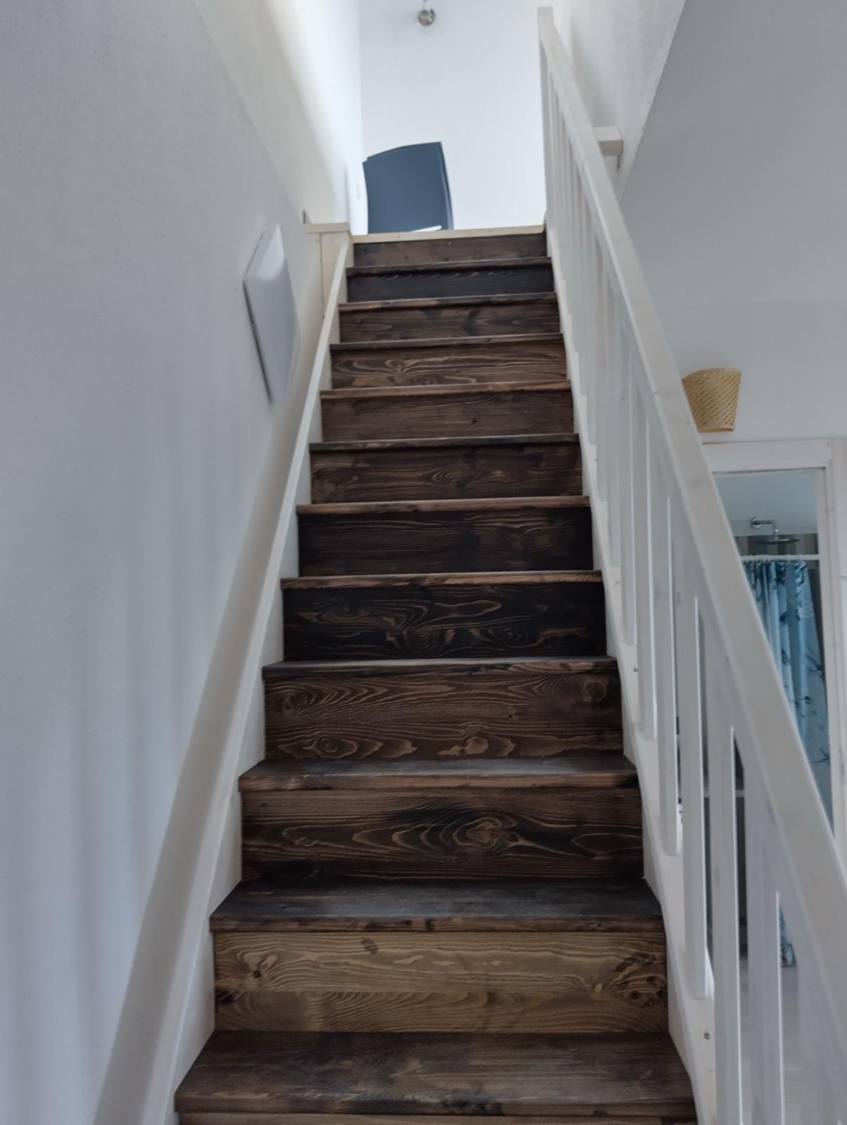 Die Schlafetage erstreckt sich über zwei Ebenen und bietet Komfort und Privatsphäre. Mit zwei geräumigen Doppelschlafzimmern und einem zusätzlichen Zimmer mit Etagenbetten ist diese Wohnung ideal für Familien und Gäste. Die neutralen Farben und die minimalistische Einrichtung verstärken das Gefühl von Ruhe und Verbundenheit mit der Natur.