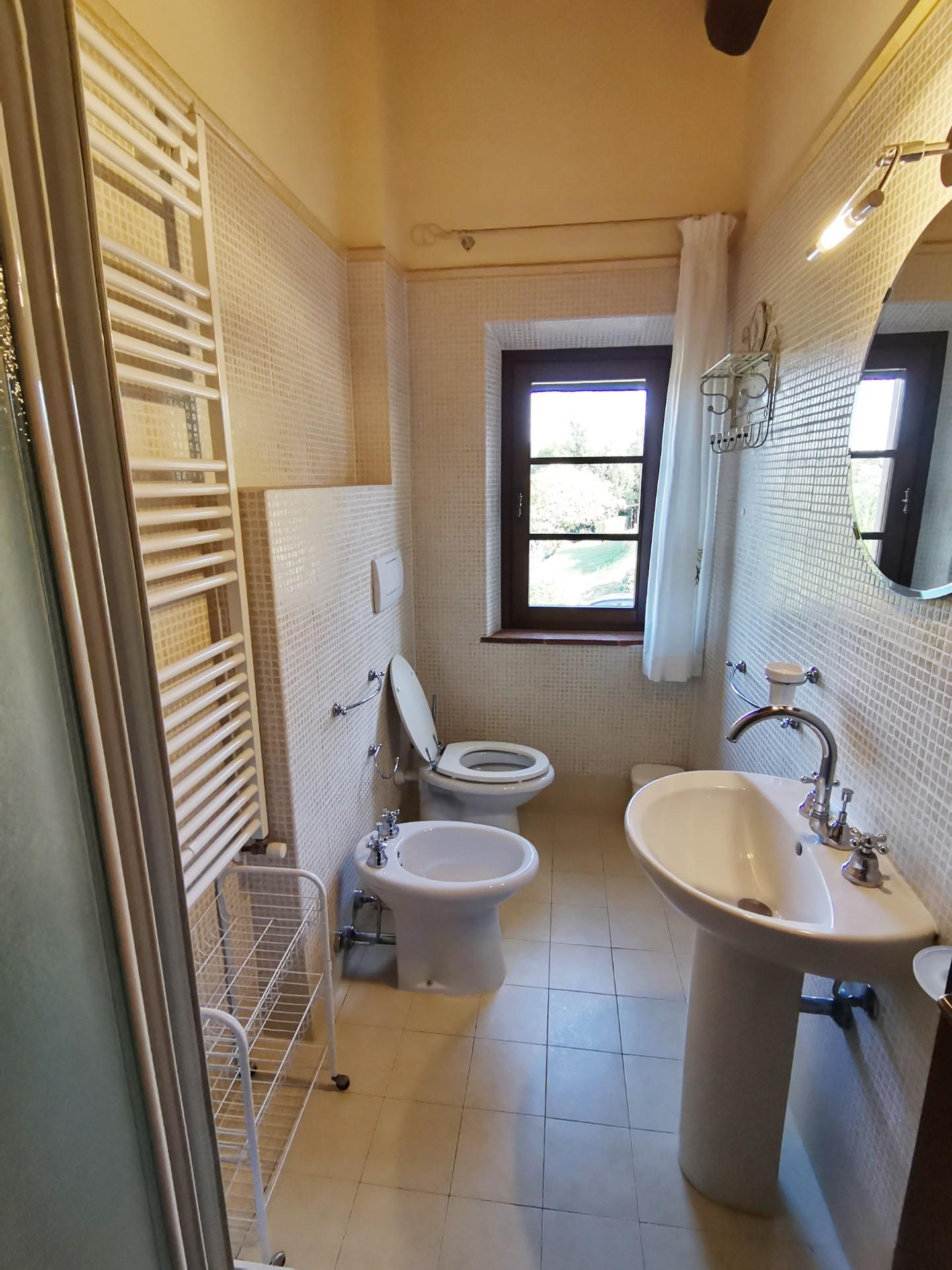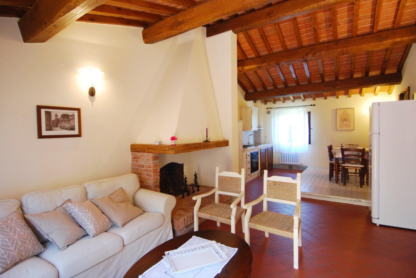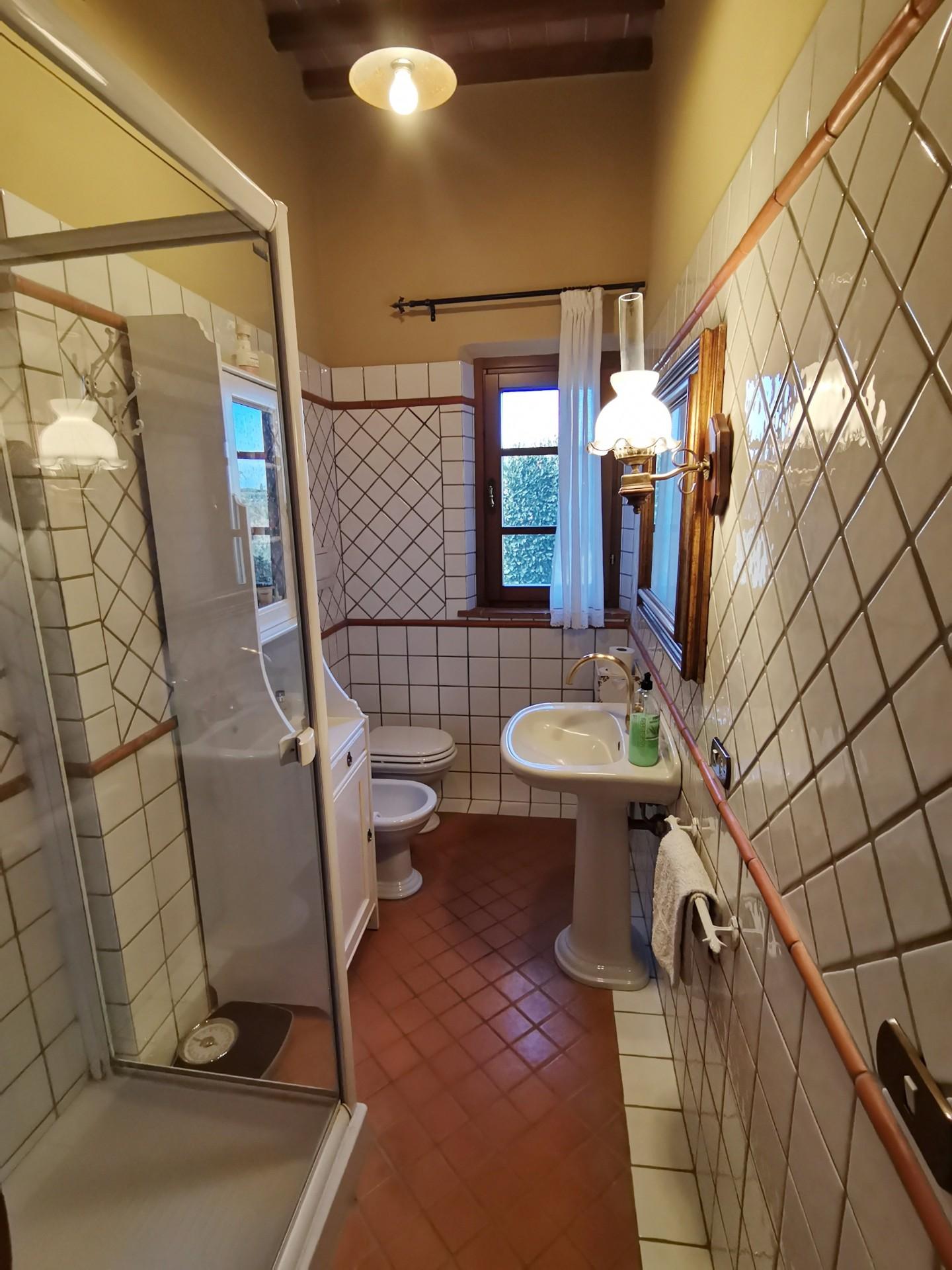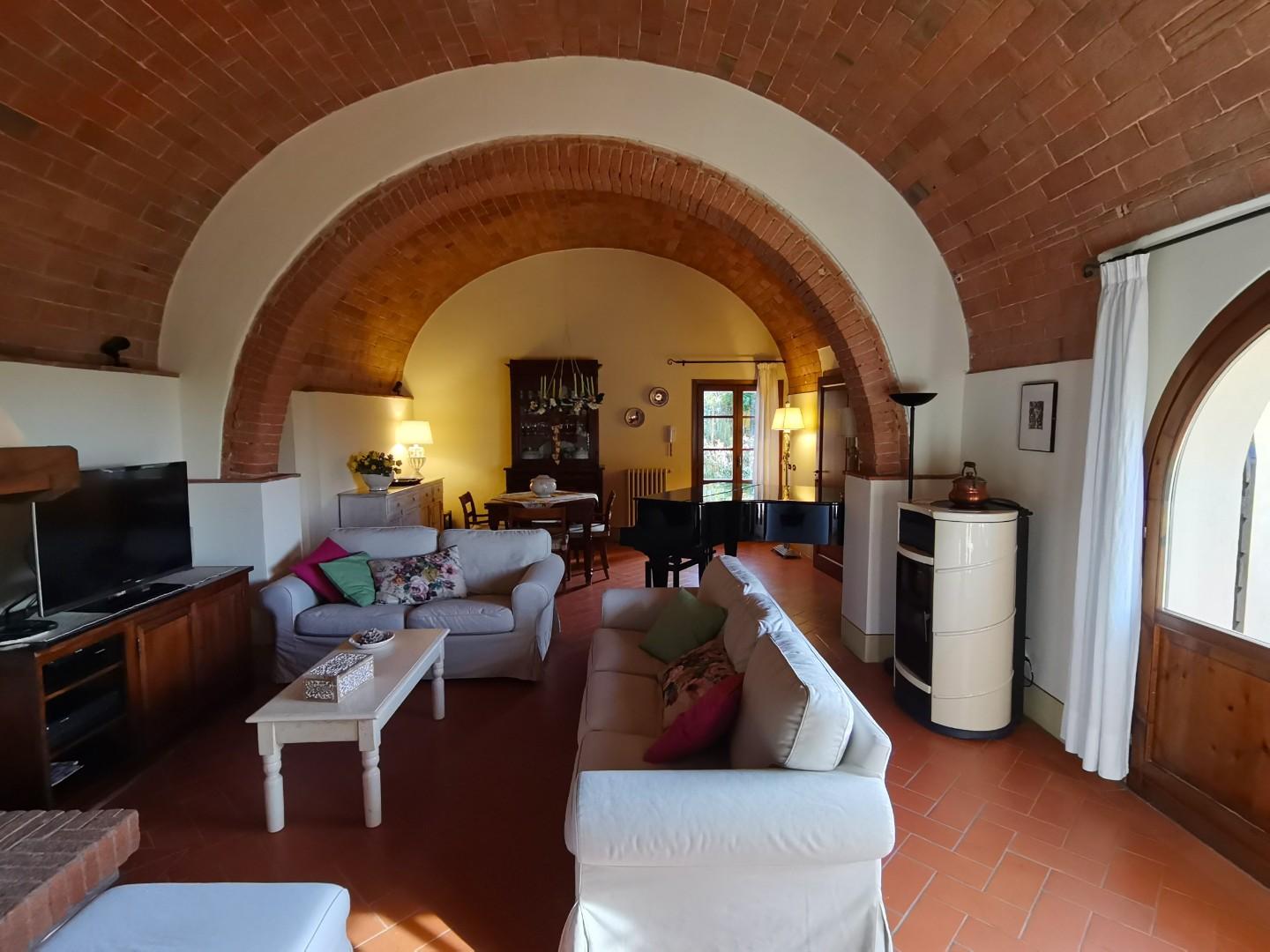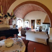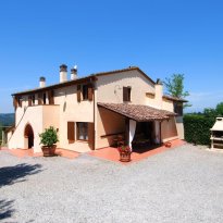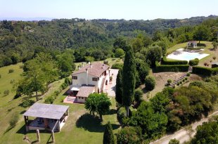 Dieses schöne toskanische „Casale” befindet sich in einer wunderschönen, ruhigen Lage mit Panoramablick. Es wurde 2007 sorgfältig im typisch toskanischen Stil mit Holzbalkendecken, „travi e travicelli e mezzane” und Terrakottaböden restauriert. Es steht auf einem ca. 5 Hektar großen Grundstück mit etwa 180 Oliven- und Obstbäumen und ist vollständig umzäunt. Das Bauernhaus besteht im Erdgeschoss aus einem Eingang über eine überdachte Loggia, einem geräumigen Wohnzimmer von 41 m² mit Kamin und Zugang zur Terrasse, einer Küche mit Kamin, zwei Doppelzimmern, einem Badezimmer, einem Abstellraum, einer Waschküche und einem Technikraum. Das Obergeschoss, das sowohl über eine Außentreppe als auch über einen internen Zugang erreichbar ist, besteht aus einem Wohnzimmer mit Küche und Kamin, vier Schlafzimmern, drei Badezimmern und einer kleinen Terrasse. Auf dem Hügel neben dem Haus, in Panoramalage, wurde 2003 ein 12,00 x 6,00 Meter großer Swimmingpool angelegt.