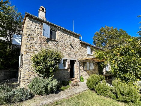 Beautifully restored stone house for sale between Montefalcone Appennino and Santa Vittoria in Matenano, offering stunning panoramic views, a private 2,000 m² garden, elegant interiors, and multiple outdoor terraces. Fully furnished and ready to enjoy.